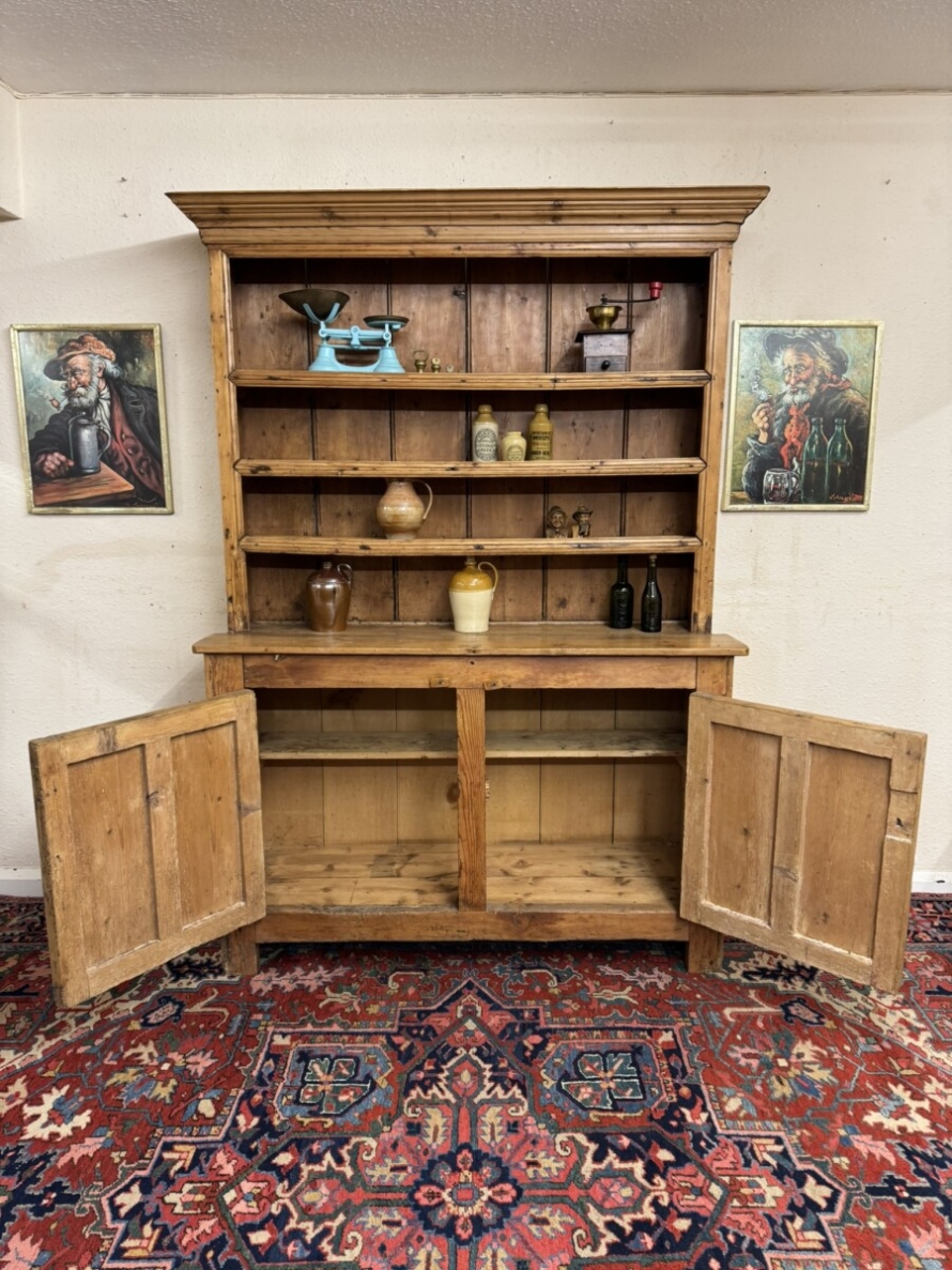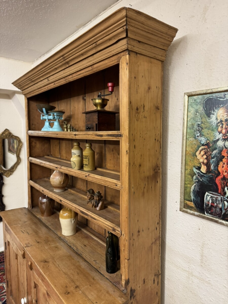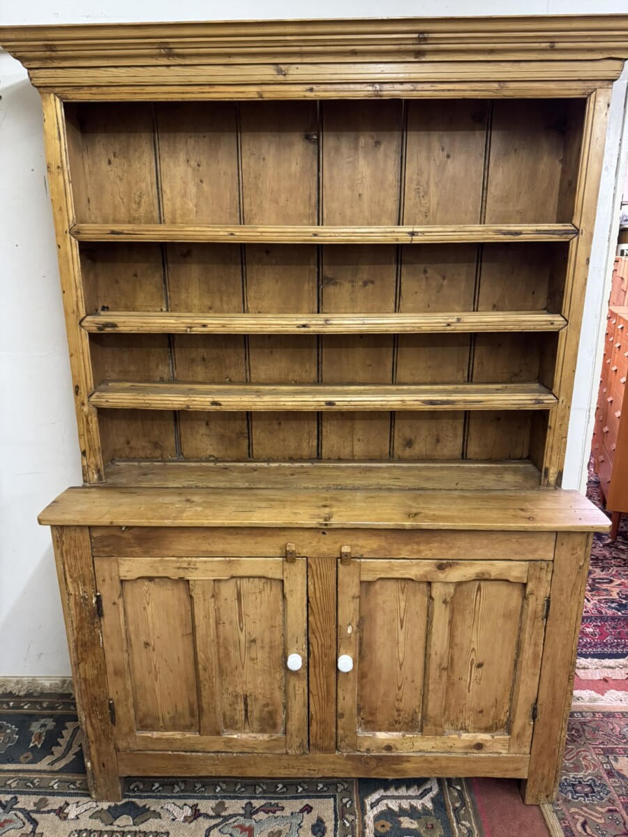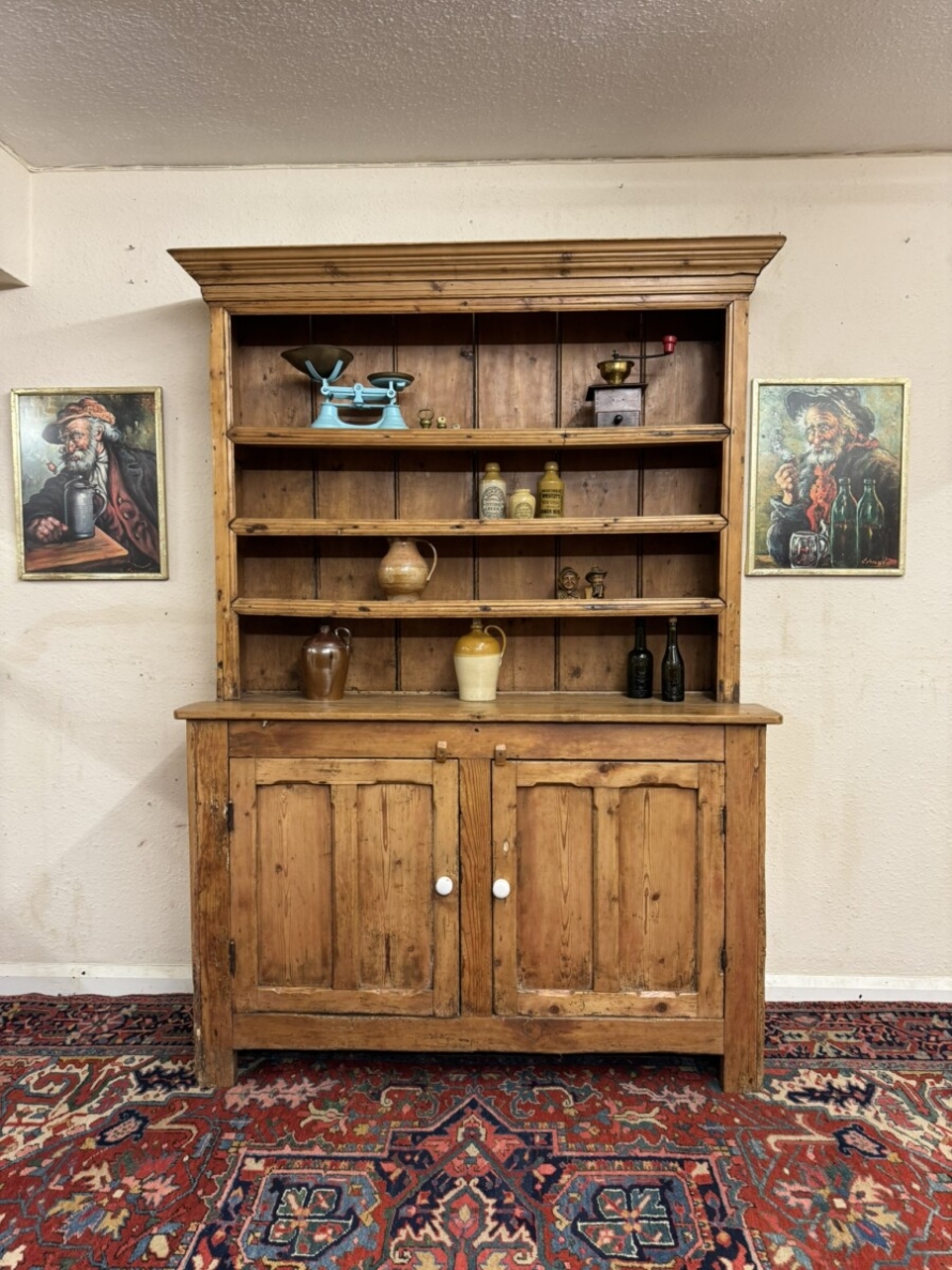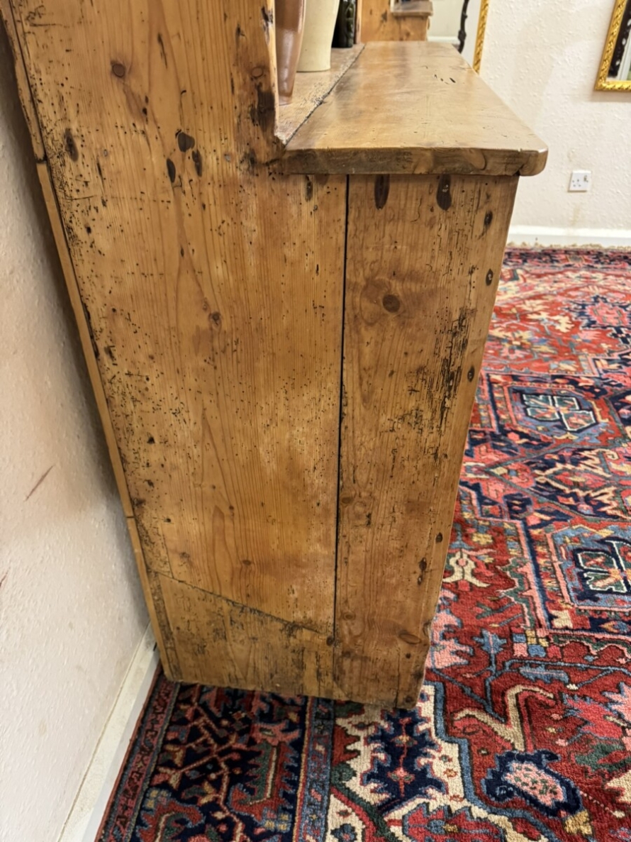 This this great rustic Irish dresser is full of character and charm. This country pine dresser dates circa 1900. This one piece dresser has a stepped cornice which sits above three open shelves with a boarded back. Below are a pair of lockable recessed panelled doors, each door having an enamel handle and wood locking latch. The doors opens to reveal a fixed shelf. This super dresser sits on traditional block feet.