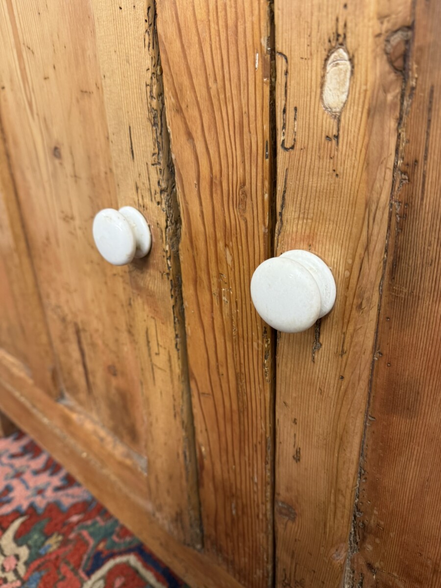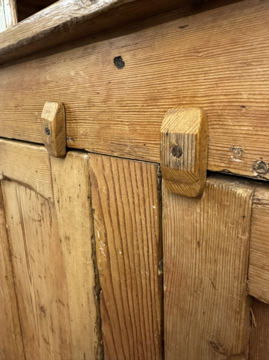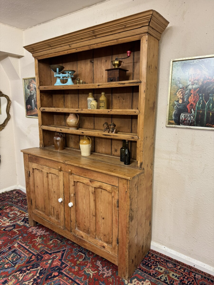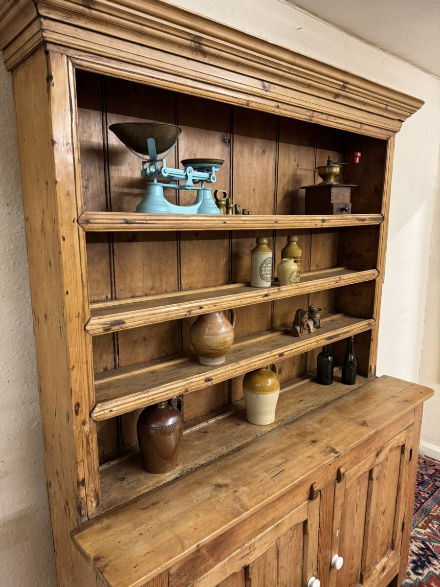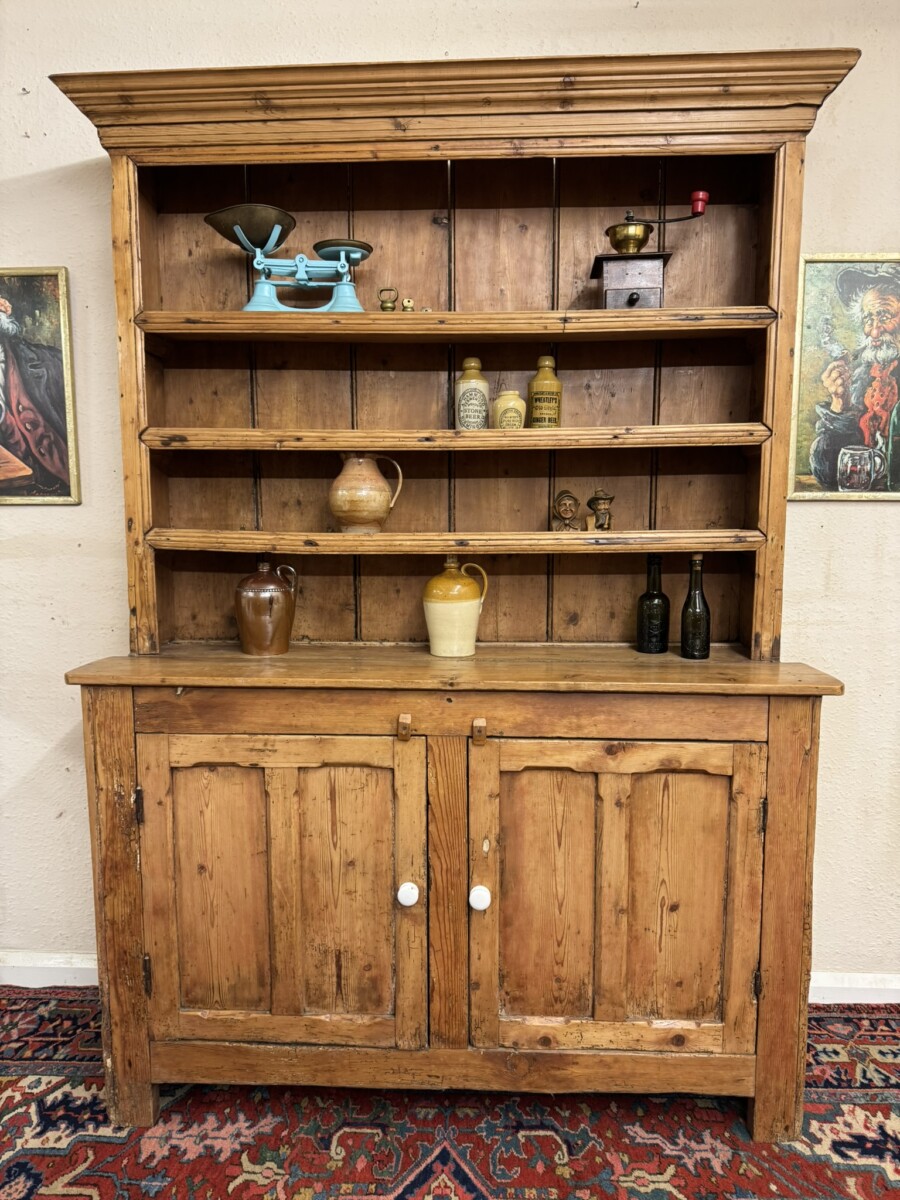This this great rustic Irish dresser is full of character and charm. This country pine dresser dates circa 1900. This one piece dresser has a stepped cornice which sits above three open shelves with a boarded back. Below are a pair of lockable recessed panelled doors, each door having an enamel handle and wood locking latch. The doors opens to reveal a fixed shelf. This super dresser sits on traditional block feet.