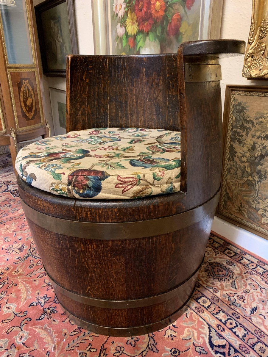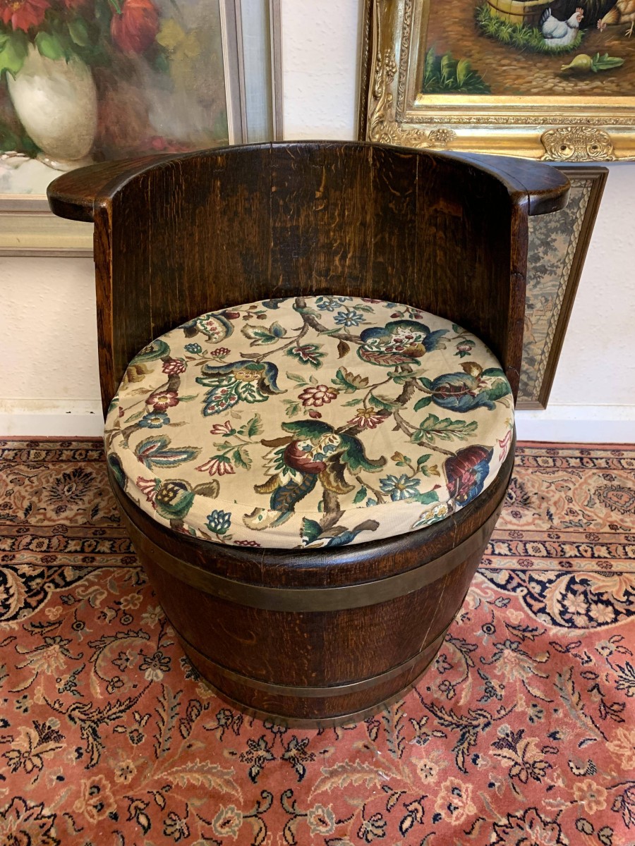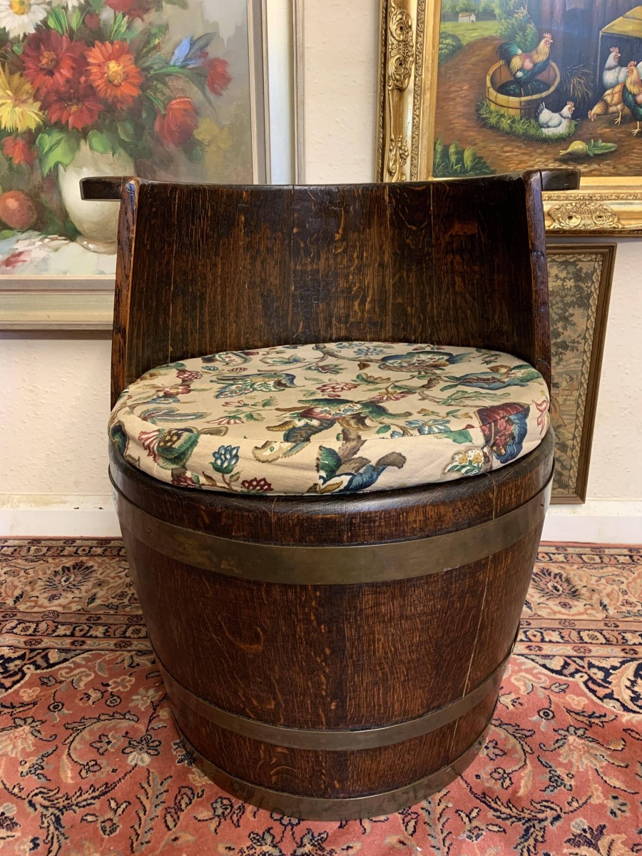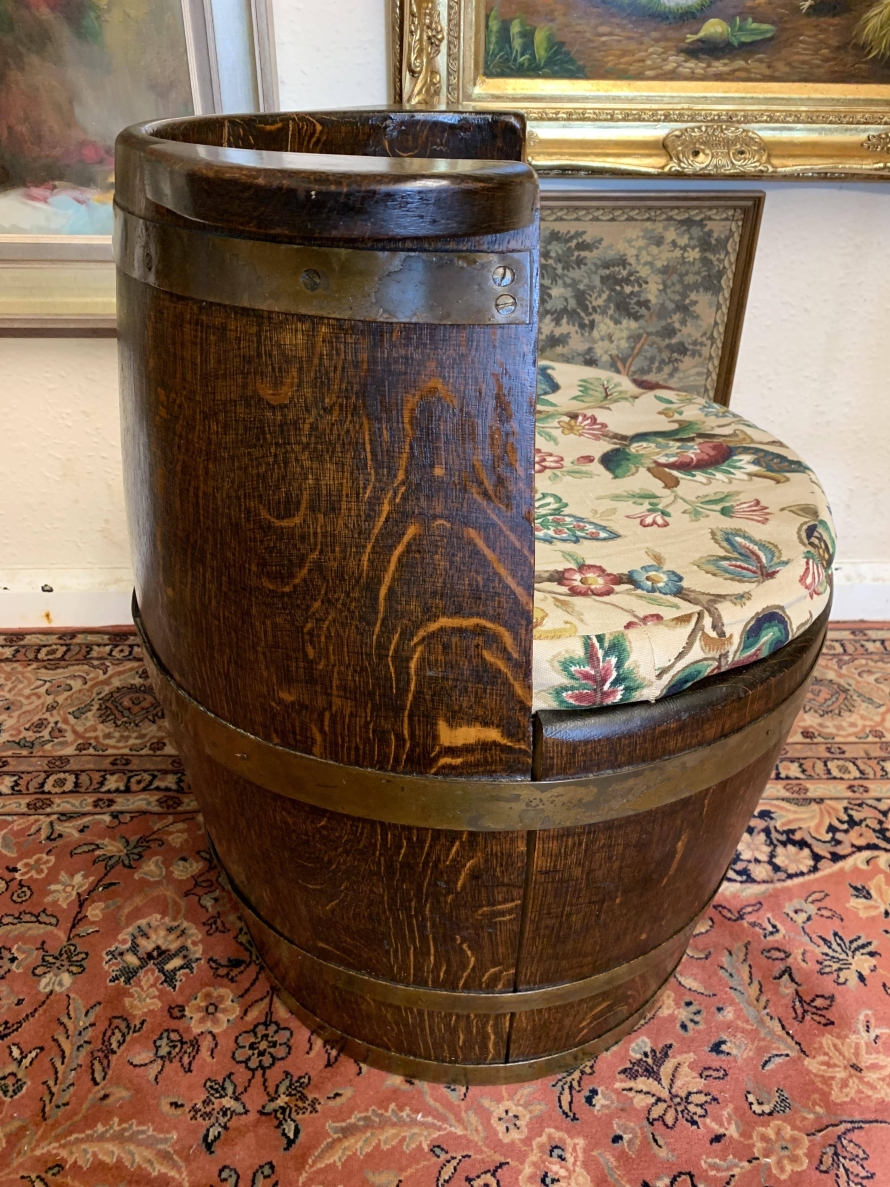 This fabulous chair dates circa 1920. Having two arms, removable seat cushion, storage beneath the lift up lid, fabulous oak which is brass bound.