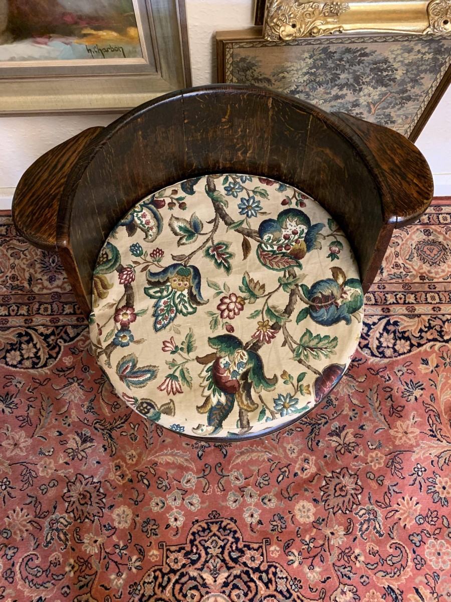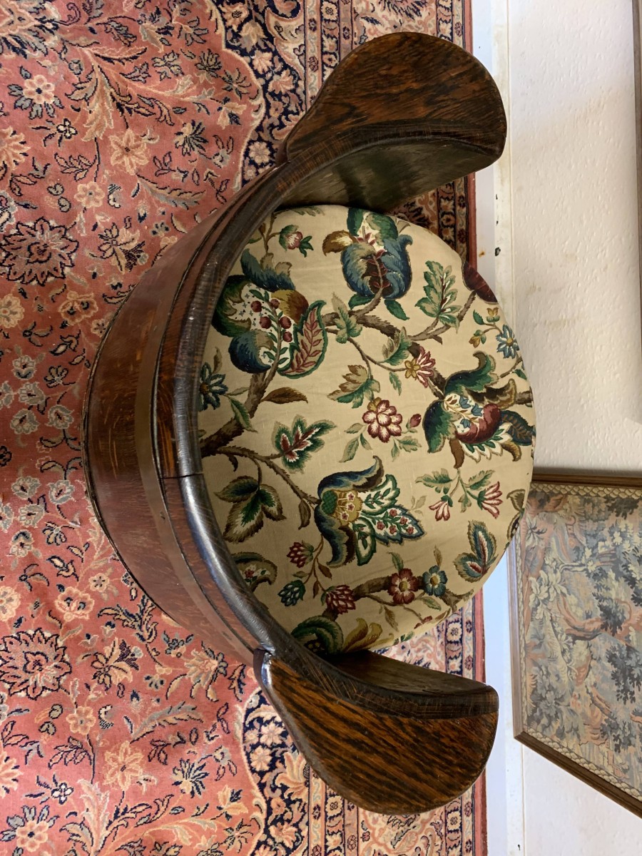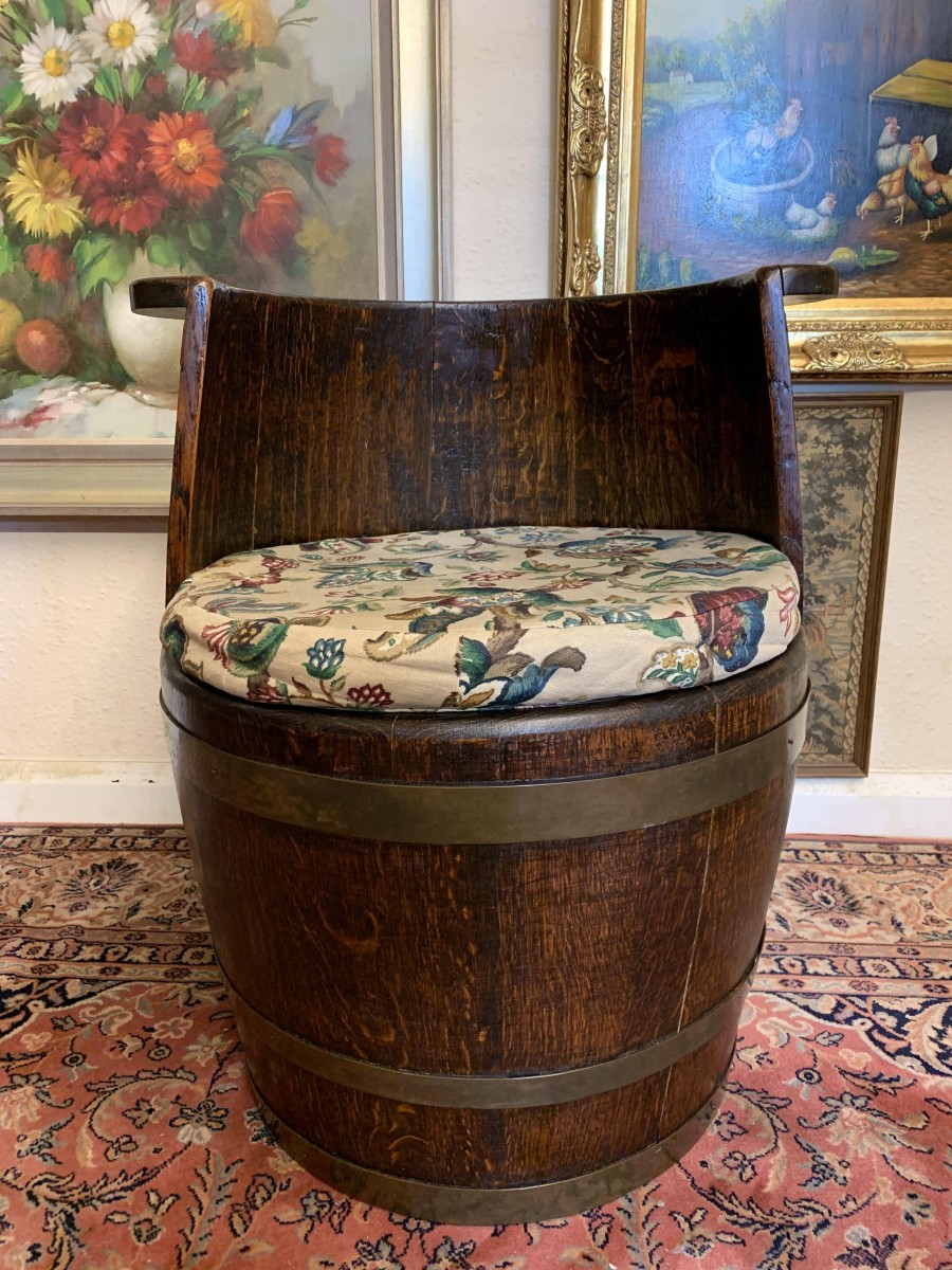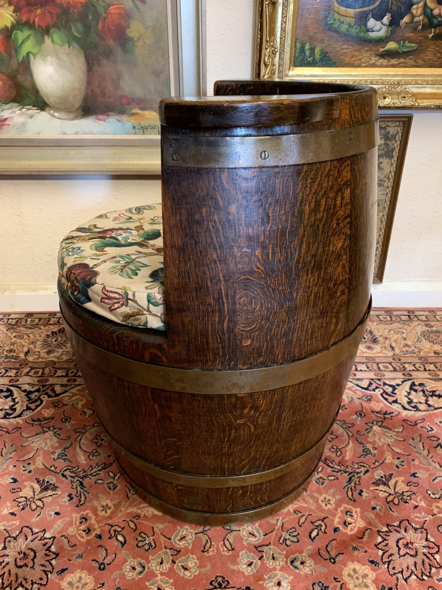 This fabulous chair dates circa 1920. Having two arms, removable seat cushion, storage beneath the lift up lid, fabulous oak which is brass bound.