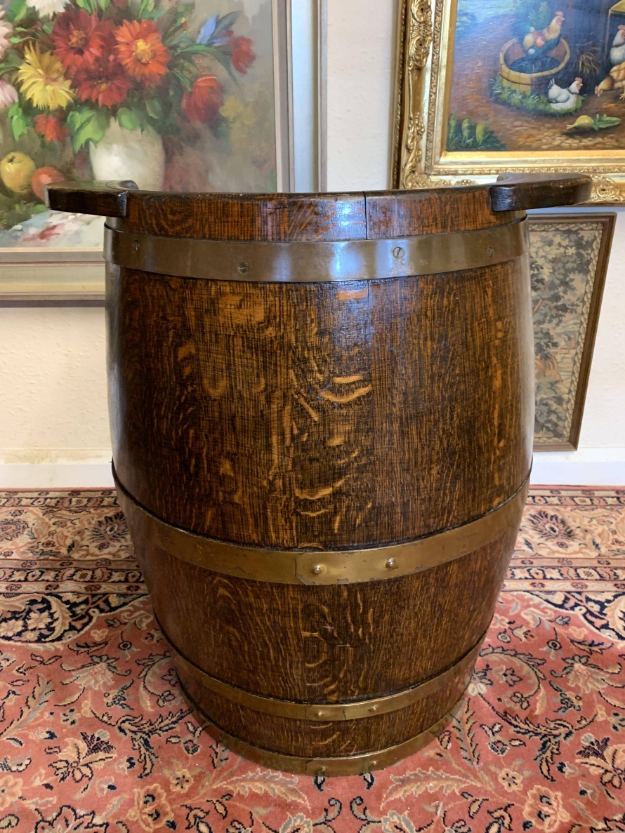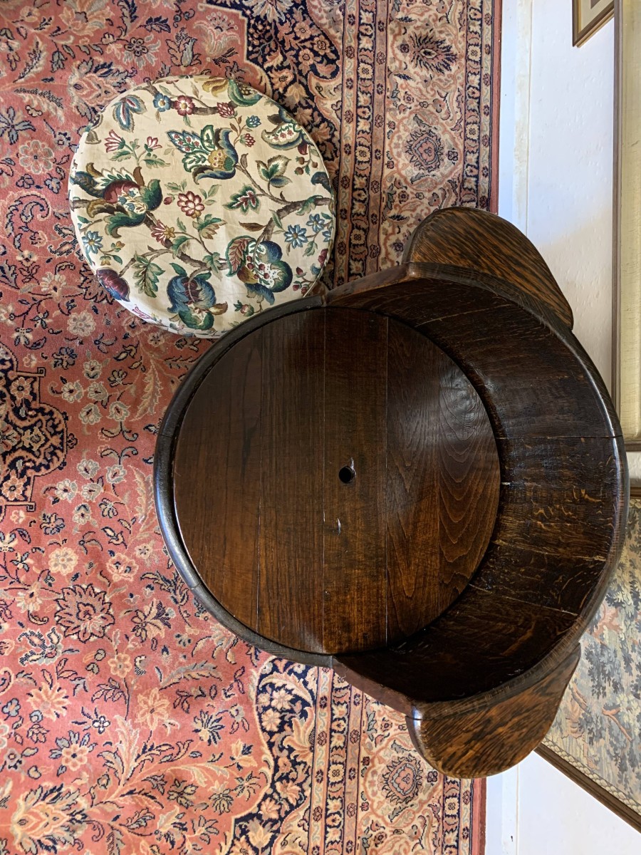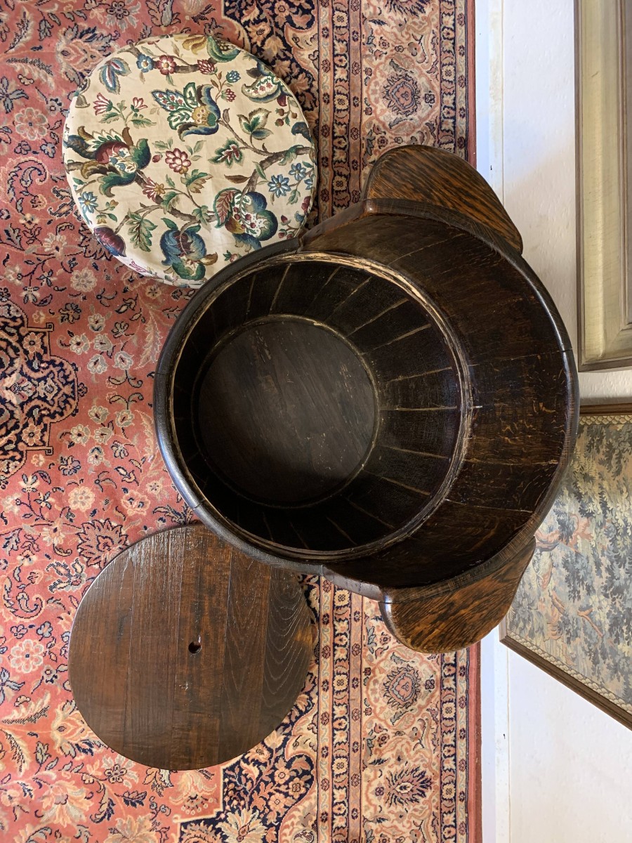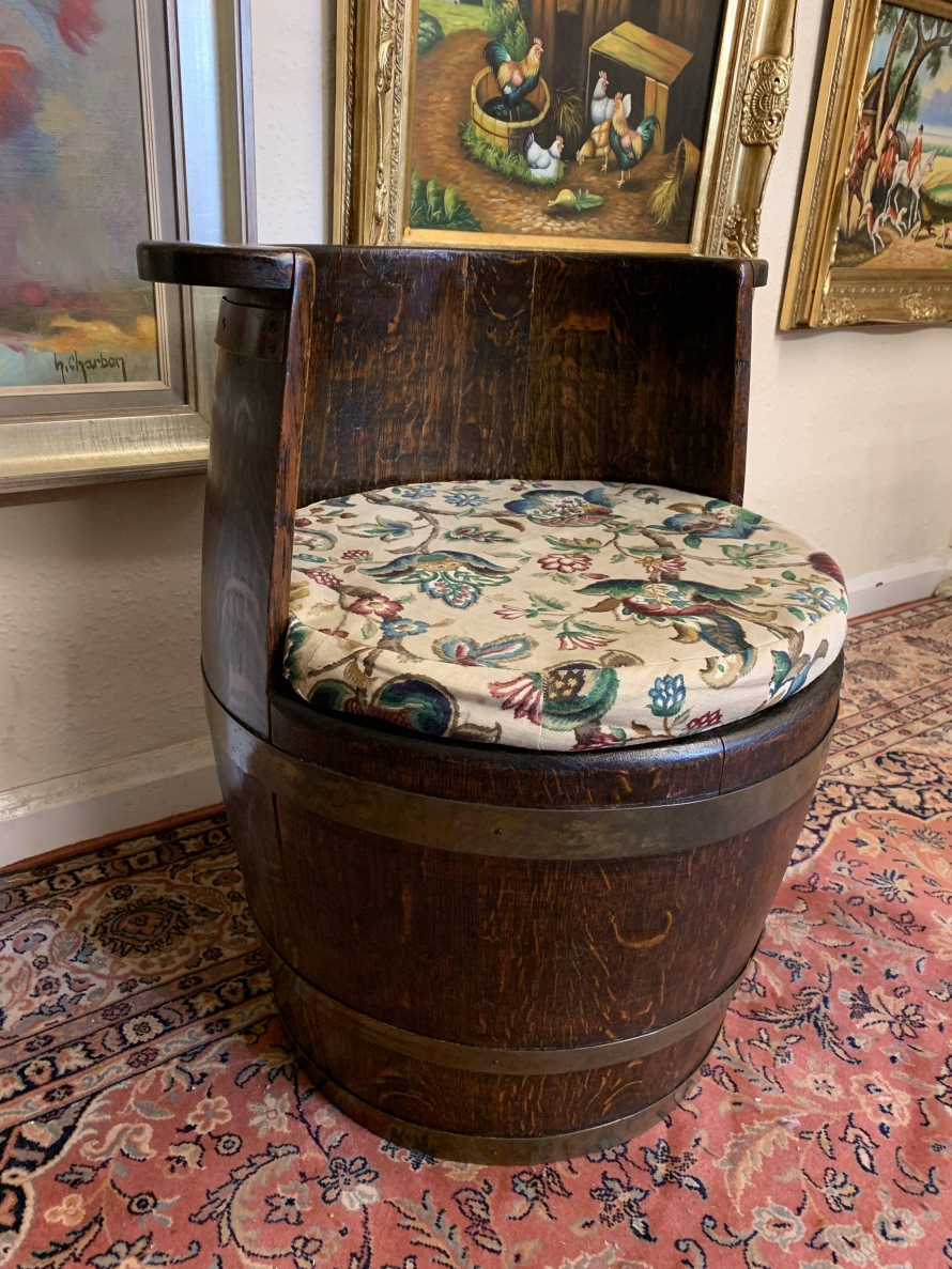 This fabulous chair dates circa 1920. Having two arms, removable seat cushion, storage beneath the lift up lid, fabulous oak which is brass bound.
