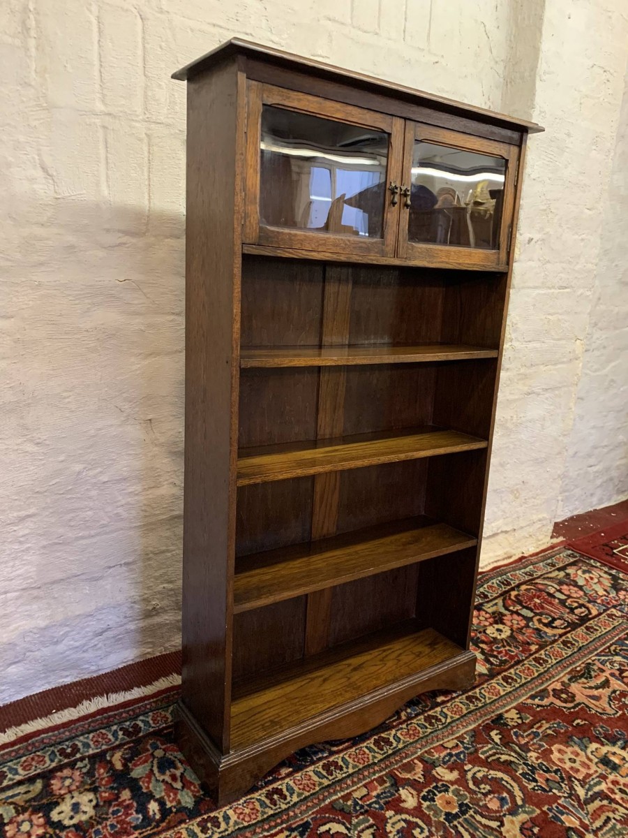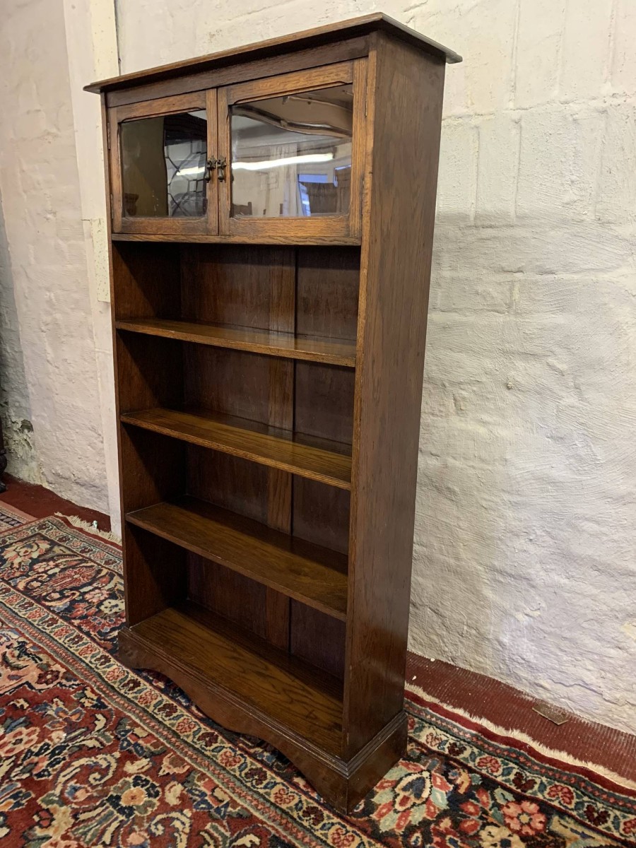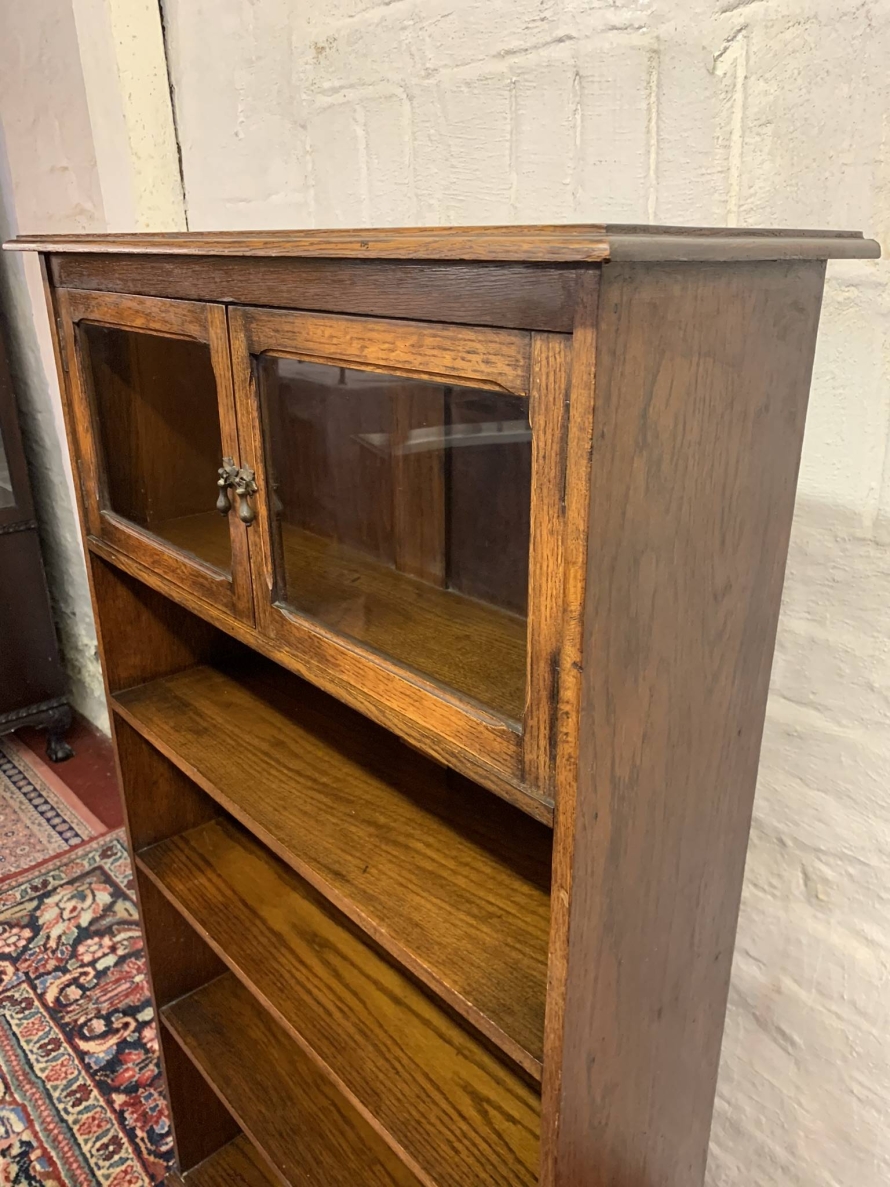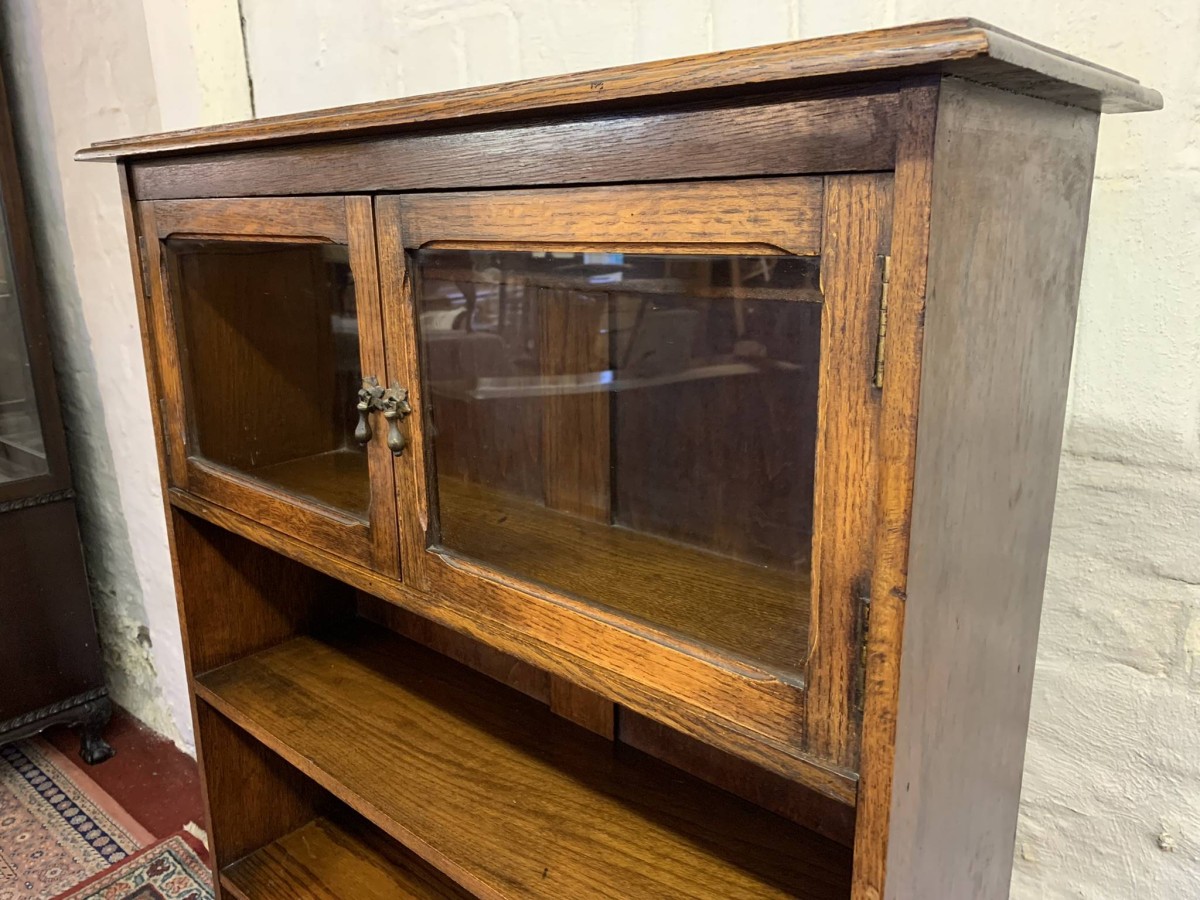The bookcase dates circa 1920. The oversailing top sits above a pair of glazed doors, each door having a brass teardrop handle. Below are four open shelves. The bookcase stands on bracket feet.