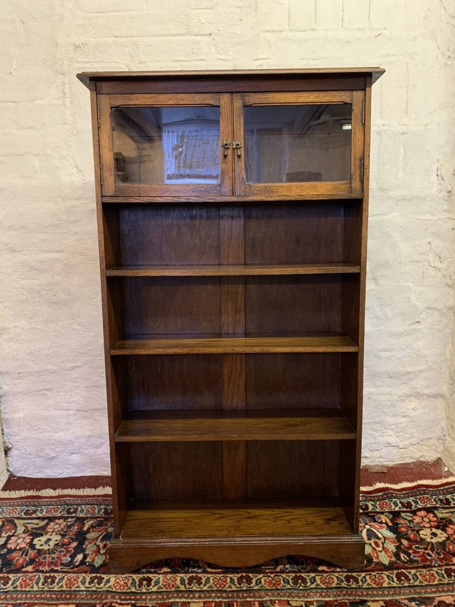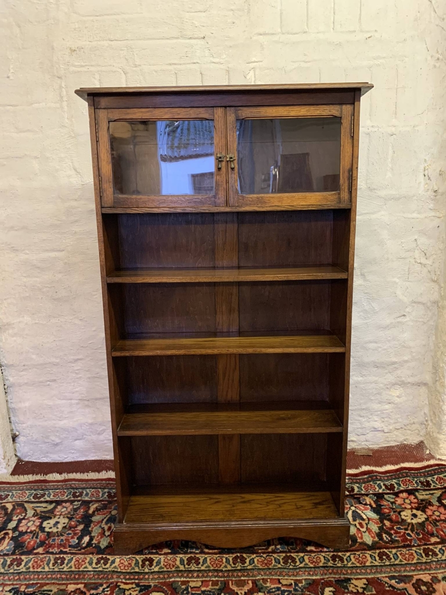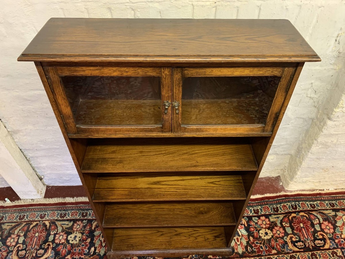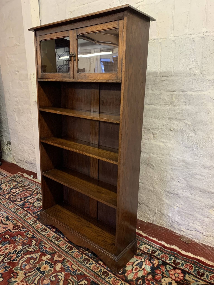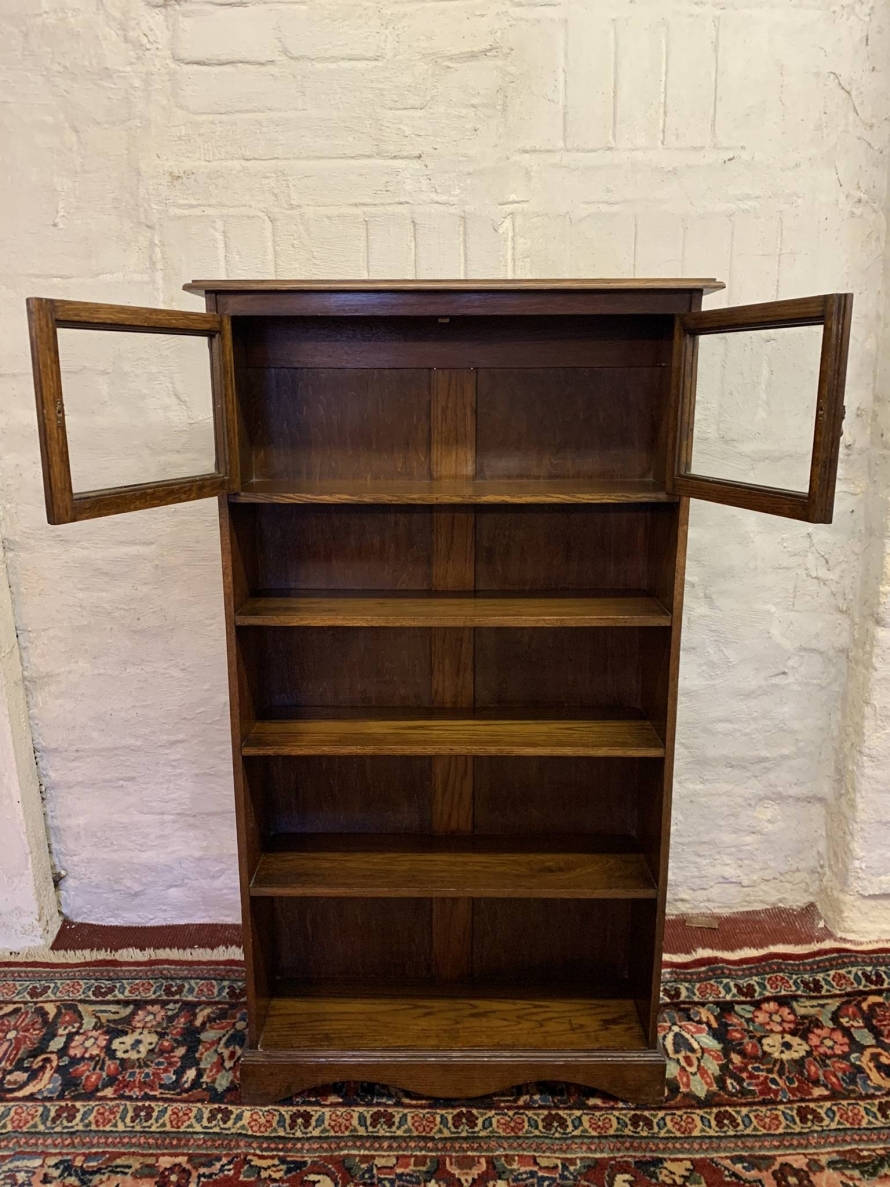 The bookcase dates circa 1920. The oversailing top sits above a pair of glazed doors, each door having a brass teardrop handle. Below are four open shelves. The bookcase stands on bracket feet.