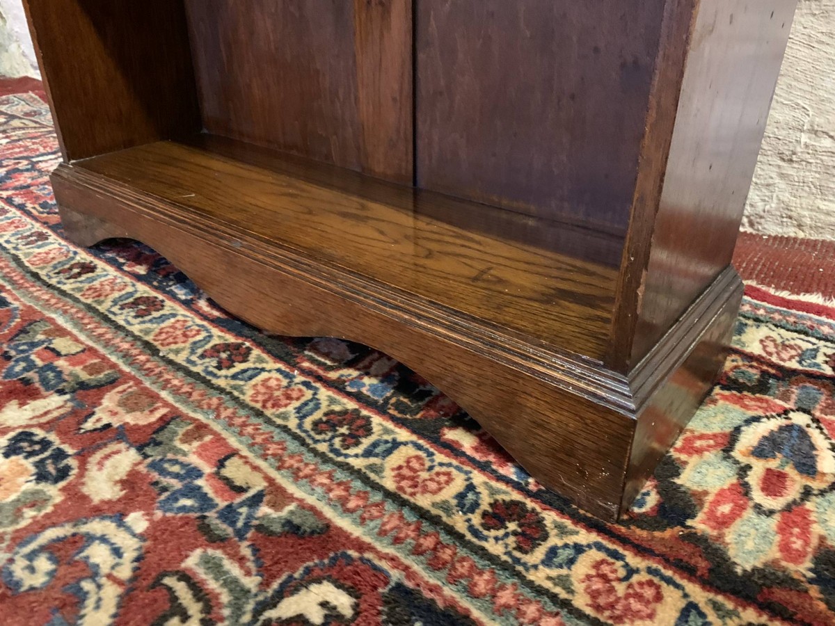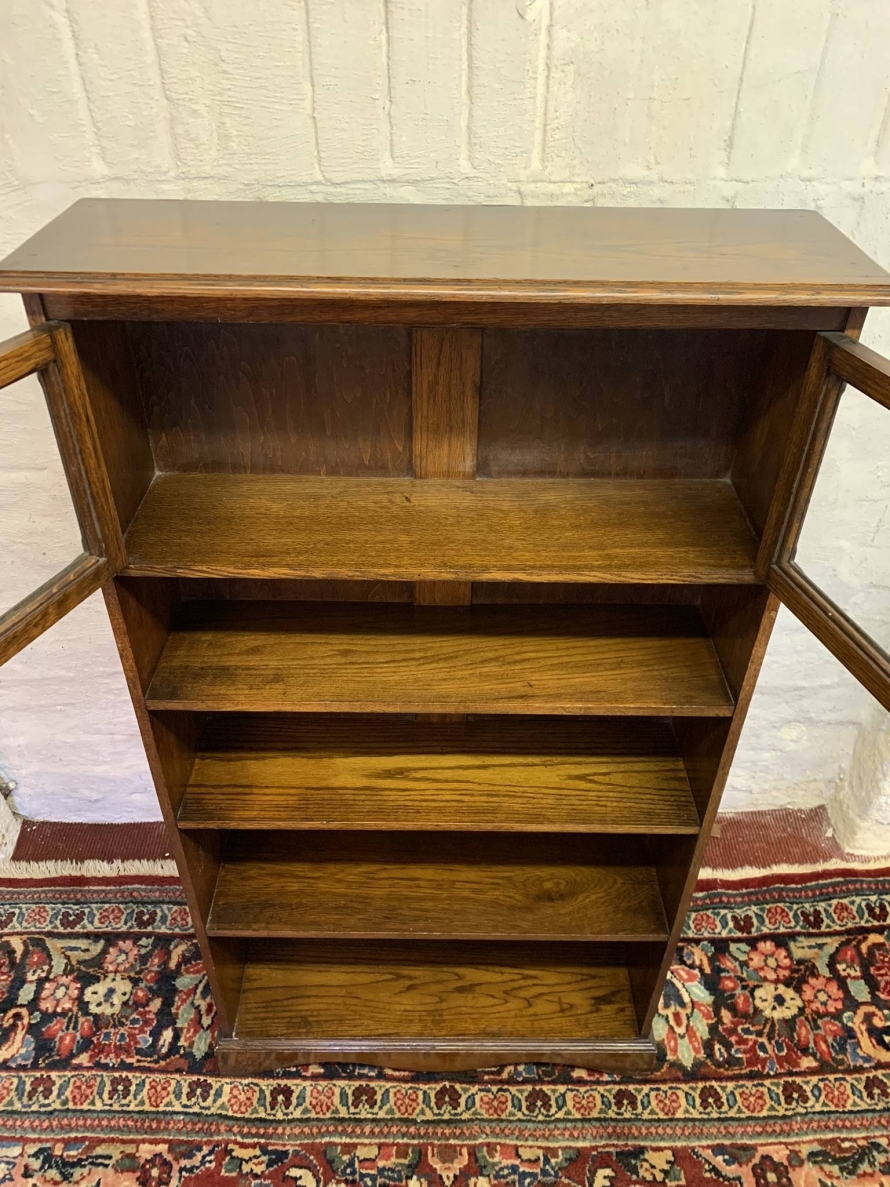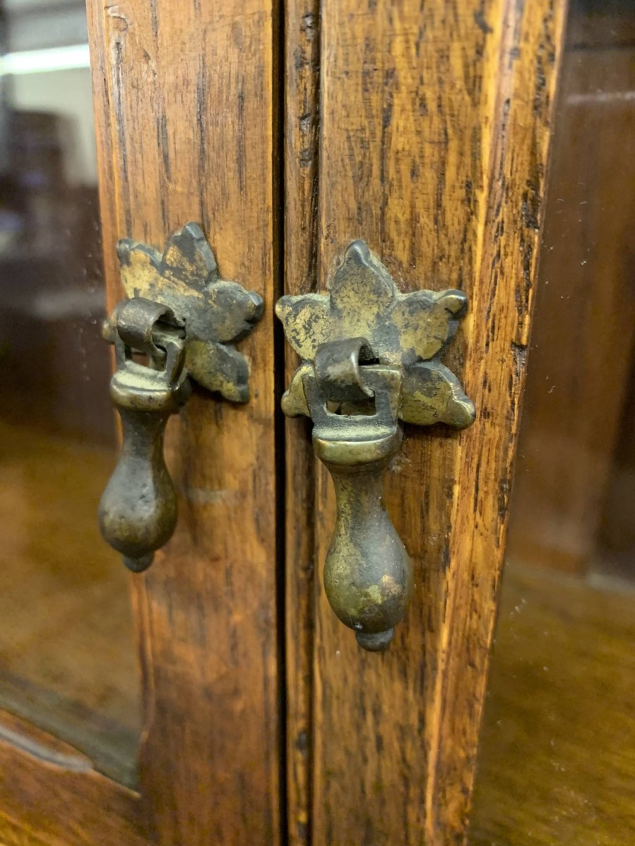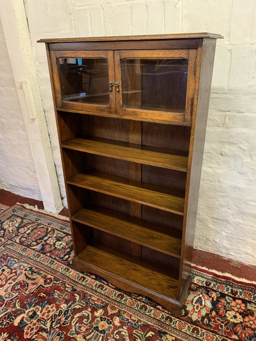 The bookcase dates circa 1920. The oversailing top sits above a pair of glazed doors, each door having a brass teardrop handle. Below are four open shelves. The bookcase stands on bracket feet.