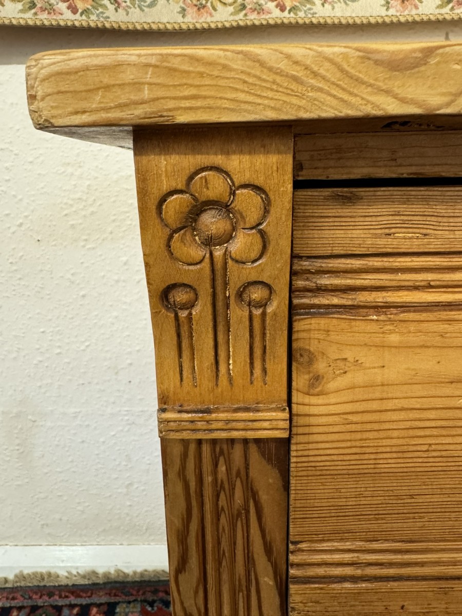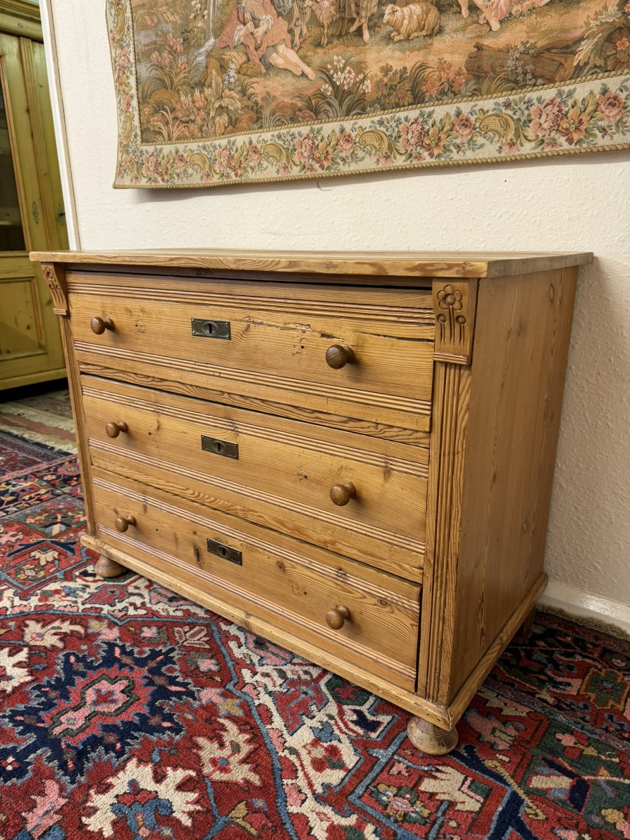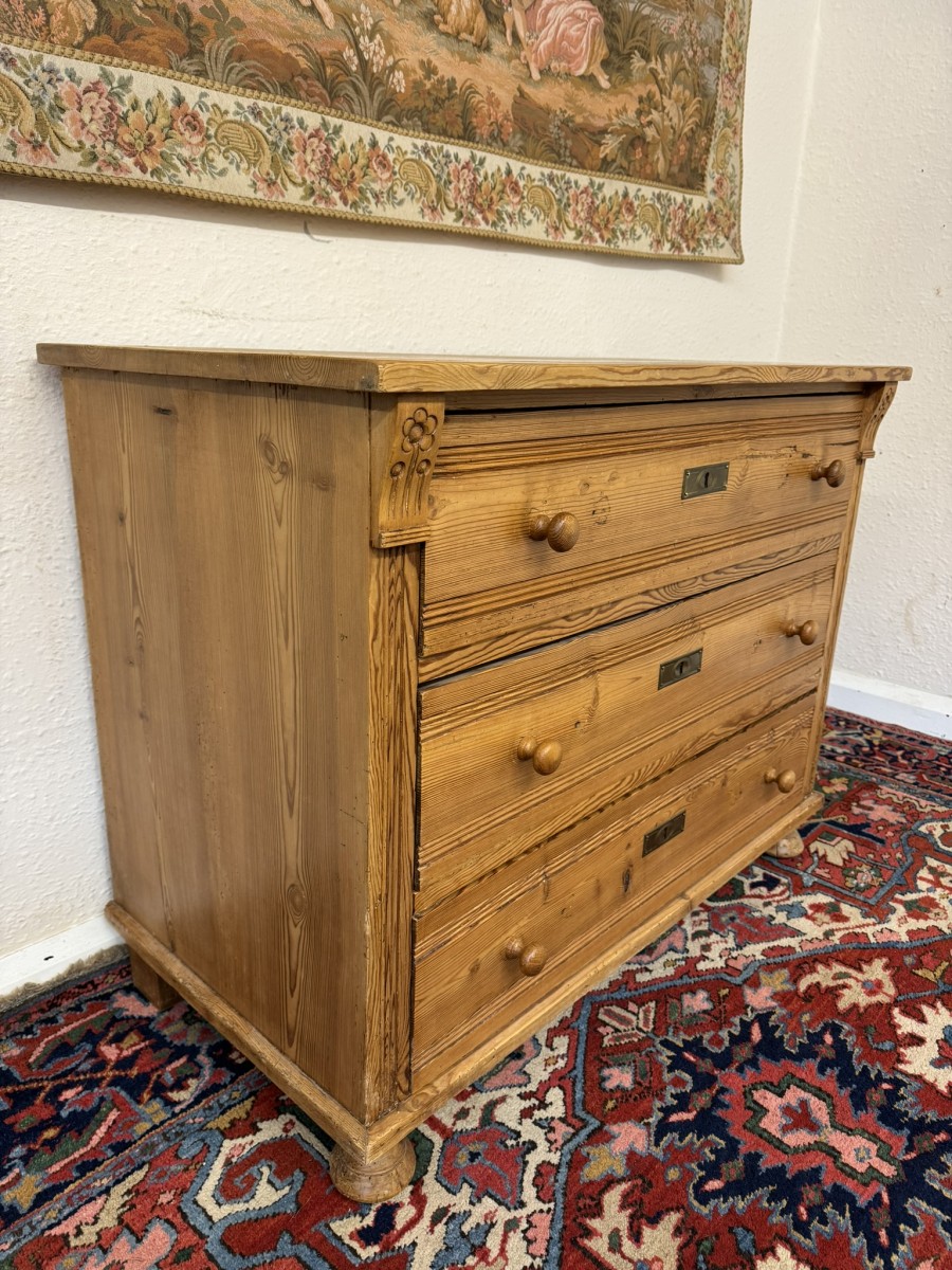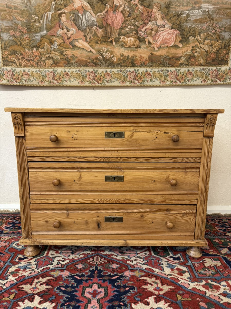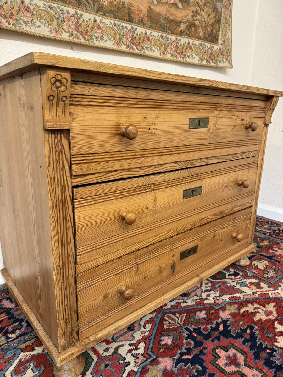 The chest made in fine pine dates circa 1920. Signs of age related wear gives added charm to the chest. The oversailing top sits above three drawers, each drawer having a turned handle. The drawers are flanked by carved scrolls. This lovely chest sits on four turned feet to the front.