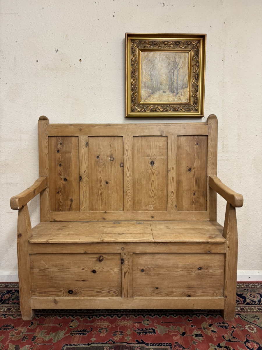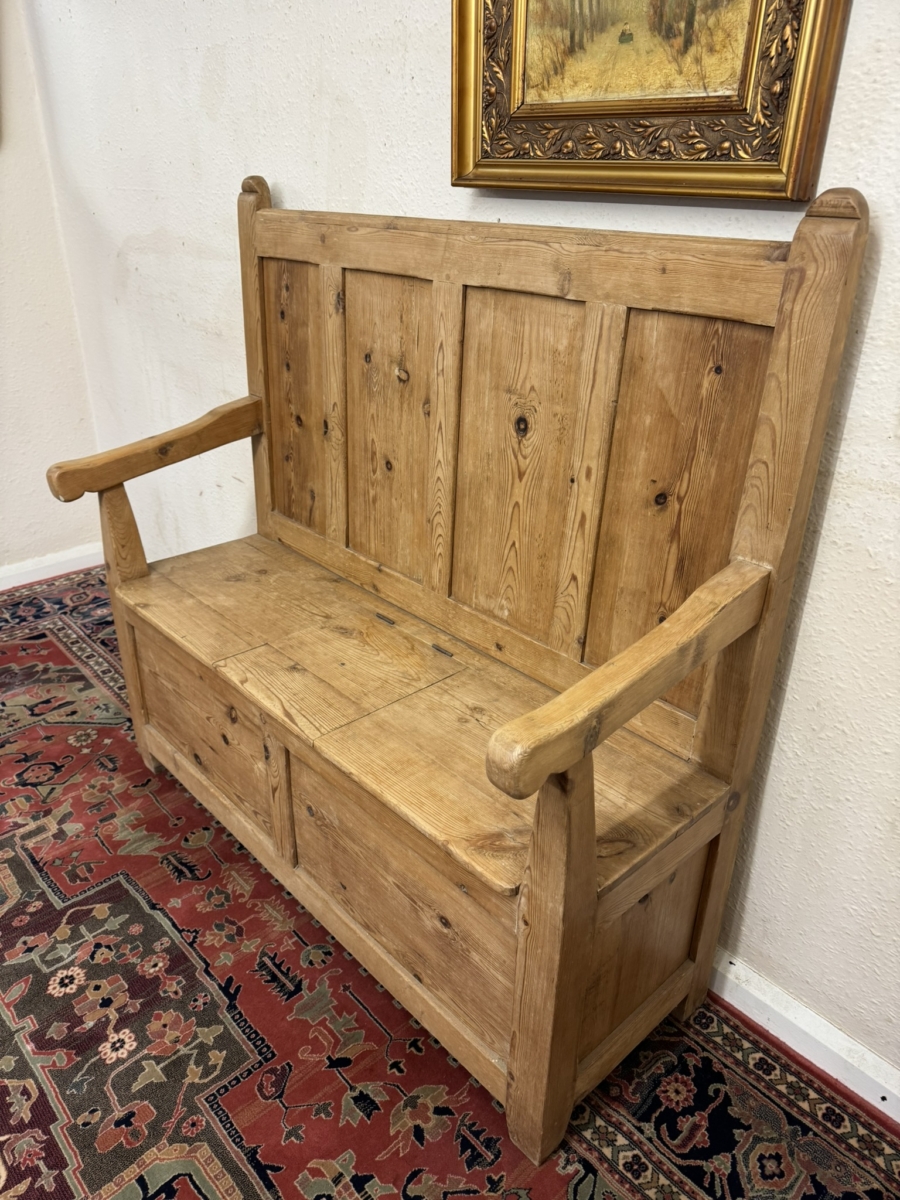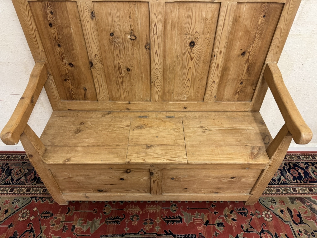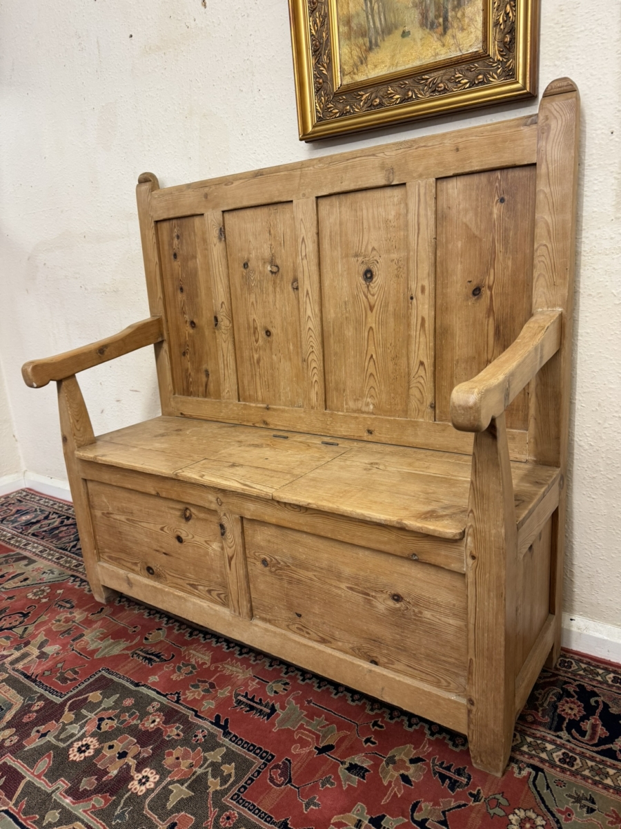 The settle dates circa 1920. The back has four panels. Two shaped arms, seat with central lift up lid, panelled to the front and sides and standing on traditional block feet.