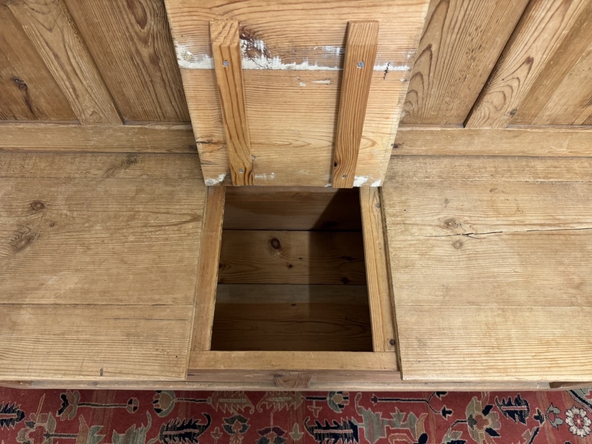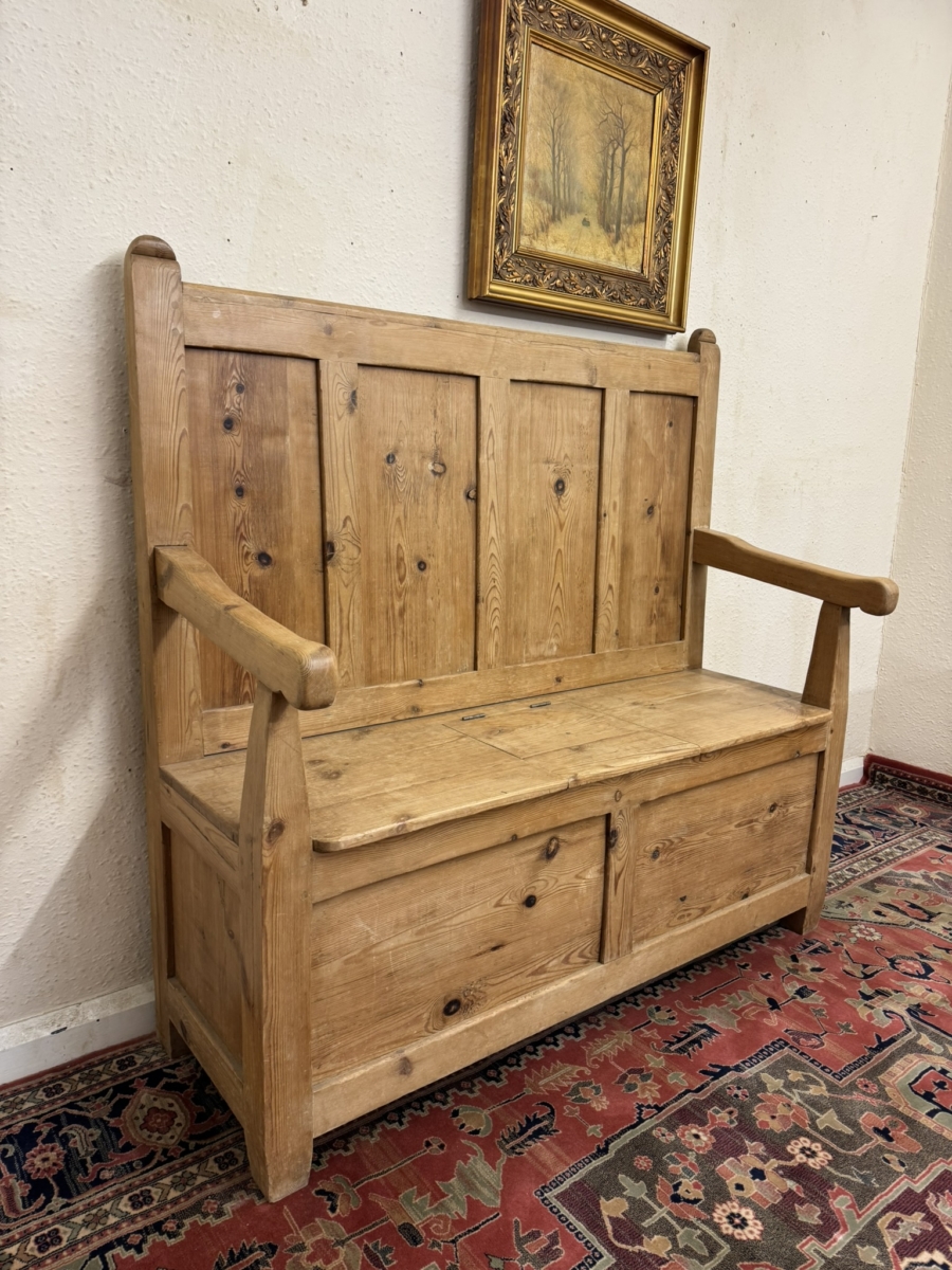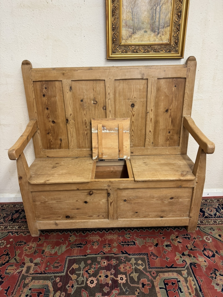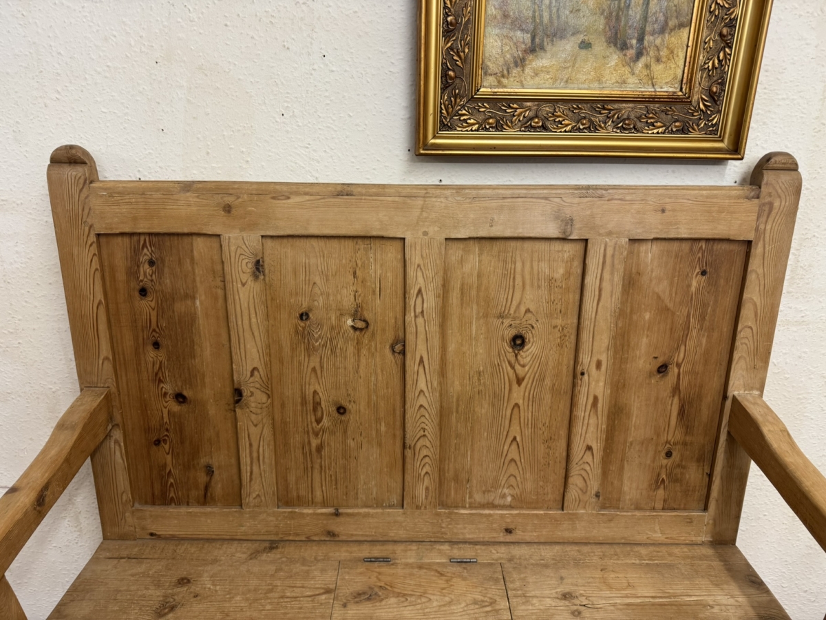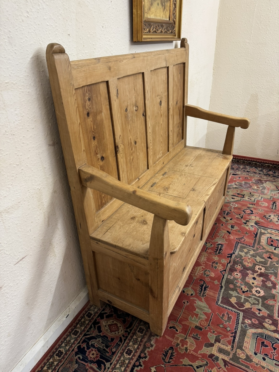 The settle dates circa 1920. The back has four panels. Two shaped arms, seat with central lift up lid, panelled to the front and sides and standing on traditional block feet.