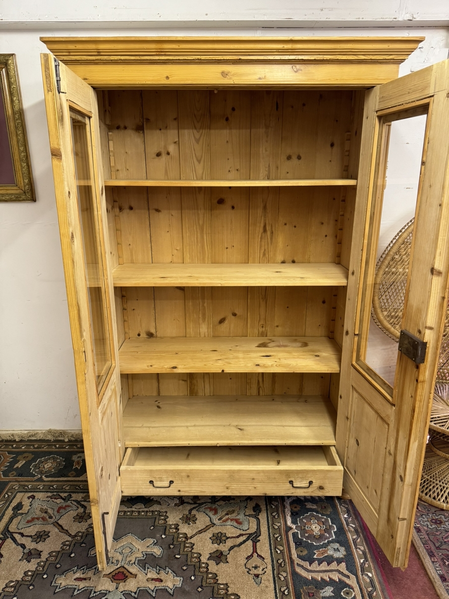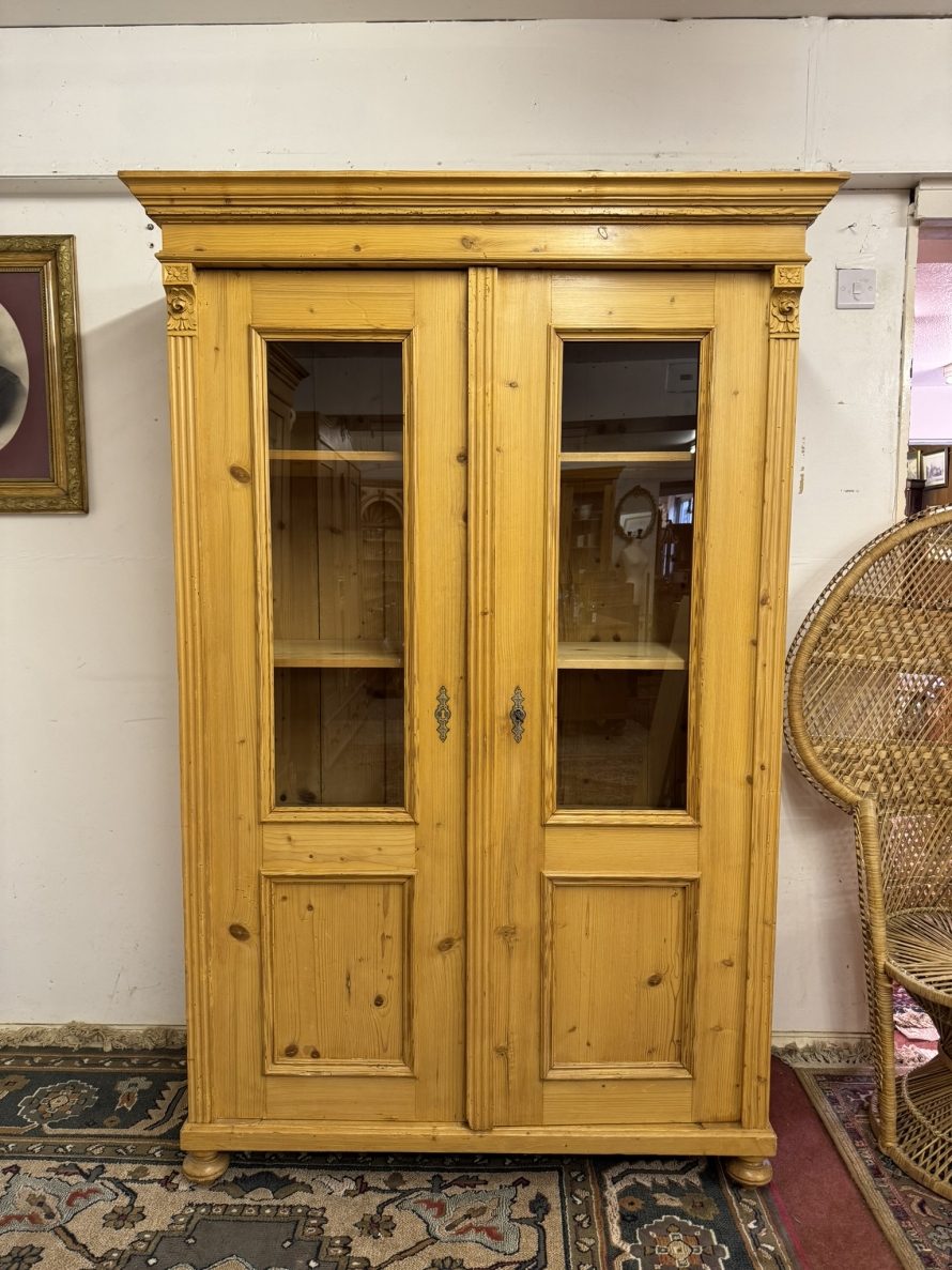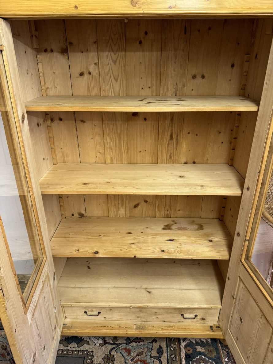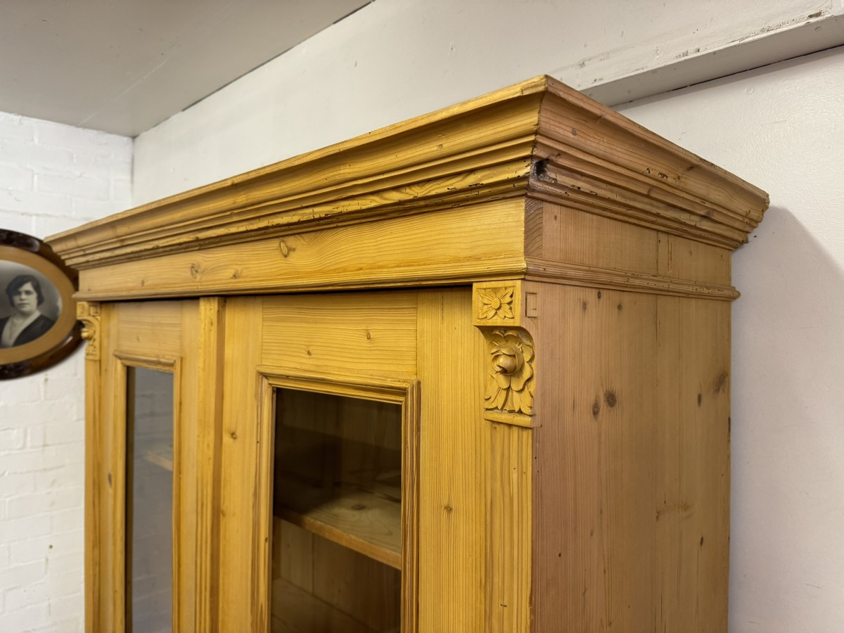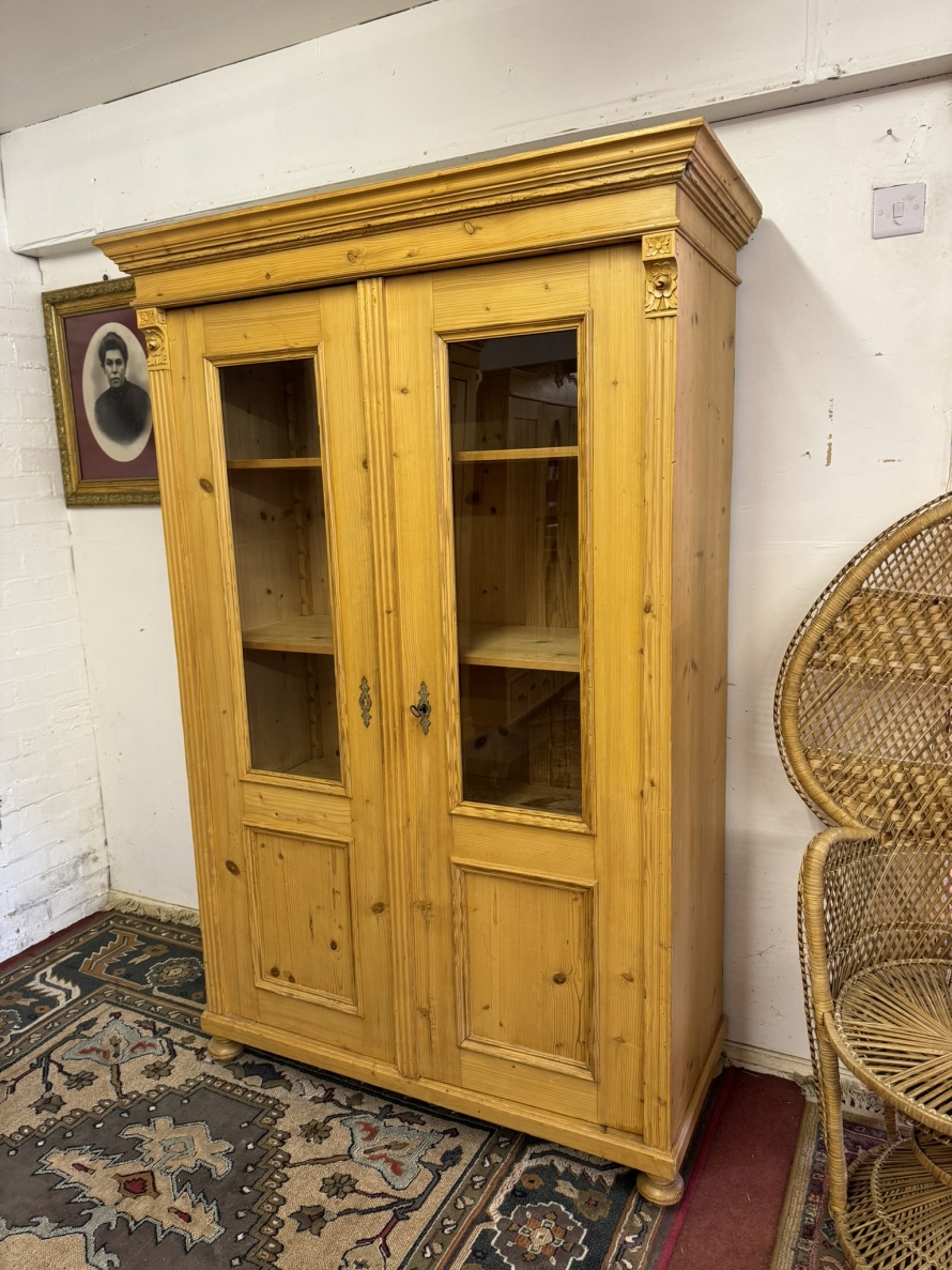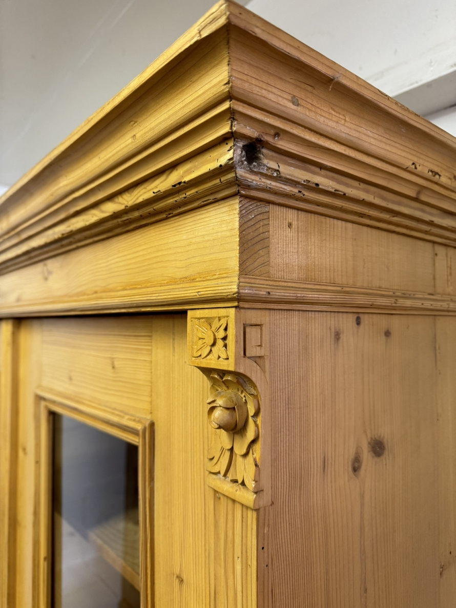 This fantastic pine glazed cupboard dates circa 1910. Signs of age related wear add to the character of this piece. The stepped cornice sits above two lockable doors, the doors having a glazed panel above a recessed panel. The doors open to reveal three adjustable and removable shelves with a drawer at the base. Decorative carvings this fine cabinet stands on four turned feet.