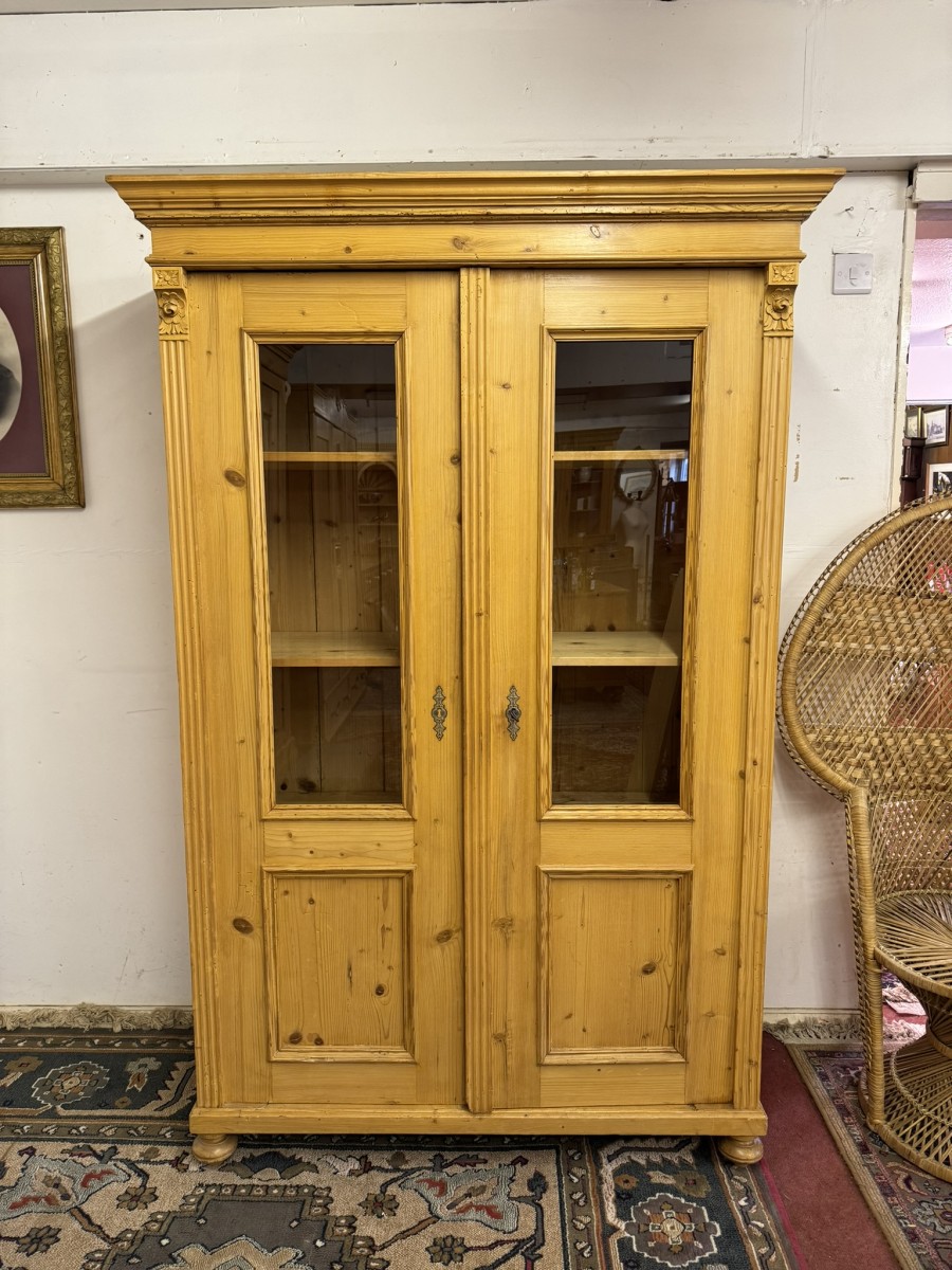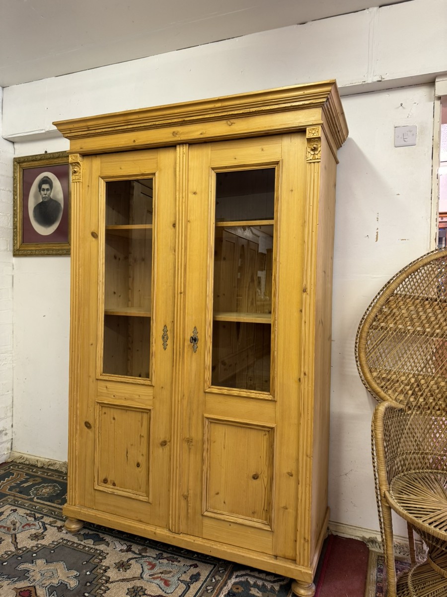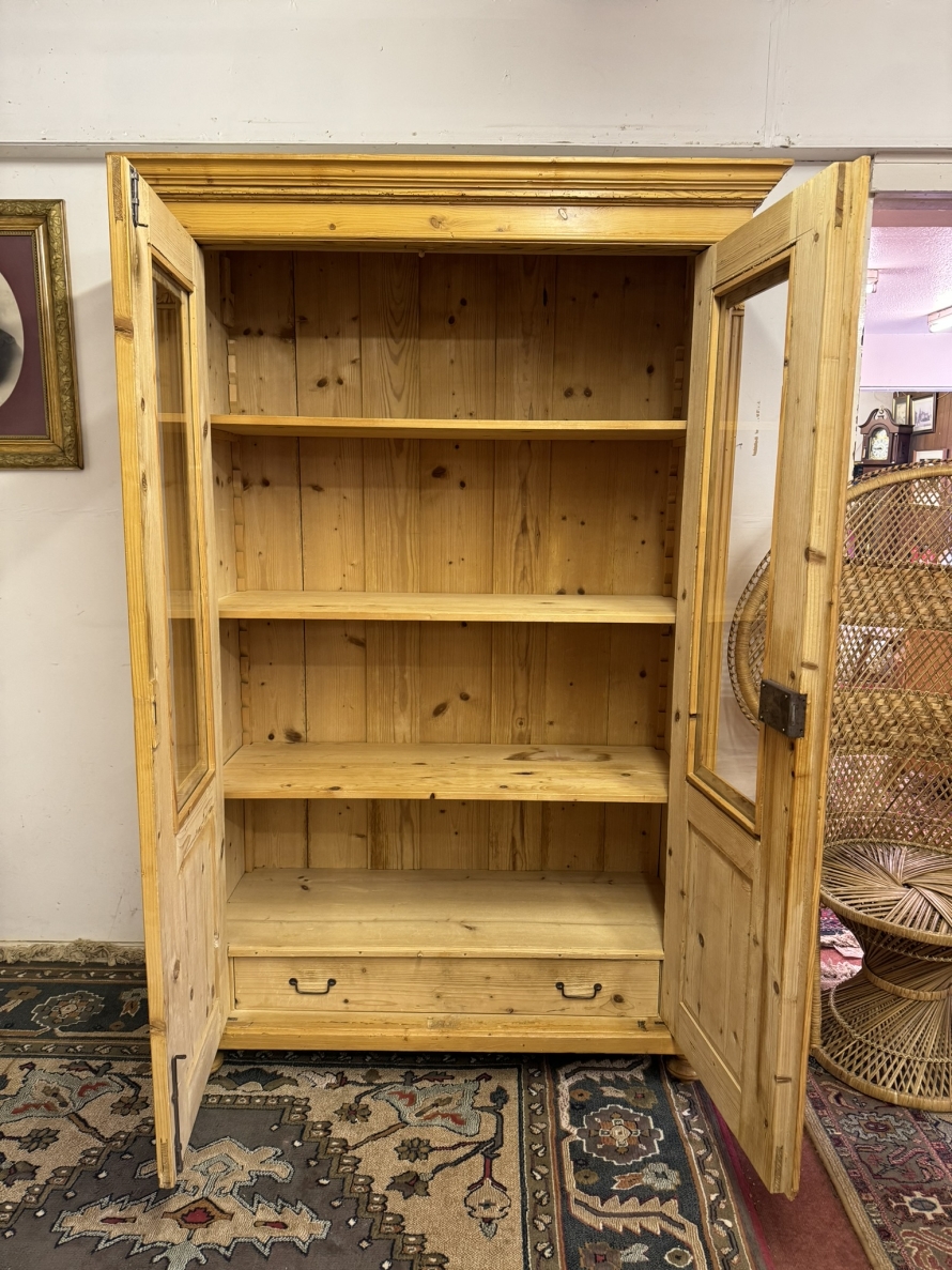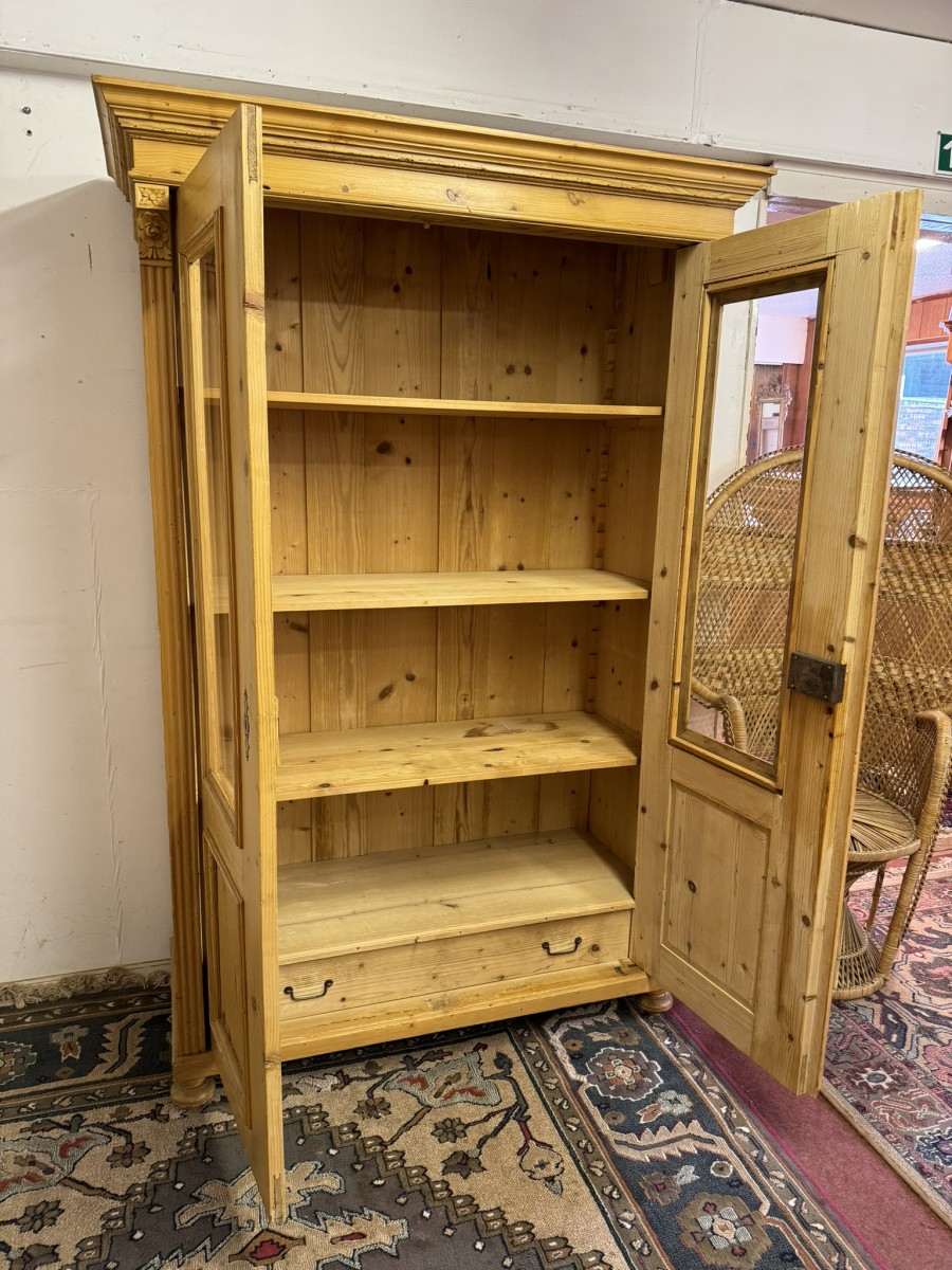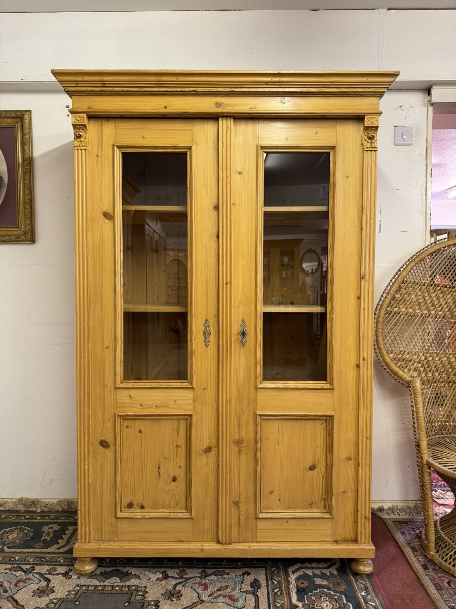 This fantastic pine glazed cupboard dates circa 1910. Signs of age related wear add to the character of this piece. The stepped cornice sits above two lockable doors, the doors having a glazed panel above a recessed panel. The doors open to reveal three adjustable and removable shelves with a drawer at the base. Decorative carvings this fine cabinet stands on four turned feet.