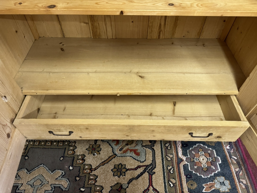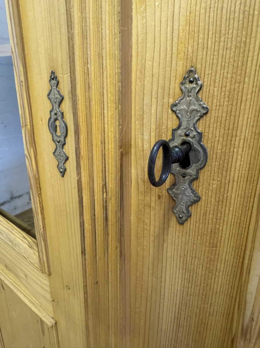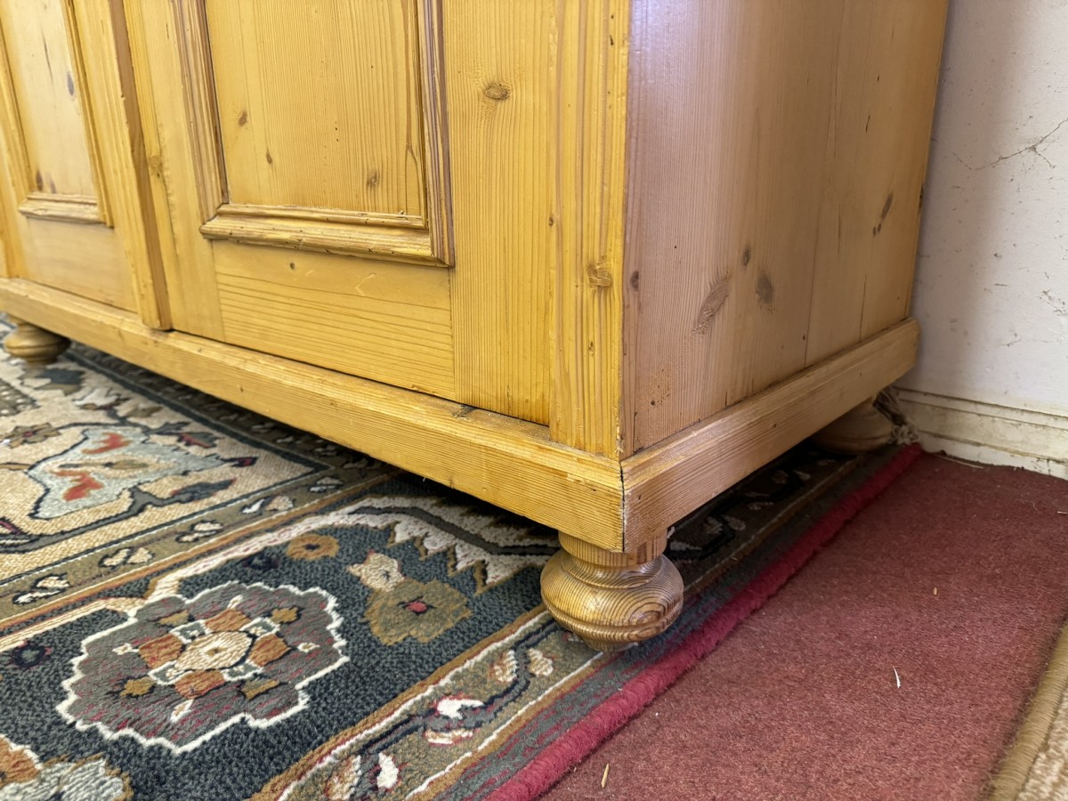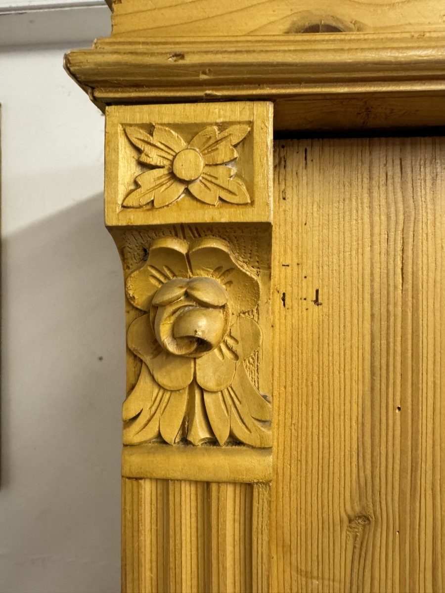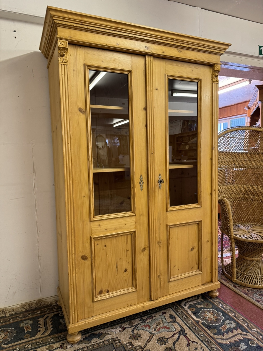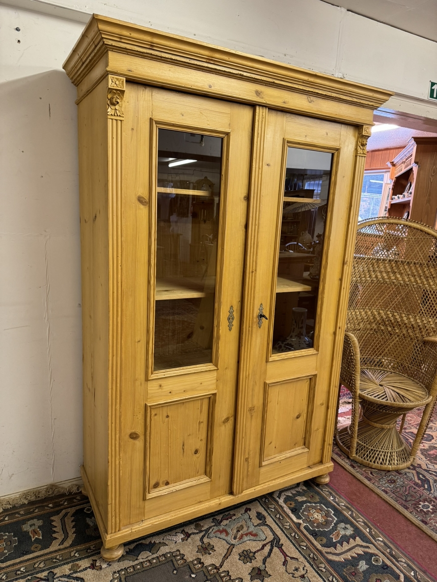 This fantastic pine glazed cupboard dates circa 1910. Signs of age related wear add to the character of this piece. The stepped cornice sits above two lockable doors, the doors having a glazed panel above a recessed panel. The doors open to reveal three adjustable and removable shelves with a drawer at the base. Decorative carvings this fine cabinet stands on four turned feet.