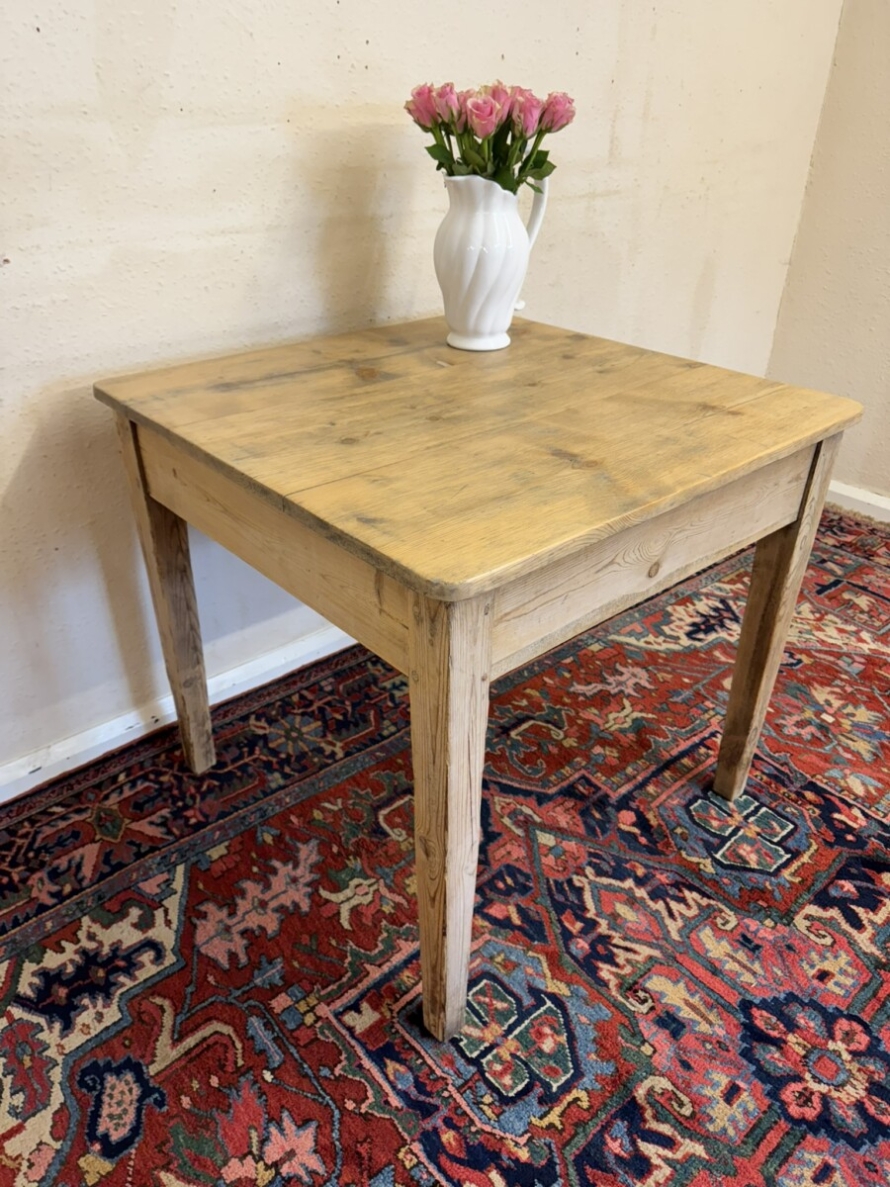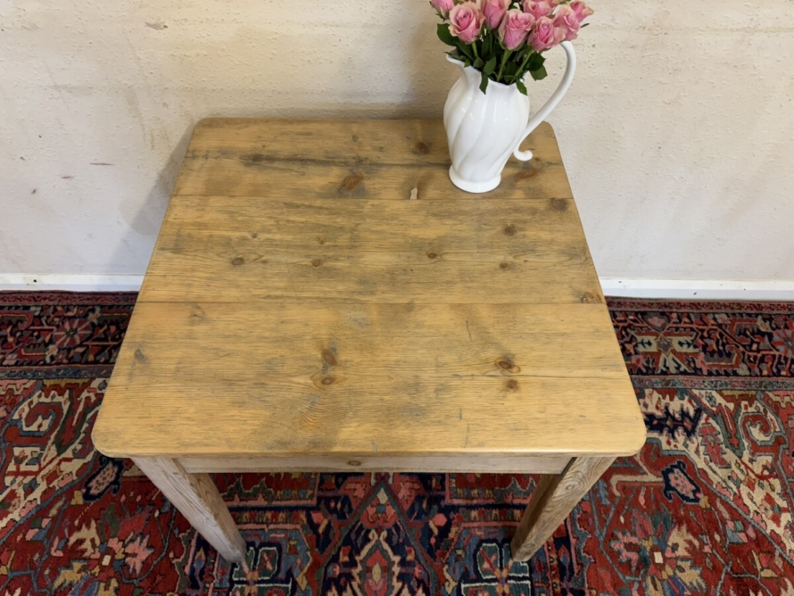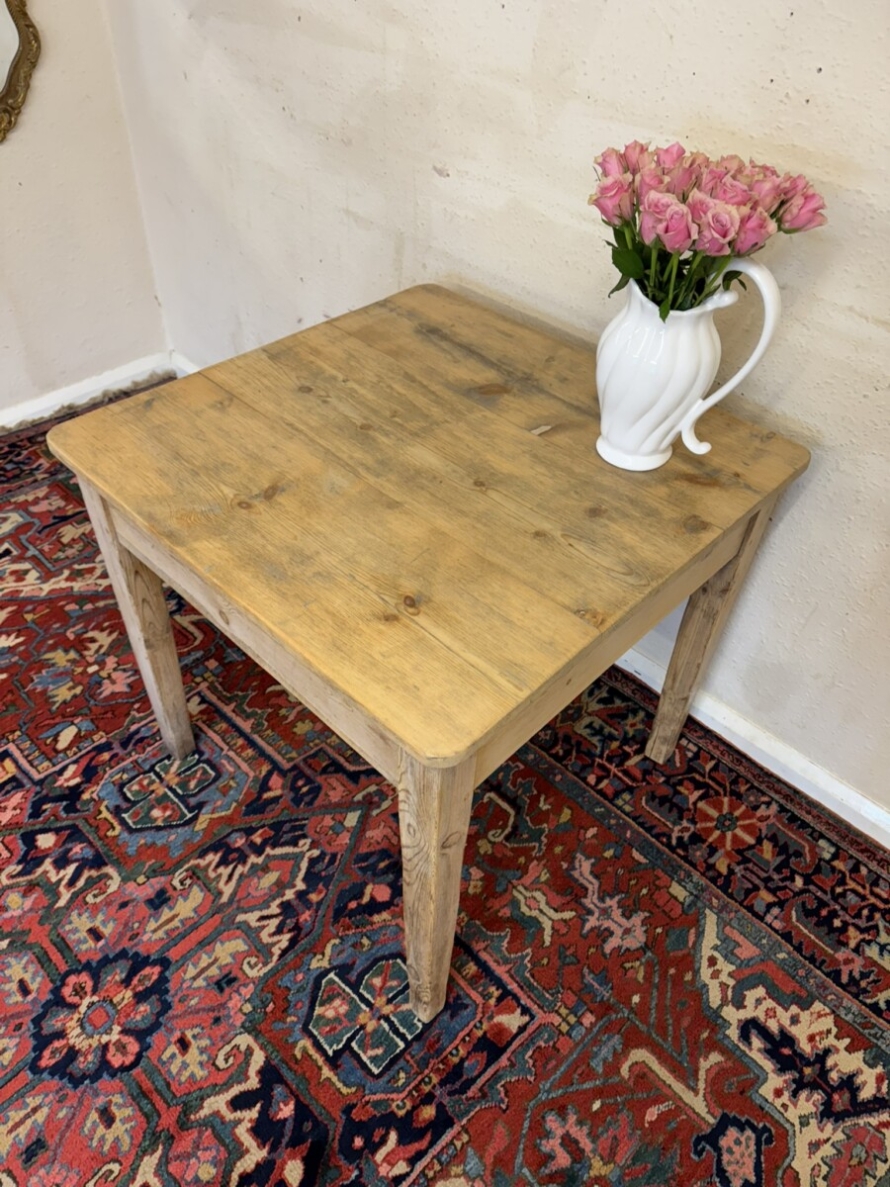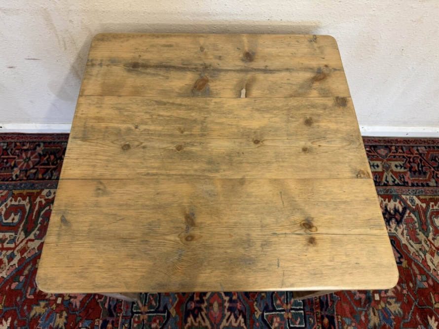 This great pine table dates circa 1900. With a planked square top which has rounded corners and sits on four tapering legs, peg jointed throughout in a rustic stripped pine finish.