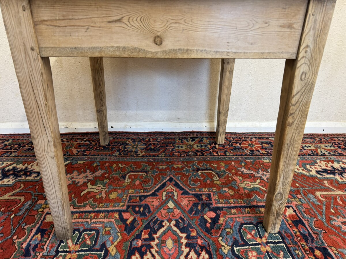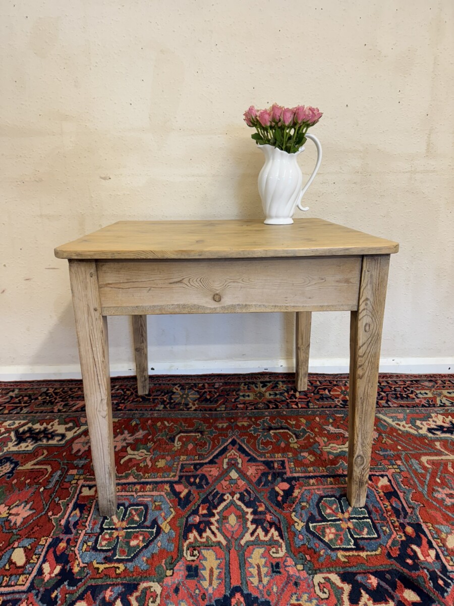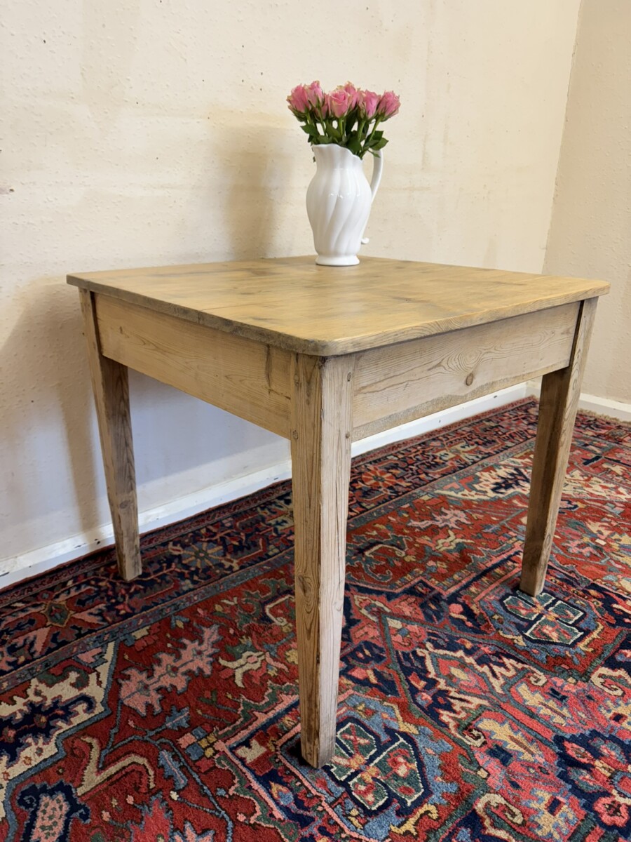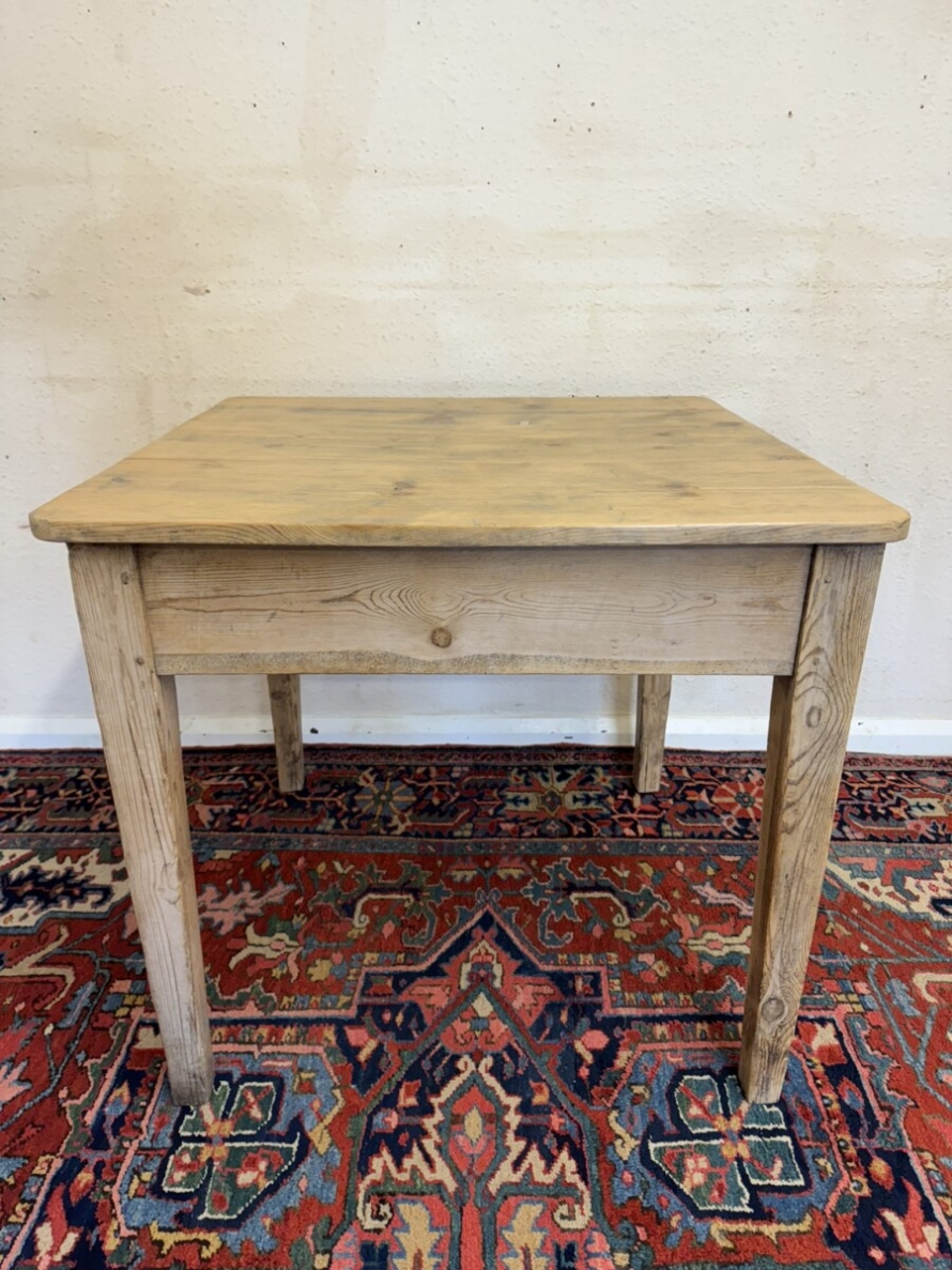 This great pine table dates circa 1900. With a planked square top which has rounded corners and sits on four tapering legs, peg jointed throughout in a rustic stripped pine finish.