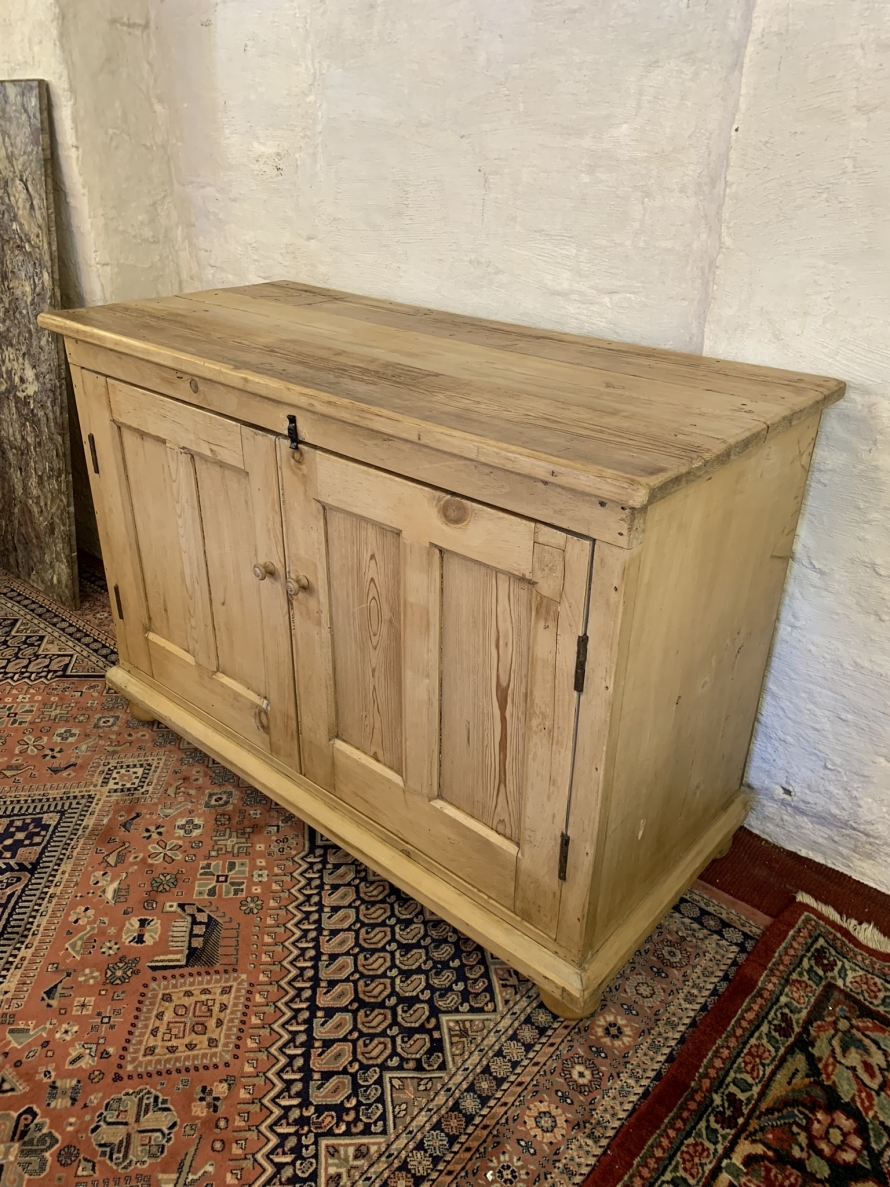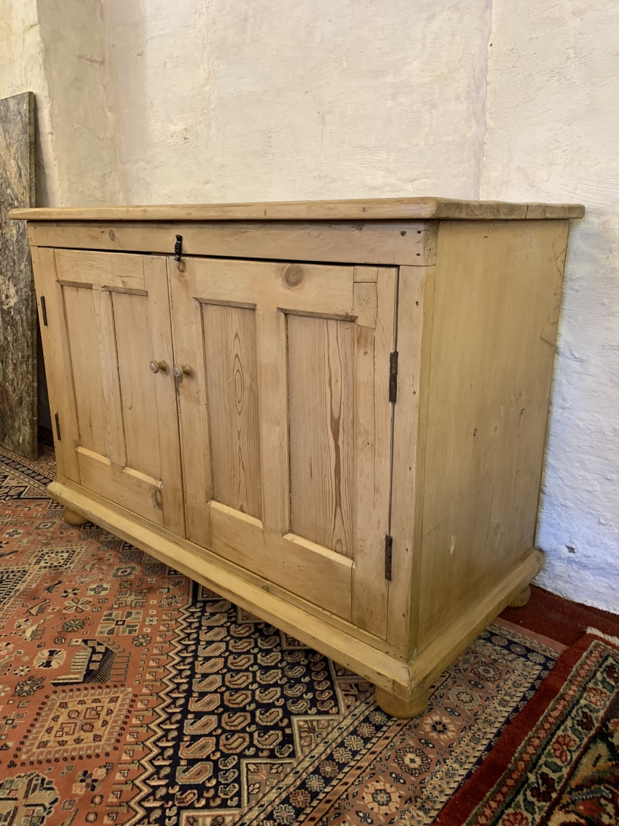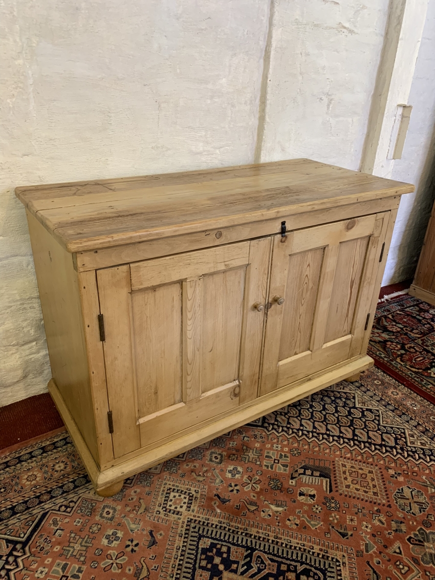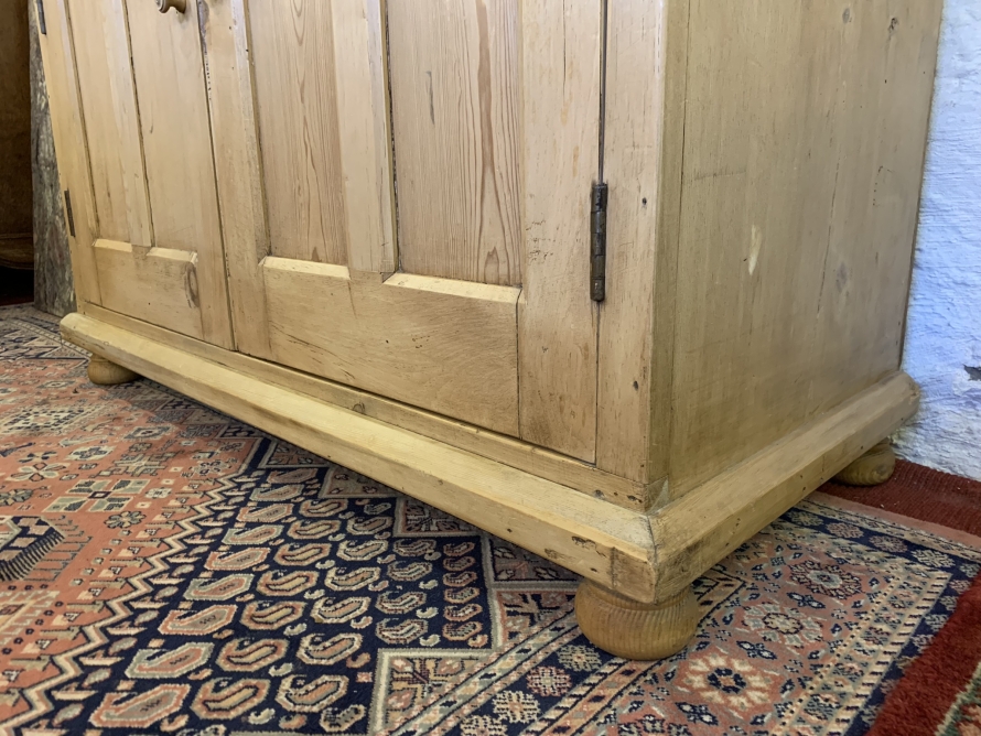This fabulous antique pine cupboard dates circa 1910. The oversailing top sits above a pair of lockable recessed panelled doors, the doors open to reveal a fixed shelf. This super cupboard has a plinth base and sits on four turned feet.