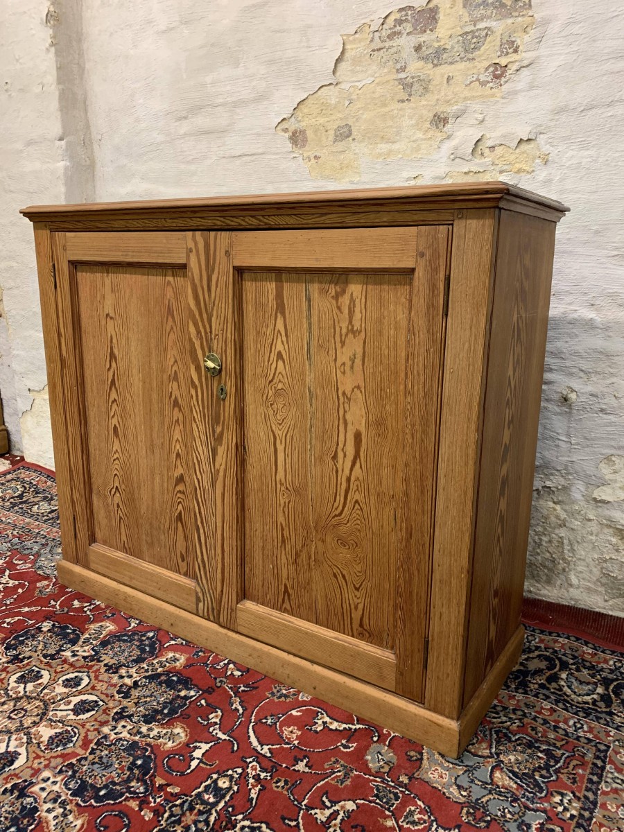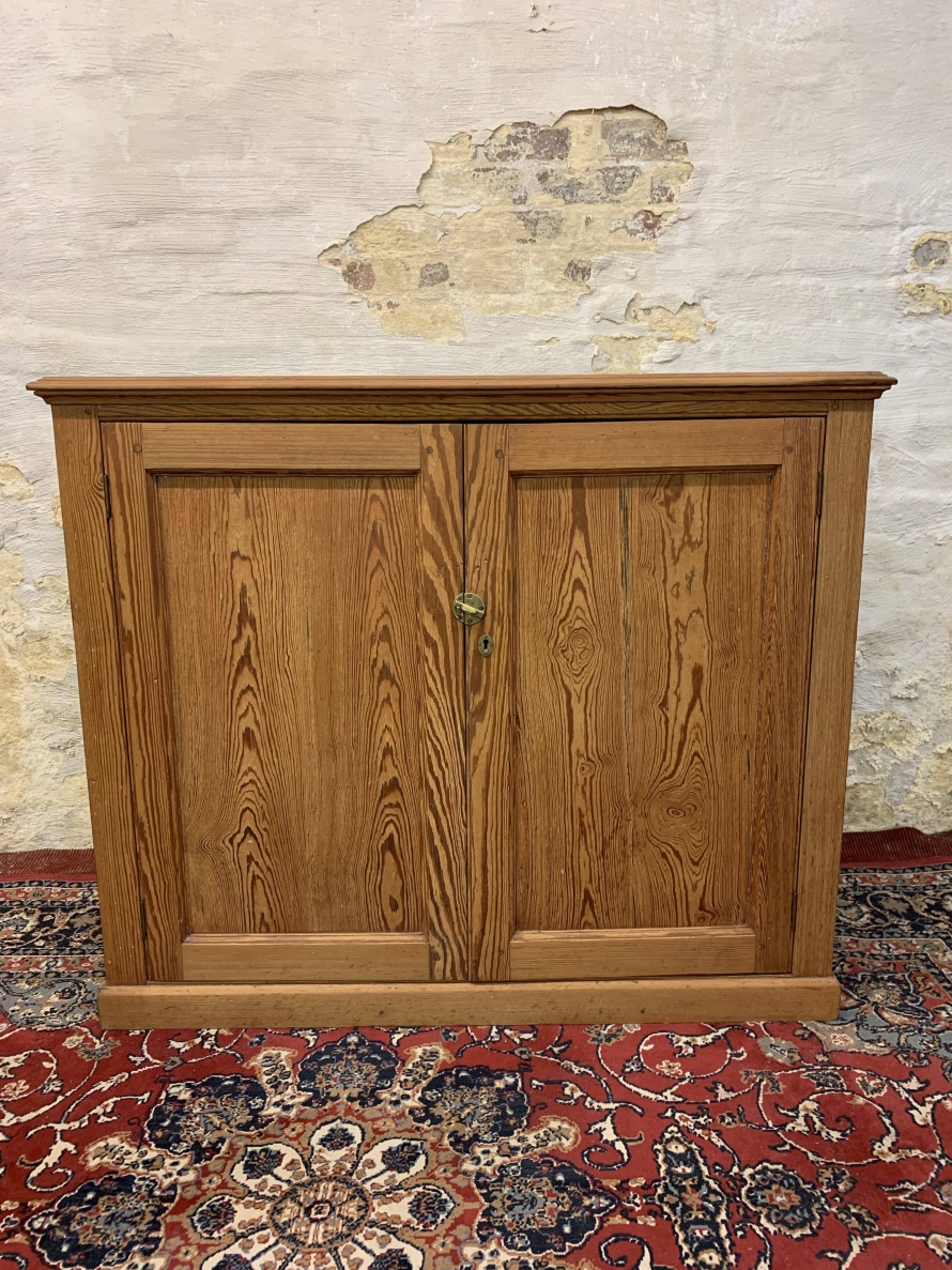 This Victorian pitch pine cupboard dates circa 1890 and is in excellent condition. The oversailing top sits above a pair of lockable recessed panelled cupboard doors, the doors having a brass turn lock. The doors open to reveal two fixed shelves. This fabulous Victorian pitch pine cupboard sits on a plinth base.