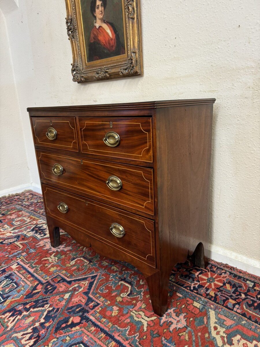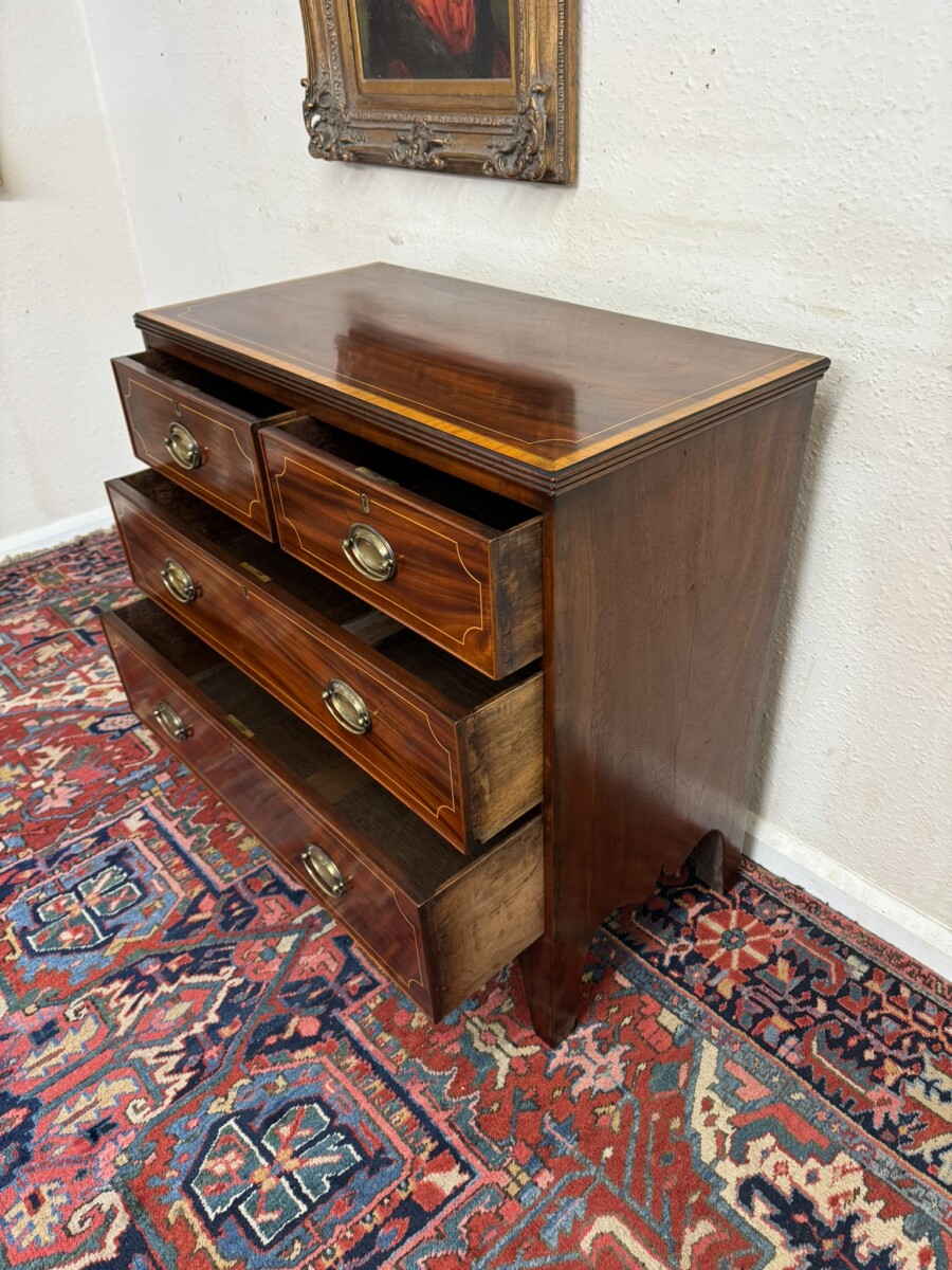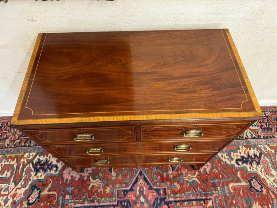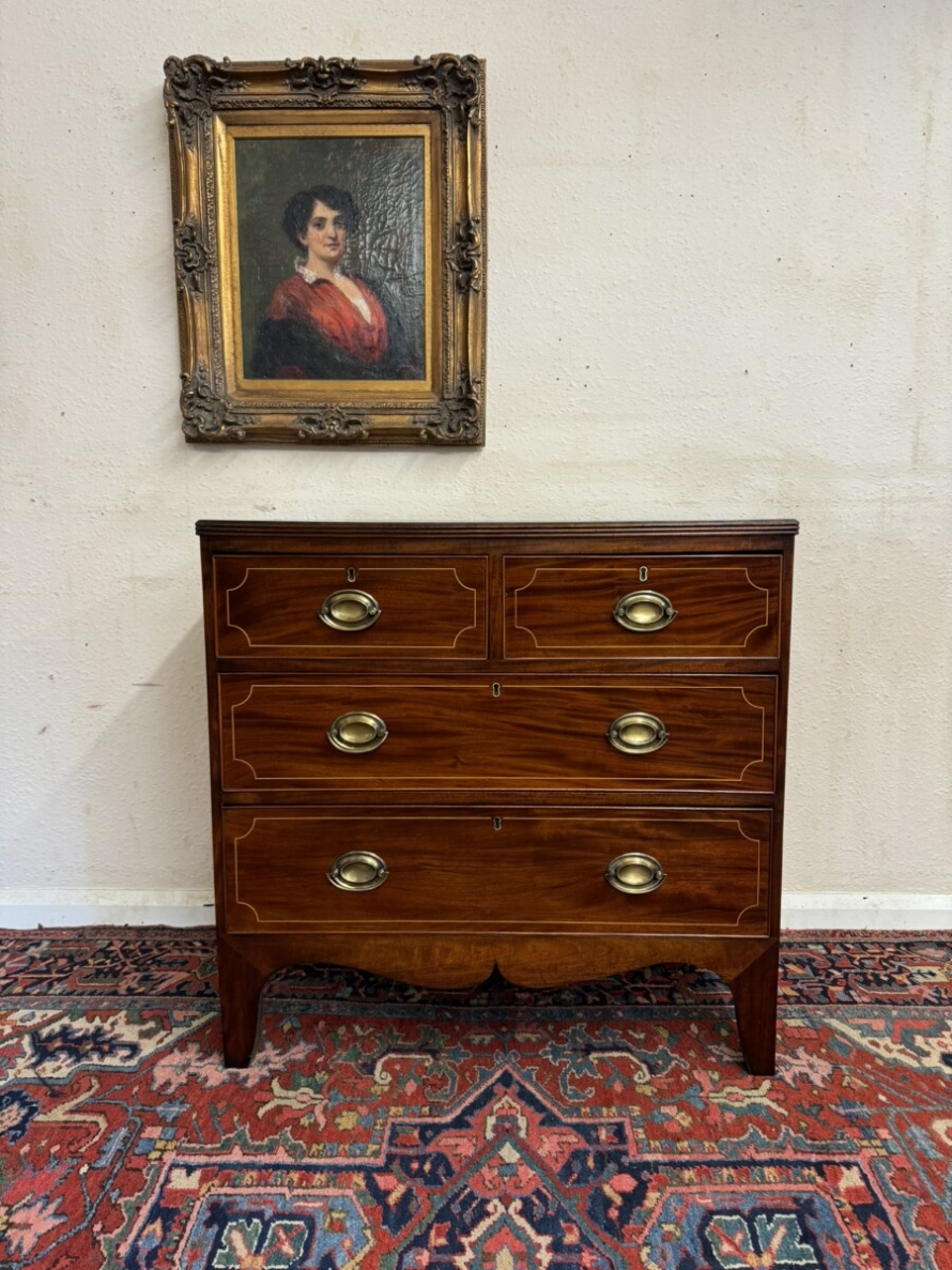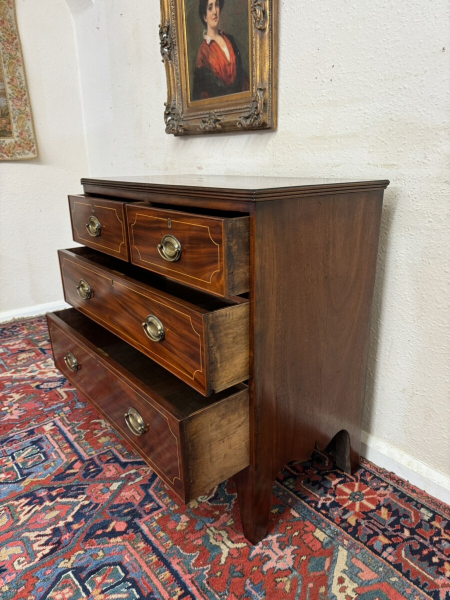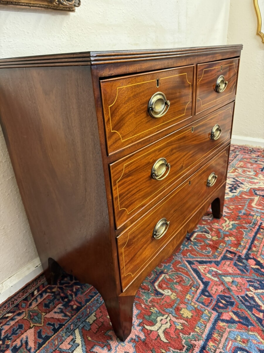 This super neat sized chest of drawers dates circa 1810. The top has string inlaid decoration with a satinwood cross banded edging. Below are a pair of short drawers, each drawer having string inlaid decoration and a brass handle. Below are two graduated drawers, each drawer having string inlaid decoration and a pair of brass handles. Wavy apron to the sides and front and standing on traditional Regency legs. Slight signs of age related wear but overall in great condition.