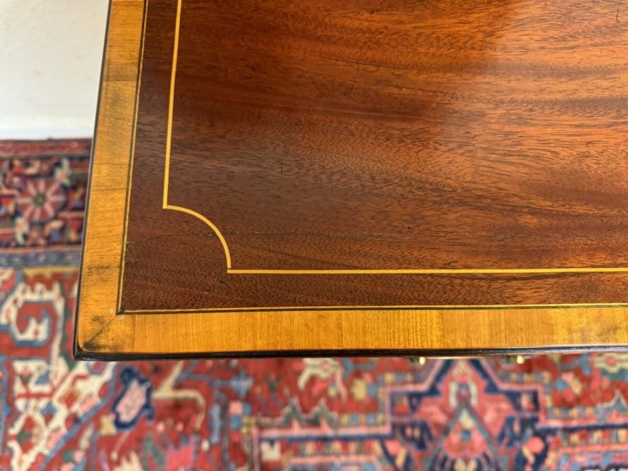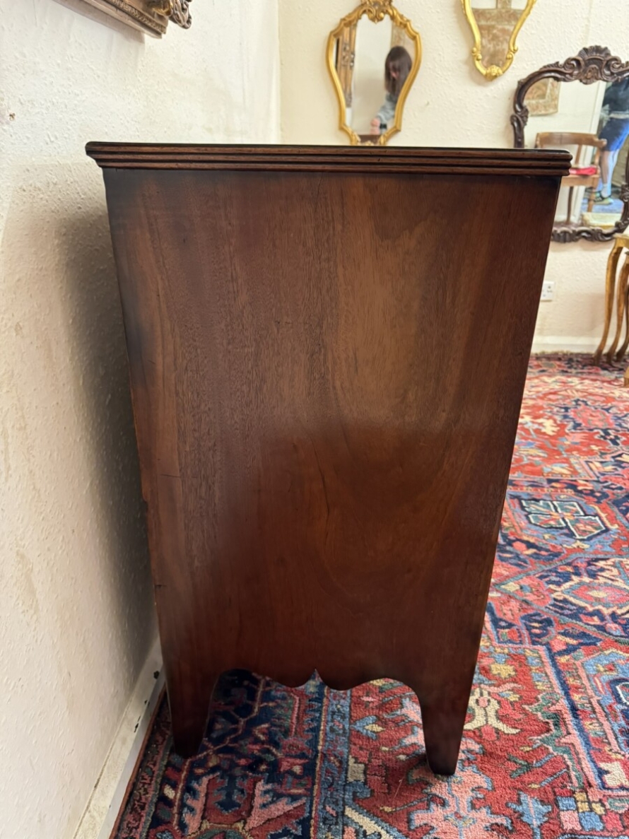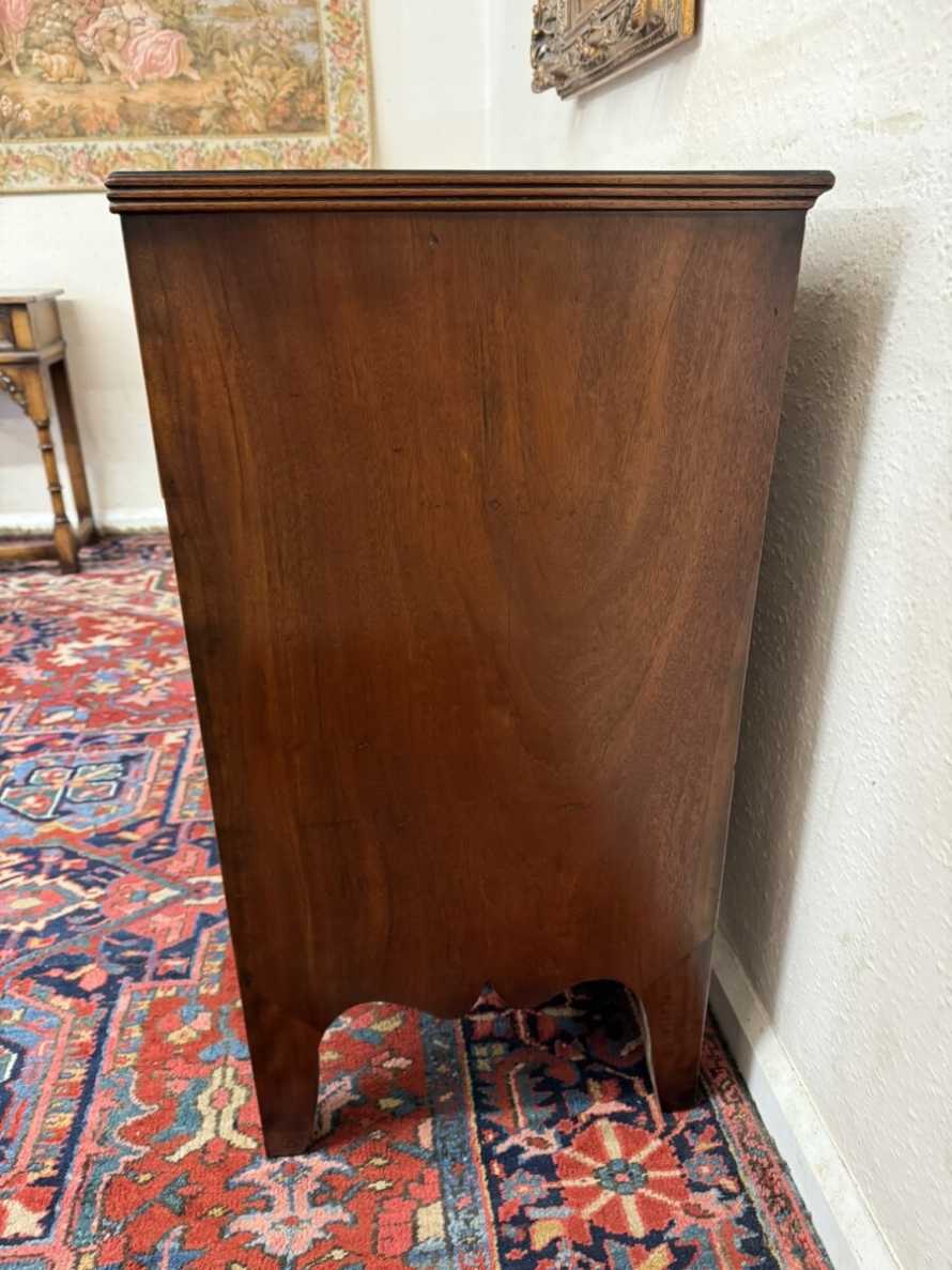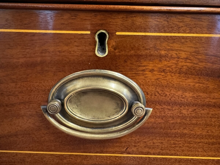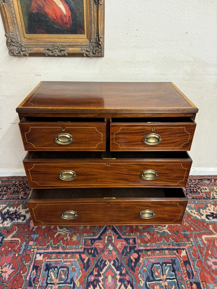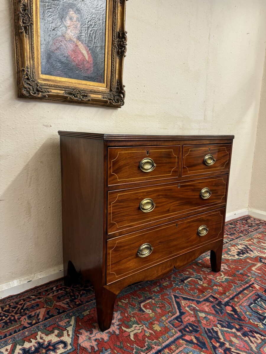 This super neat sized chest of drawers dates circa 1810. The top has string inlaid decoration with a satinwood cross banded edging. Below are a pair of short drawers, each drawer having string inlaid decoration and a brass handle. Below are two graduated drawers, each drawer having string inlaid decoration and a pair of brass handles. Wavy apron to the sides and front and standing on traditional Regency legs. Slight signs of age related wear but overall in great condition.