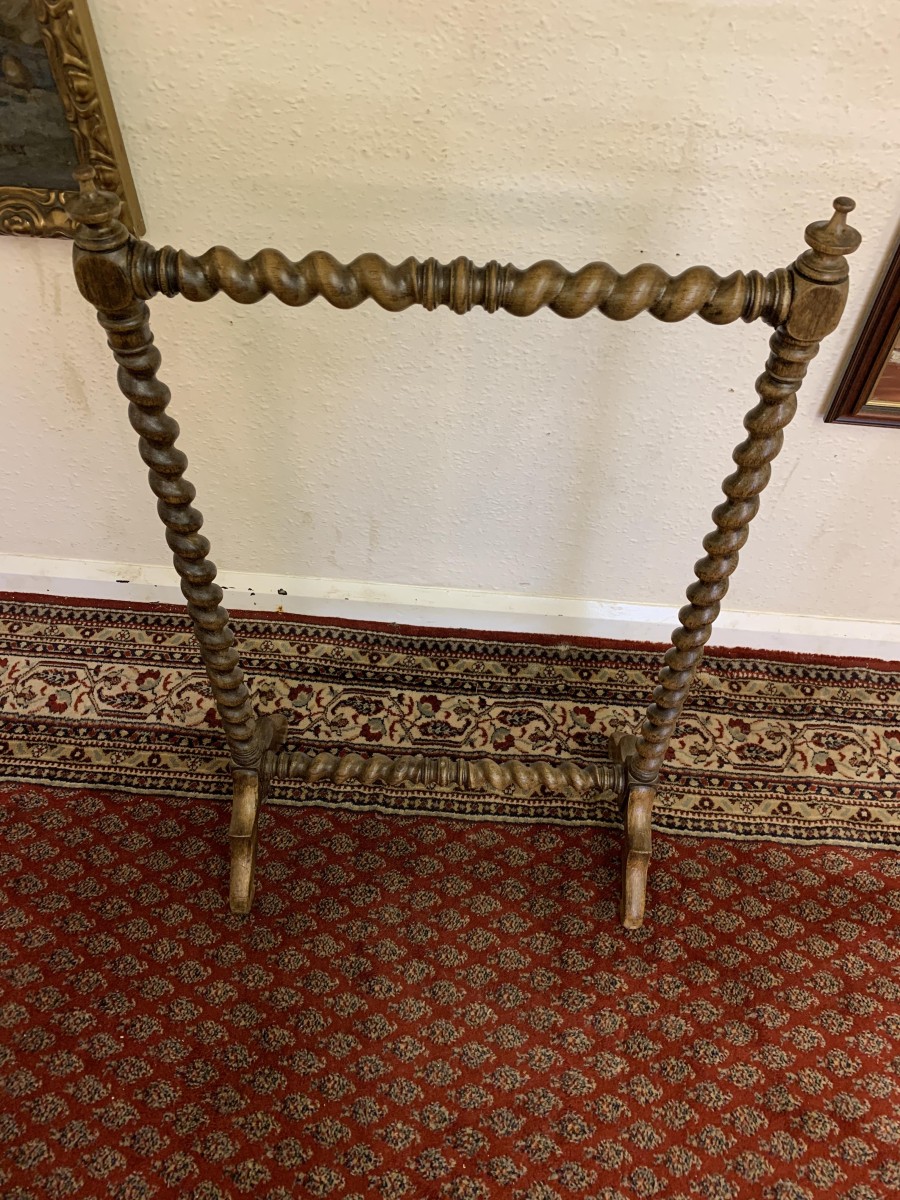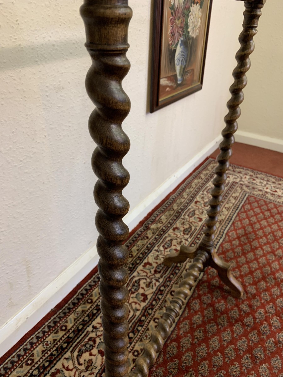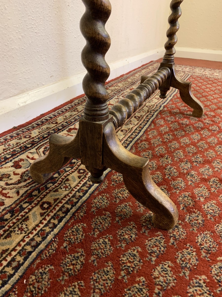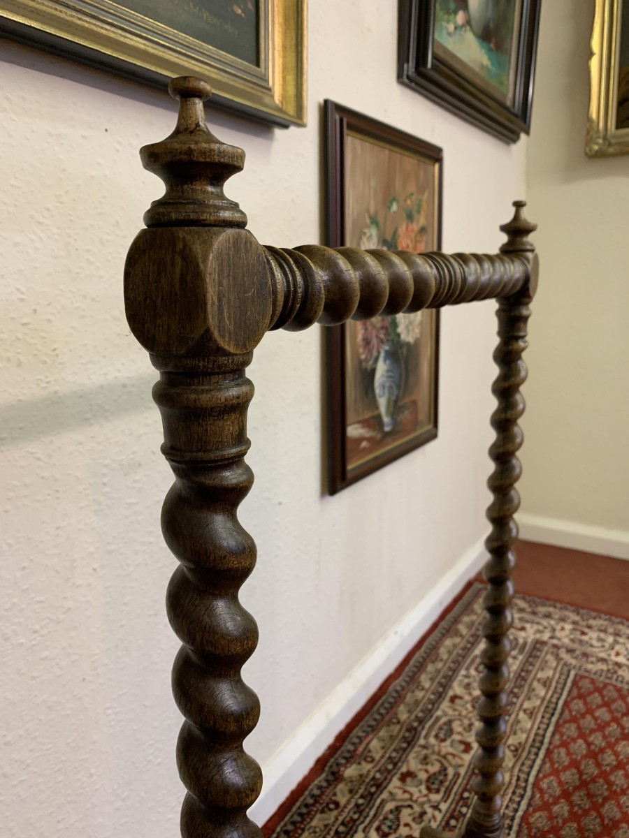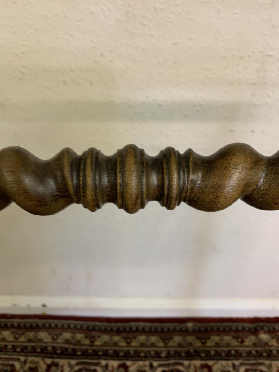 The twist arms have turned finials to the top, twist rail to the top with a twist stretcher support to the bottom and standing on outswept legs.