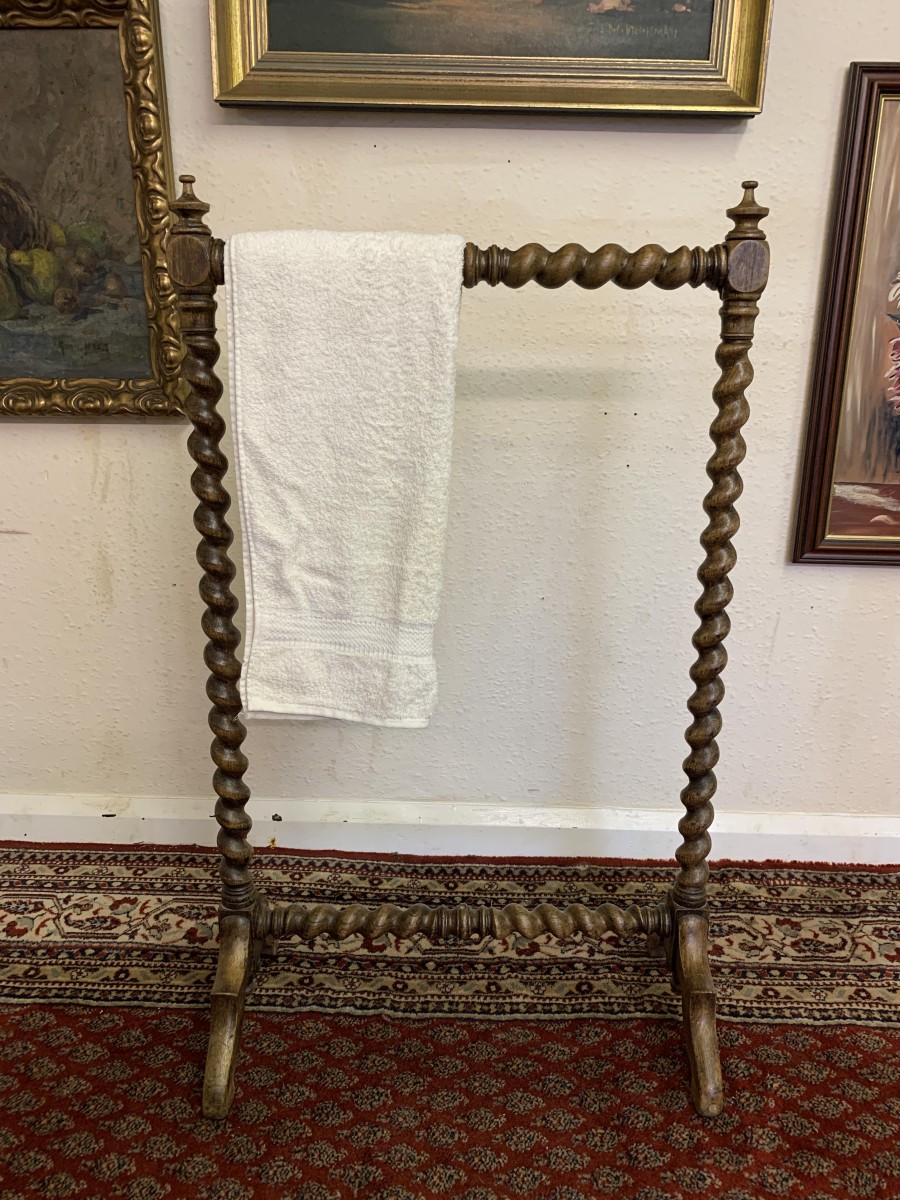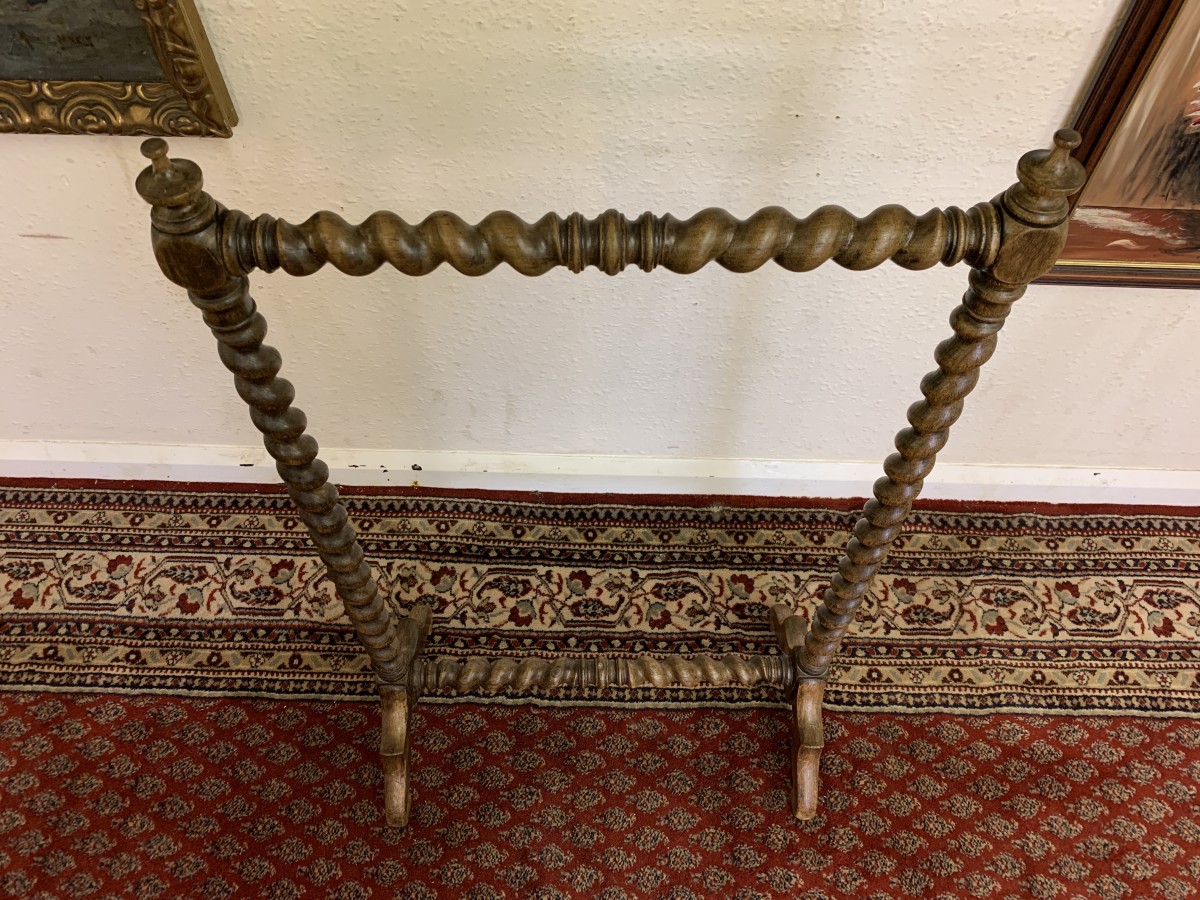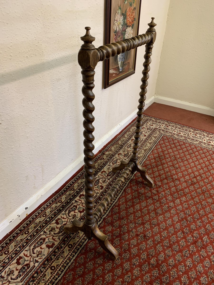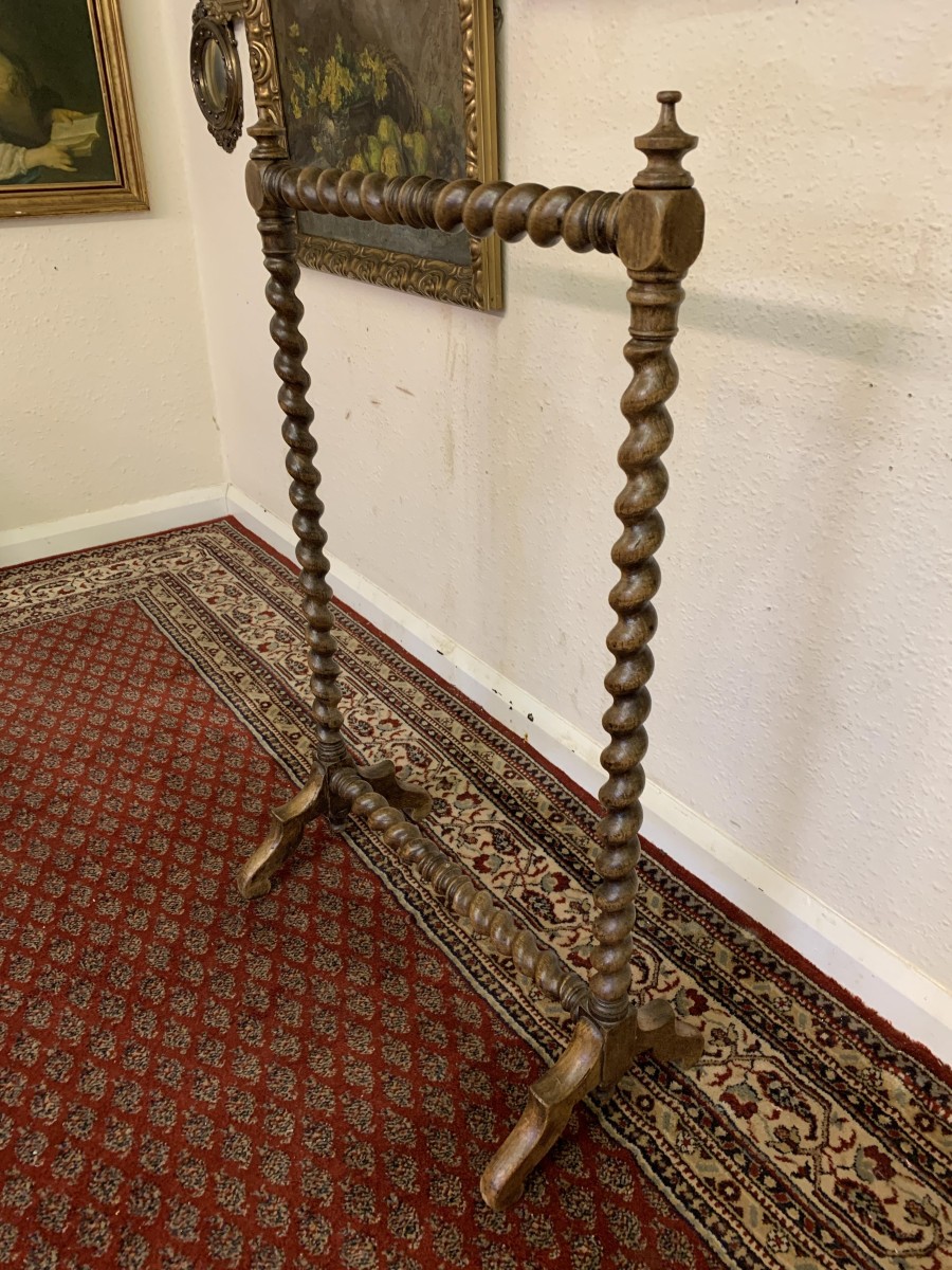 The twist arms have turned finials to the top, twist rail to the top with a twist stretcher support to the bottom and standing on outswept legs.