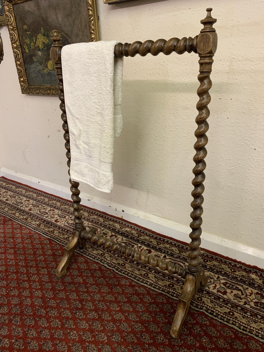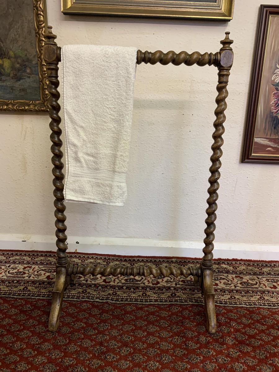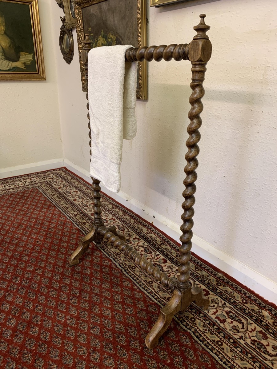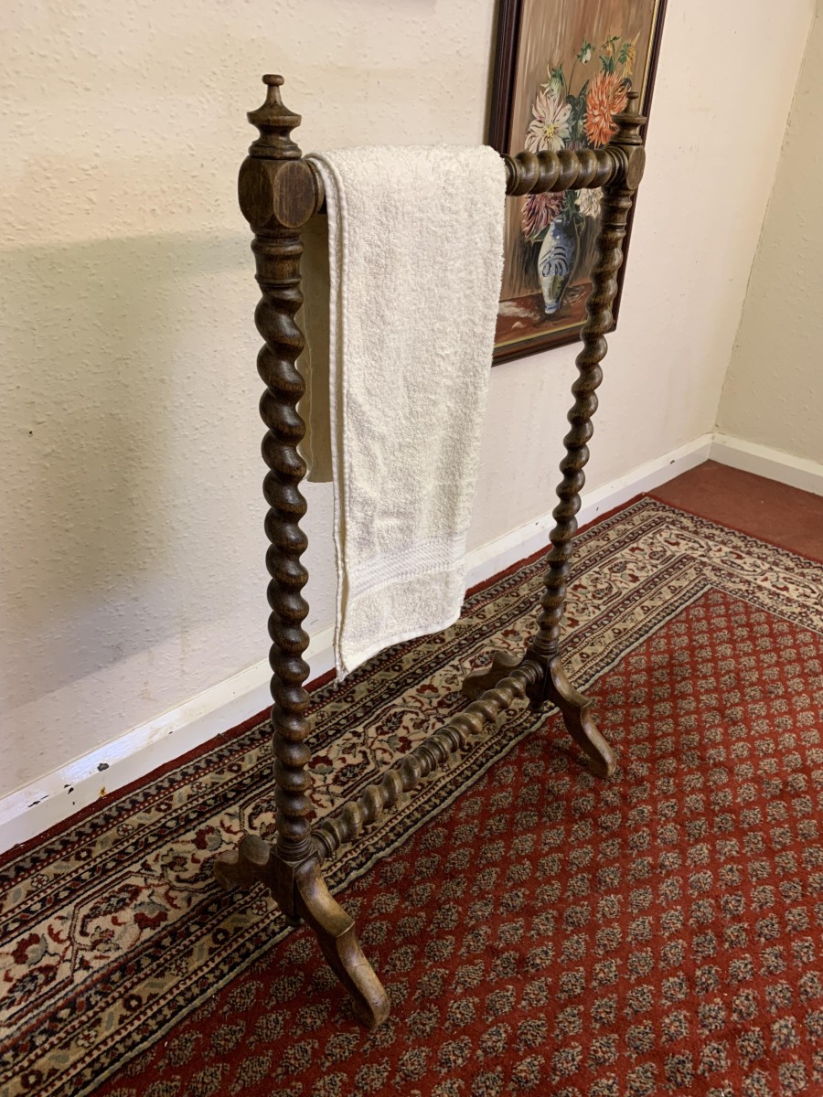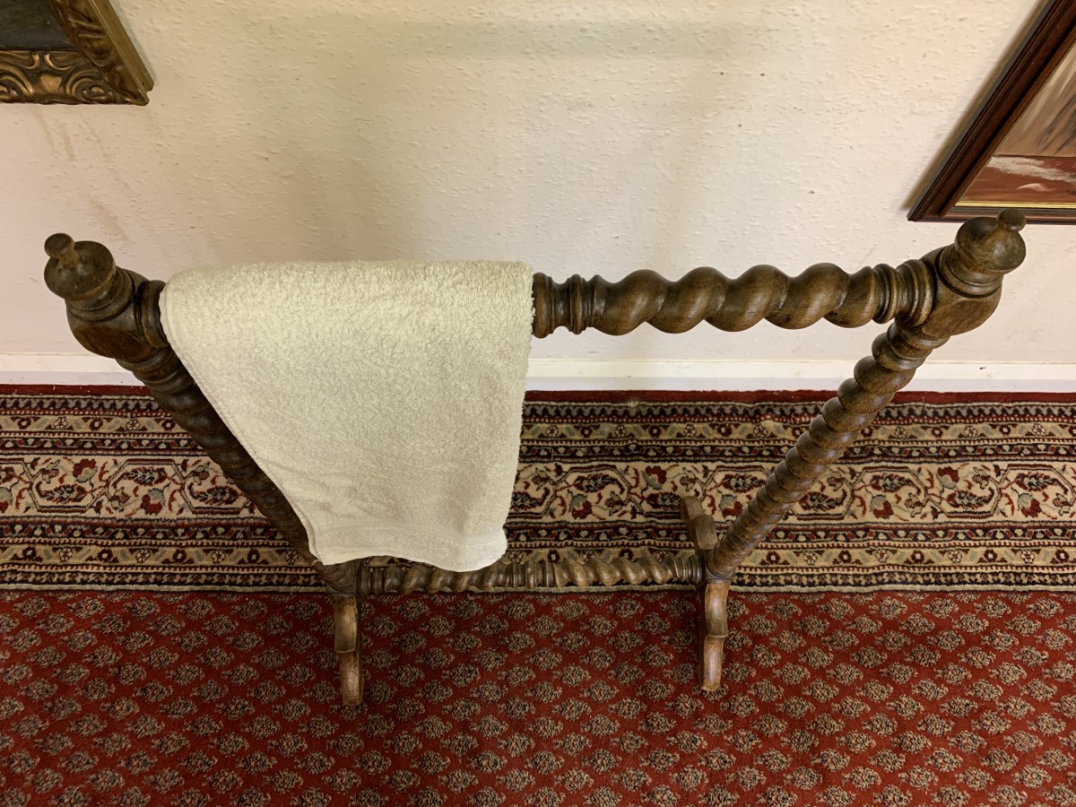 The twist arms have turned finials to the top, twist rail to the top with a twist stretcher support to the bottom and standing on outswept legs.