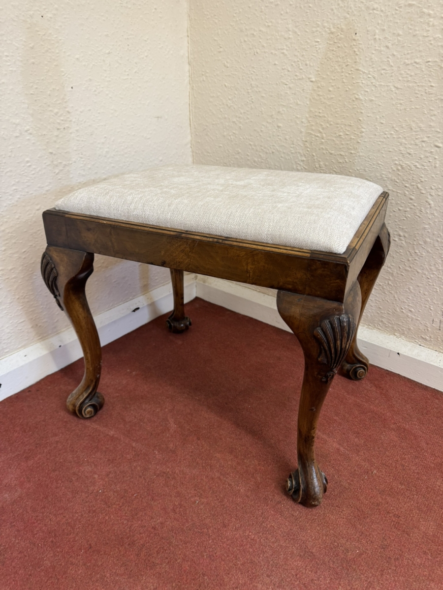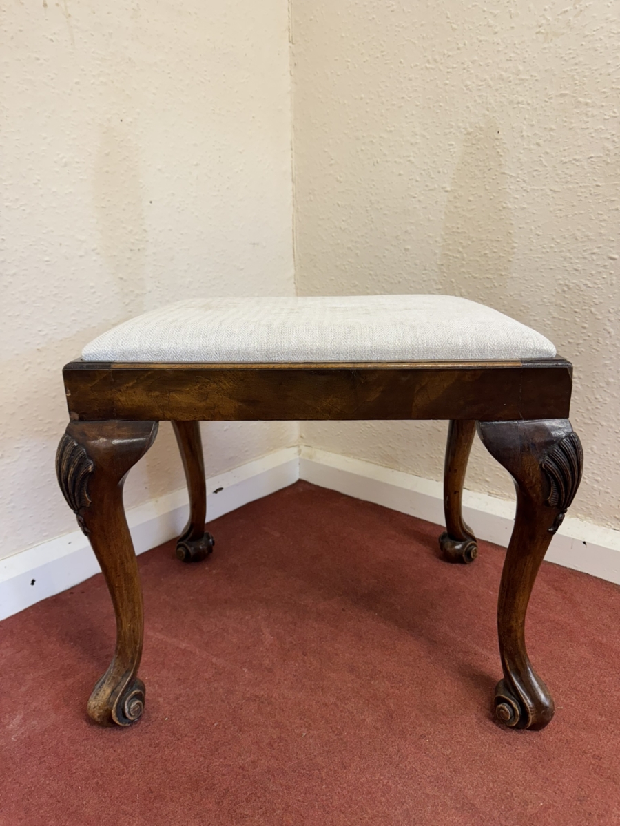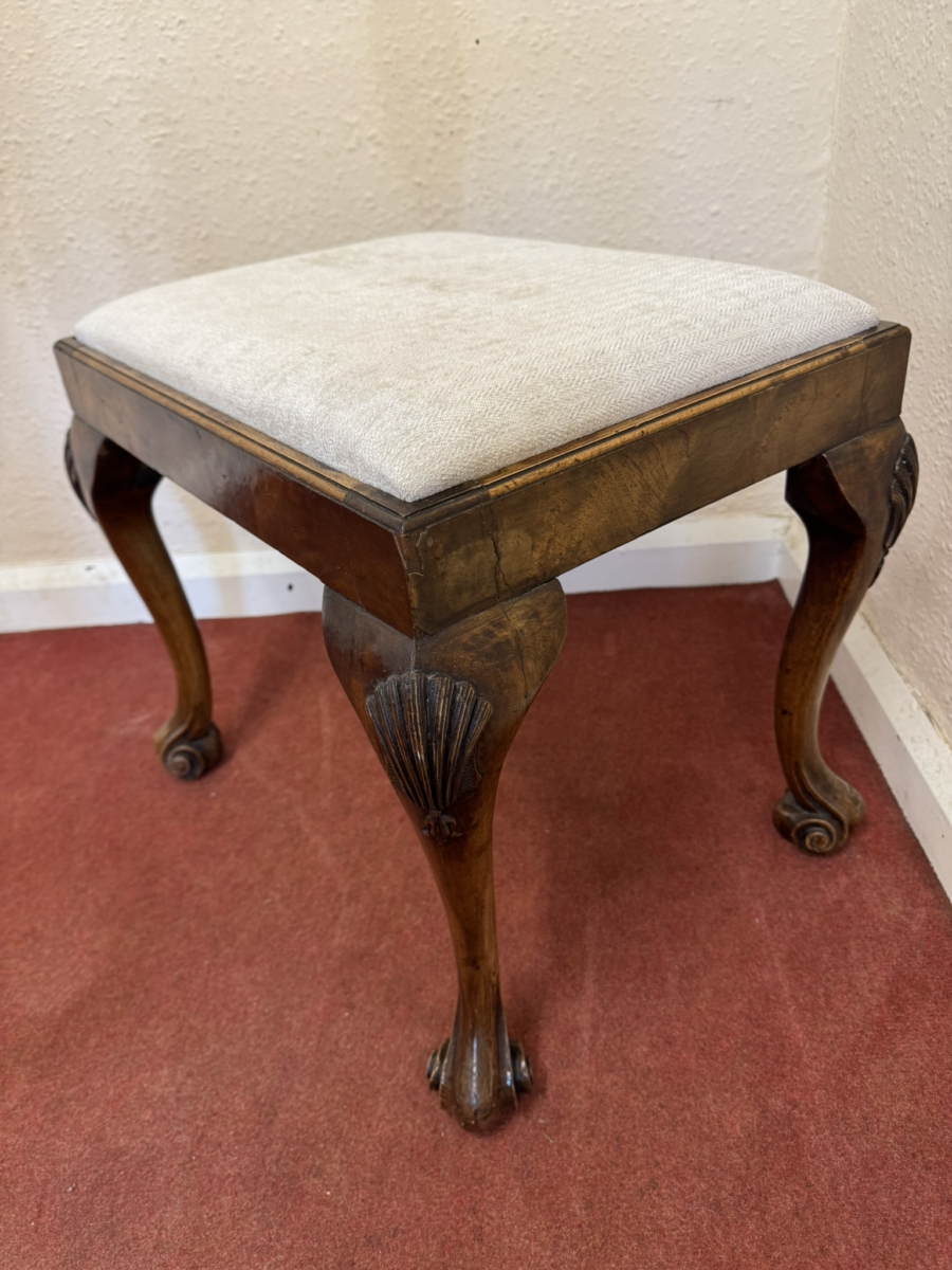 The stool dates circa 1920. With an upholstered padded seat and standing on four cabriole shaped legs with shell decoration and swirl feet.