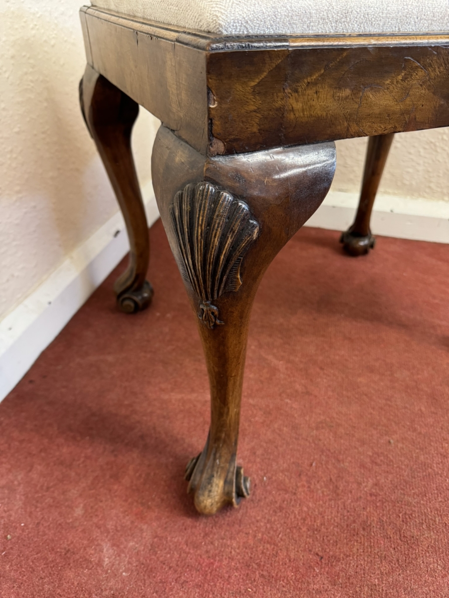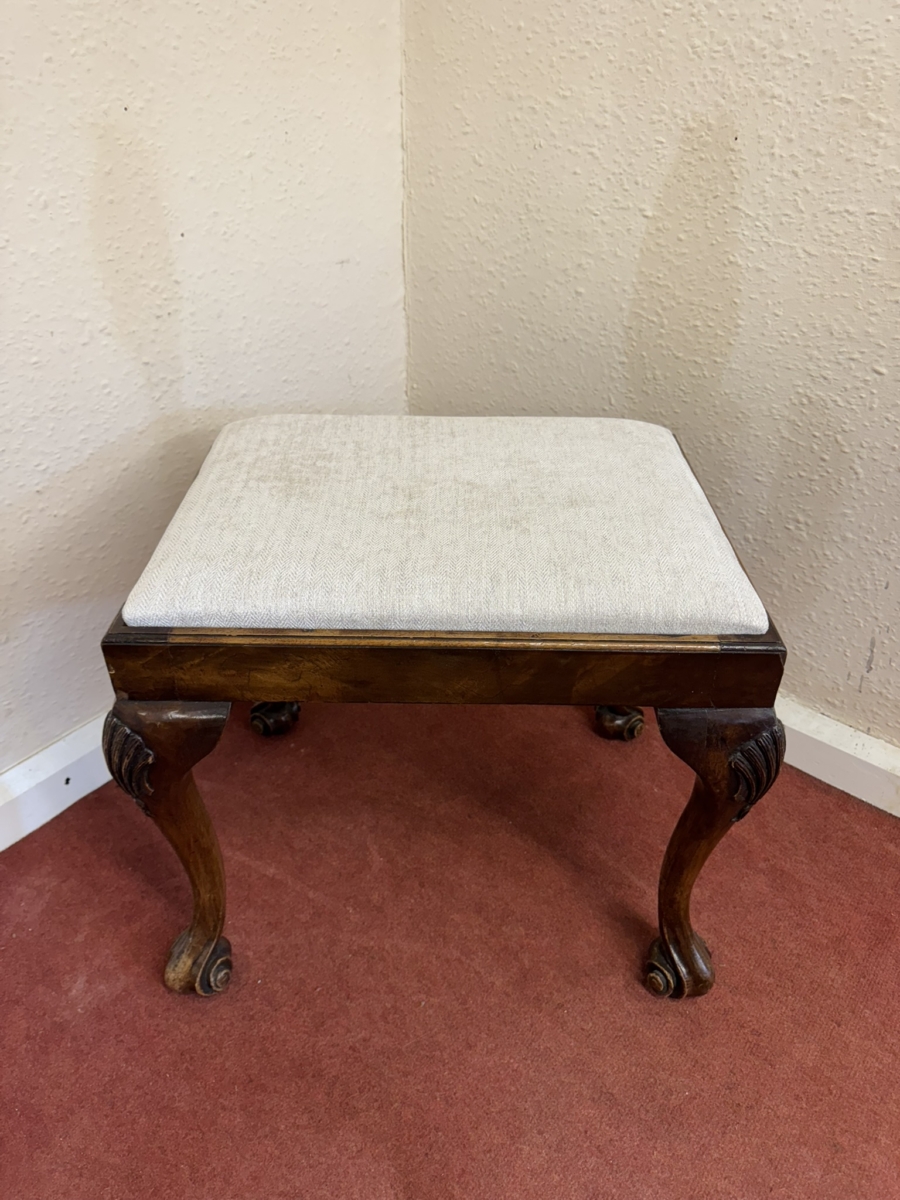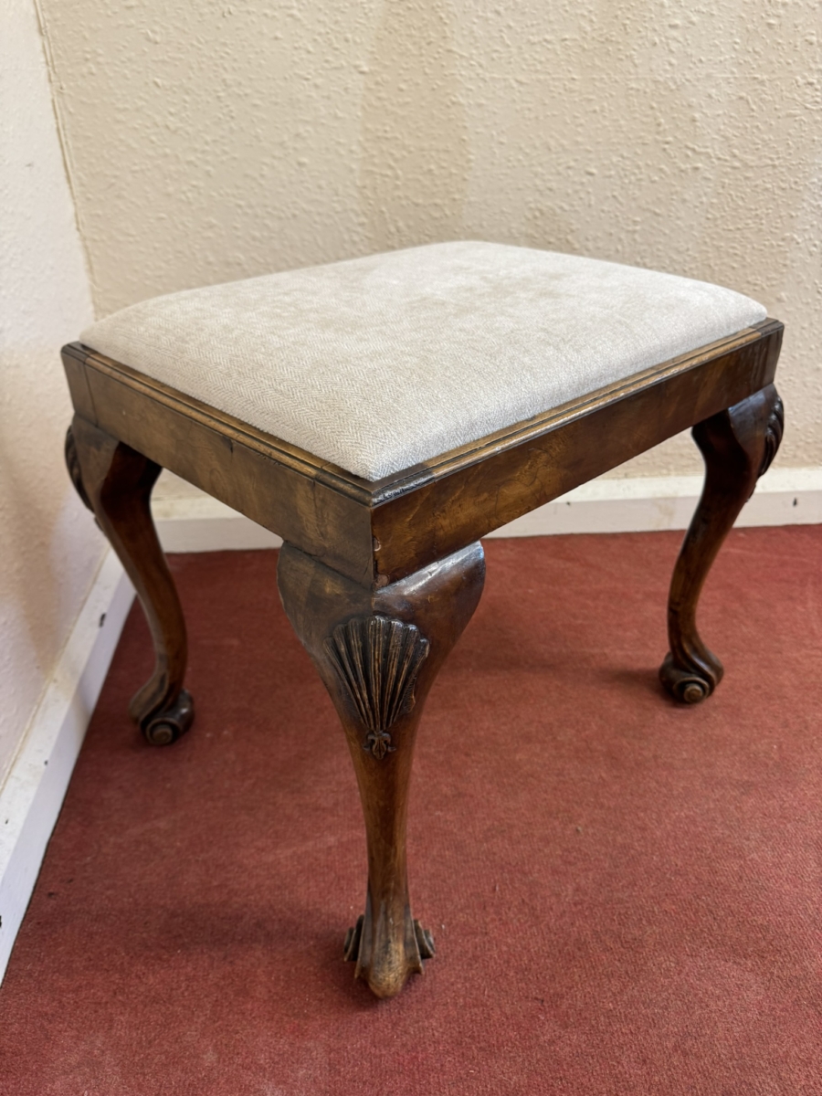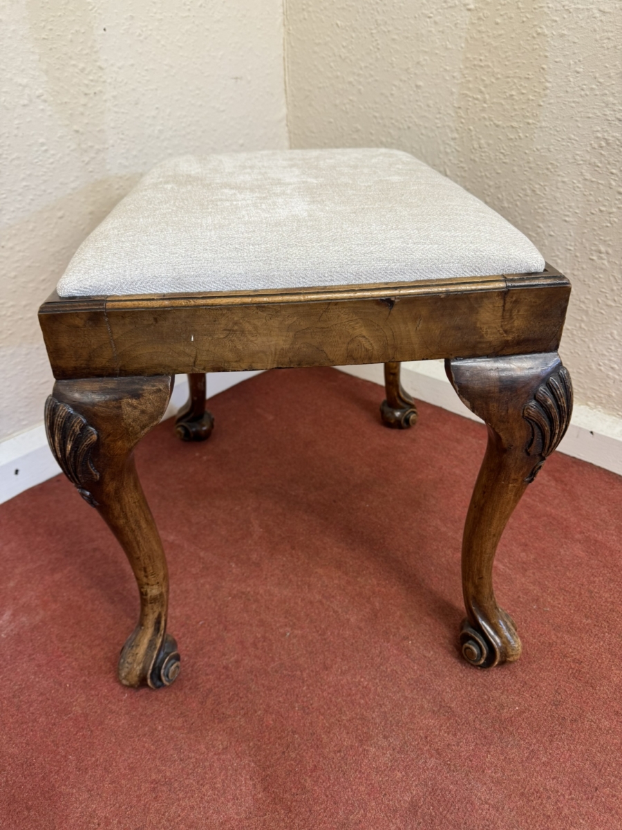 The stool dates circa 1920. With an upholstered padded seat and standing on four cabriole shaped legs with shell decoration and swirl feet.