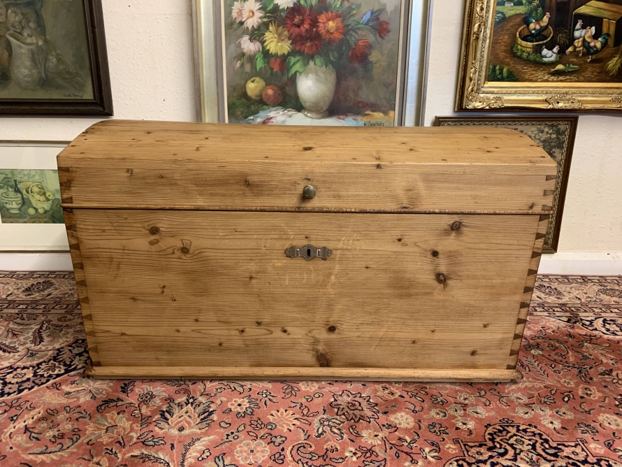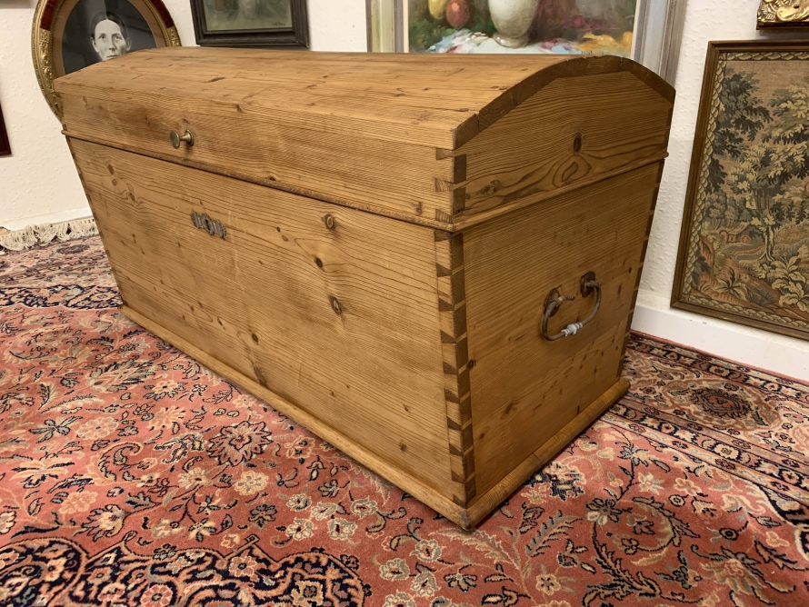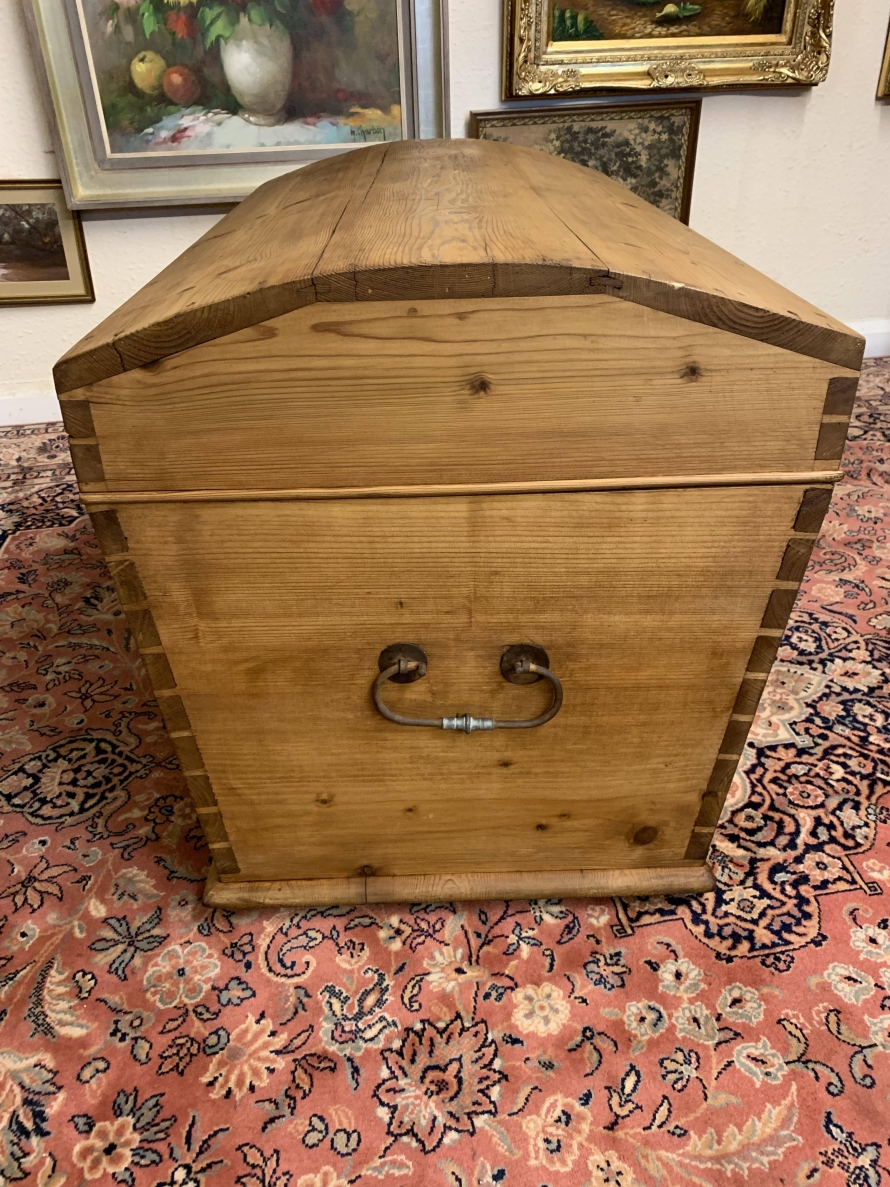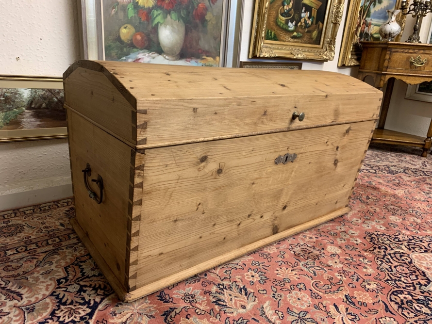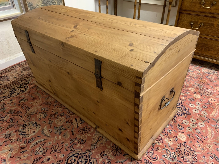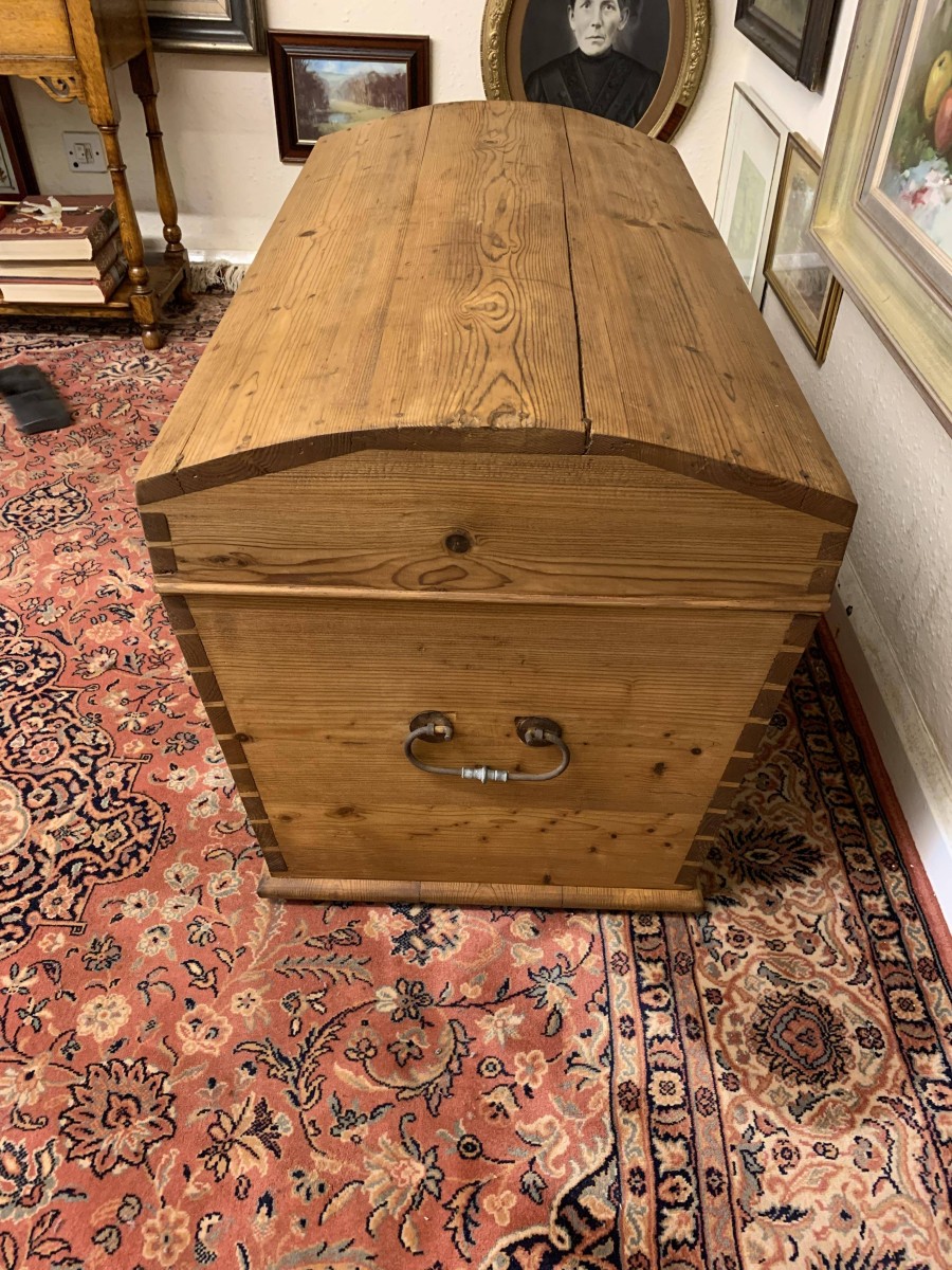 The dome top lifts to offer a good sized storage space . This trunk has brass carrying handles to the sides.