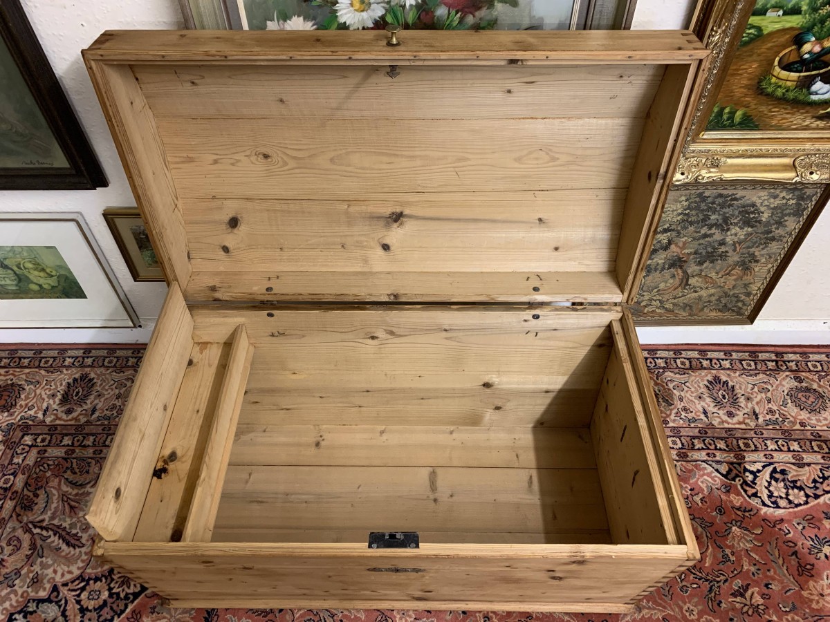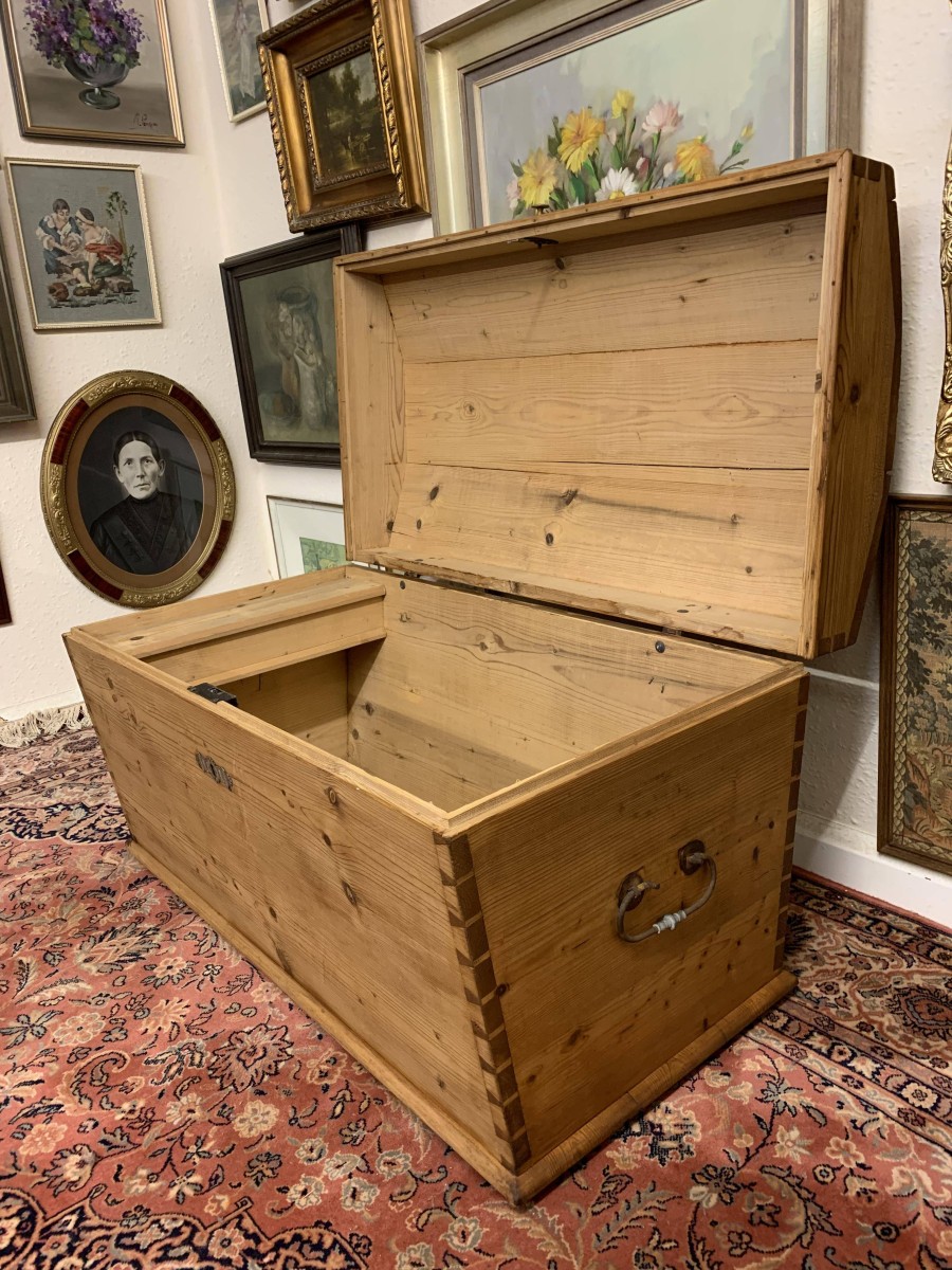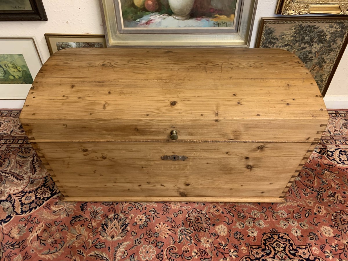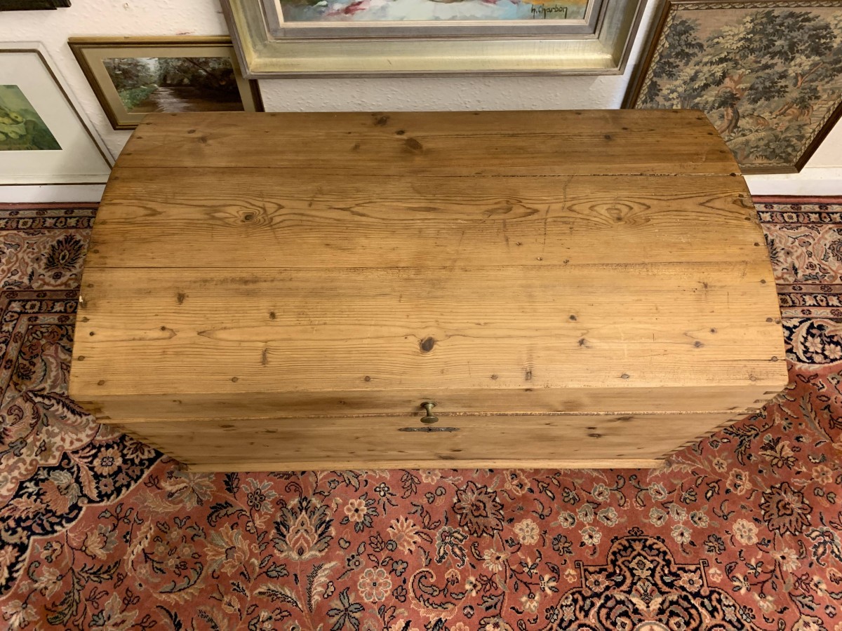 The dome top lifts to offer a good sized storage space . This trunk has brass carrying handles to the sides.