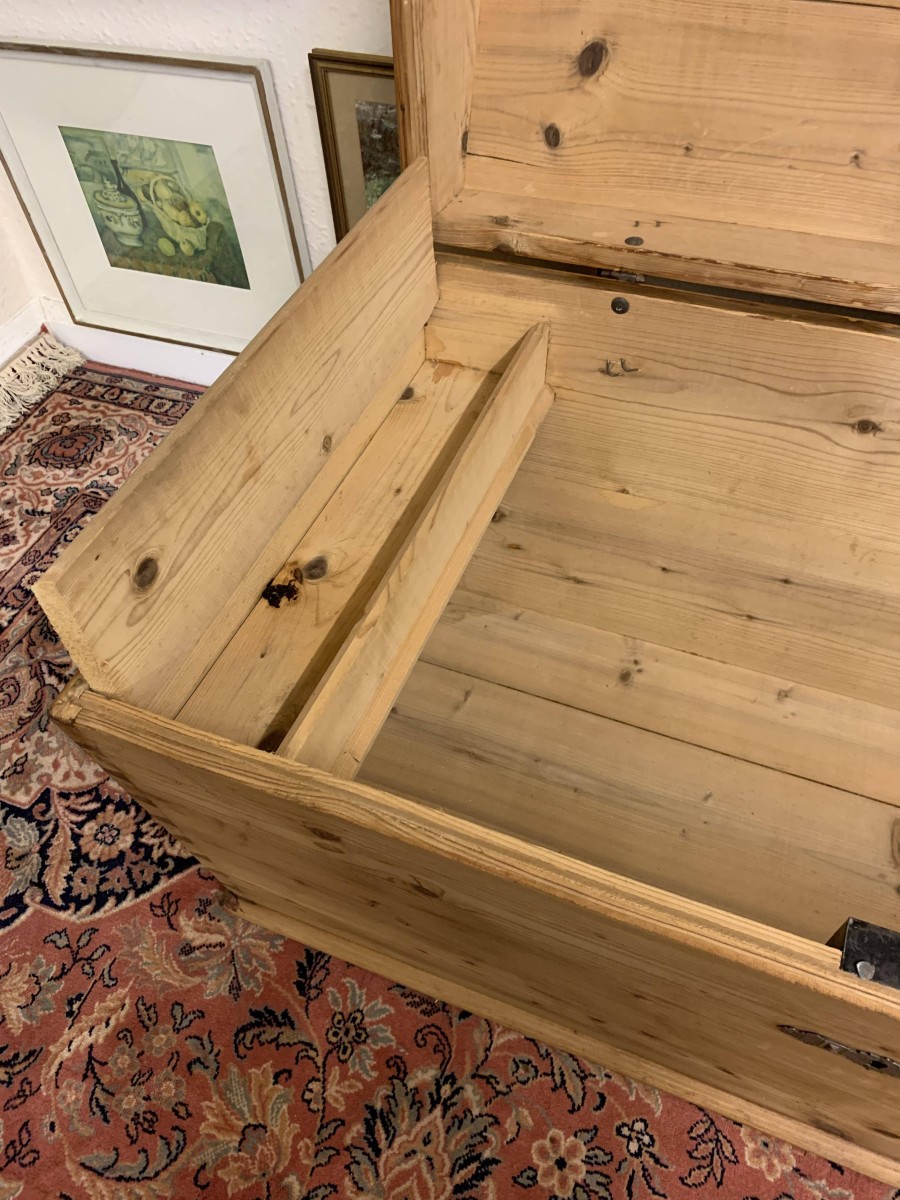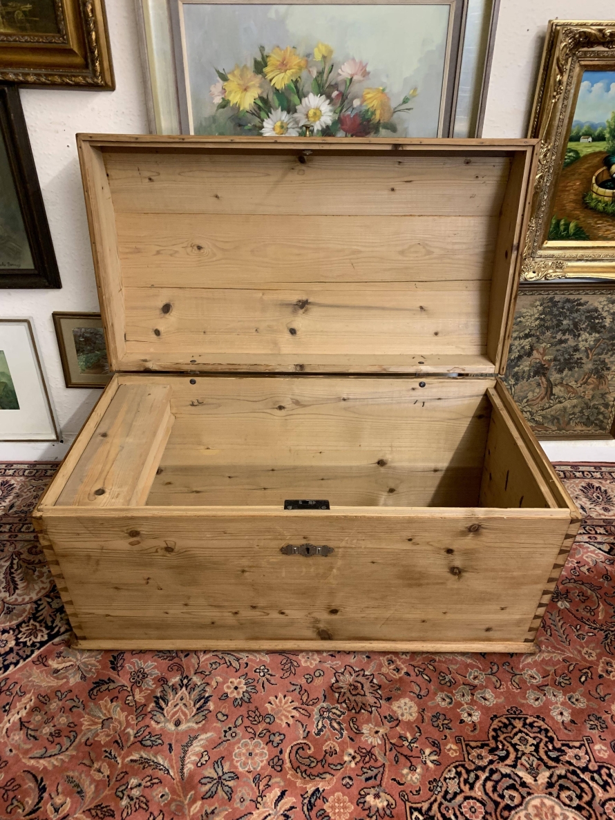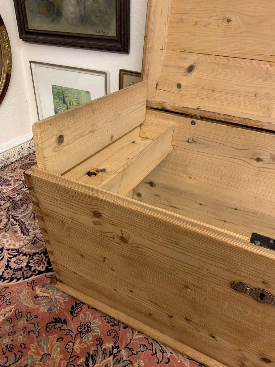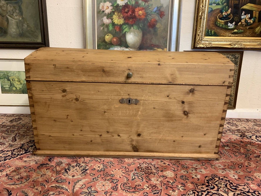 The dome top lifts to offer a good sized storage space . This trunk has brass carrying handles to the sides.