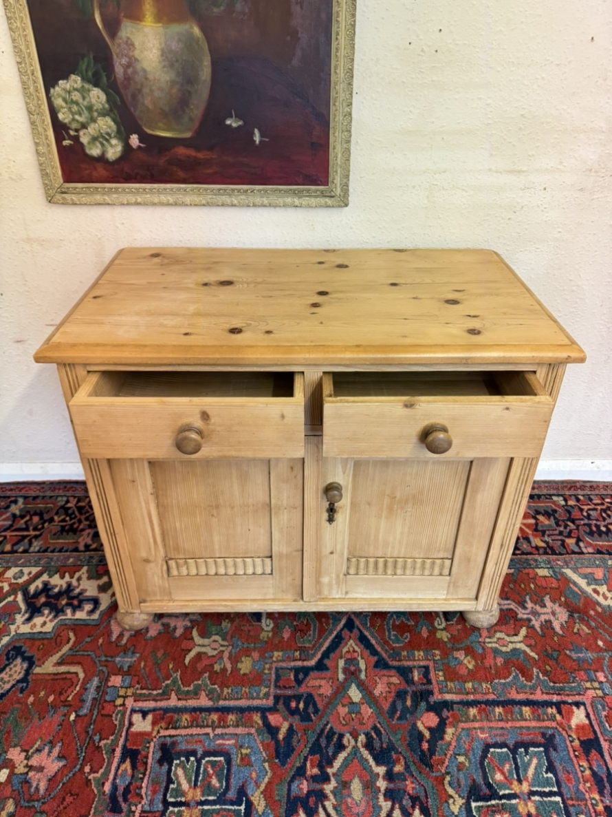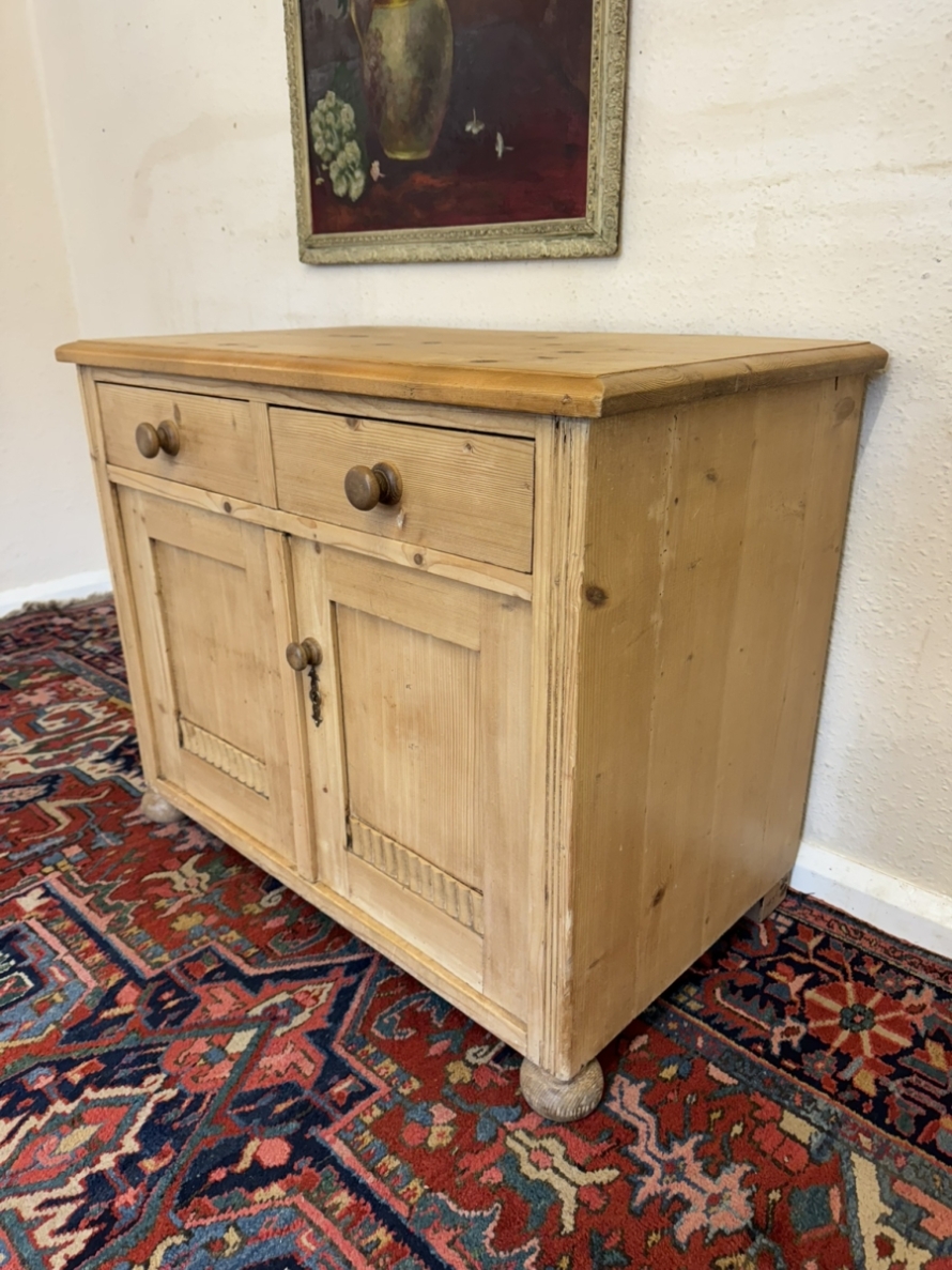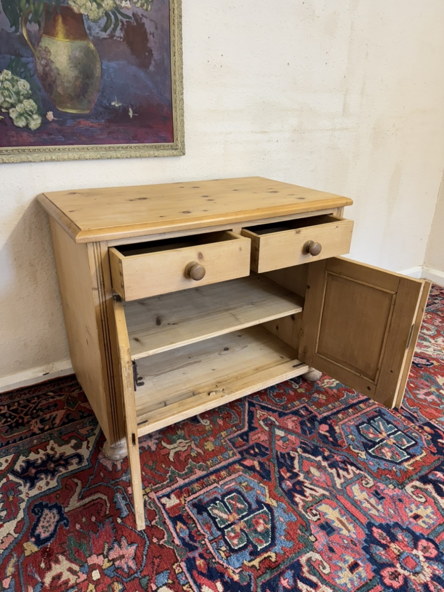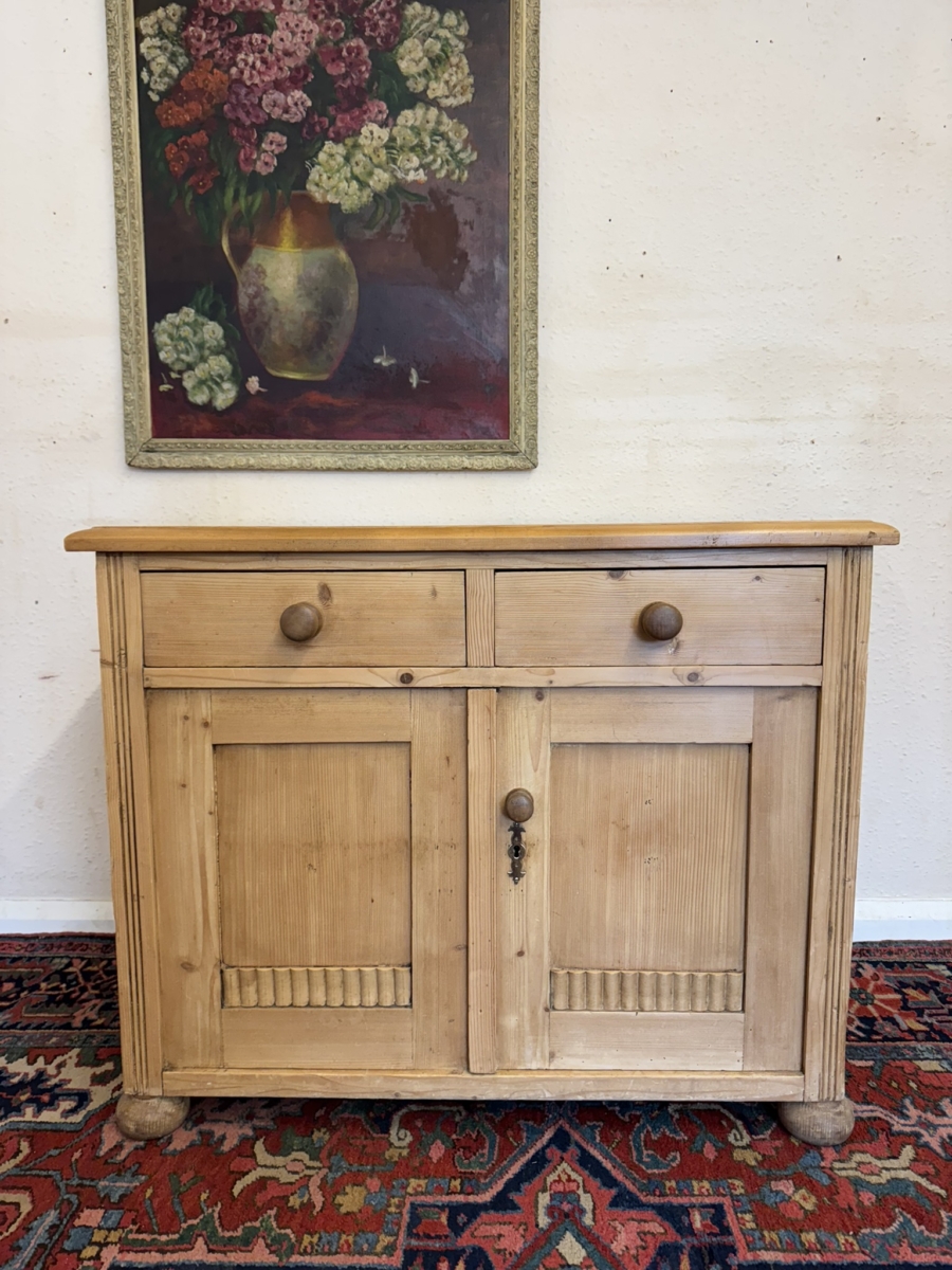 The grained oversailing top sits above two drawers each drawer having a turn knob handle, below are a pair of recessed panelled cupboard doors, the doors open to reveal a removable shelf. This fabulous cupboard stands on two bun feet to the front.