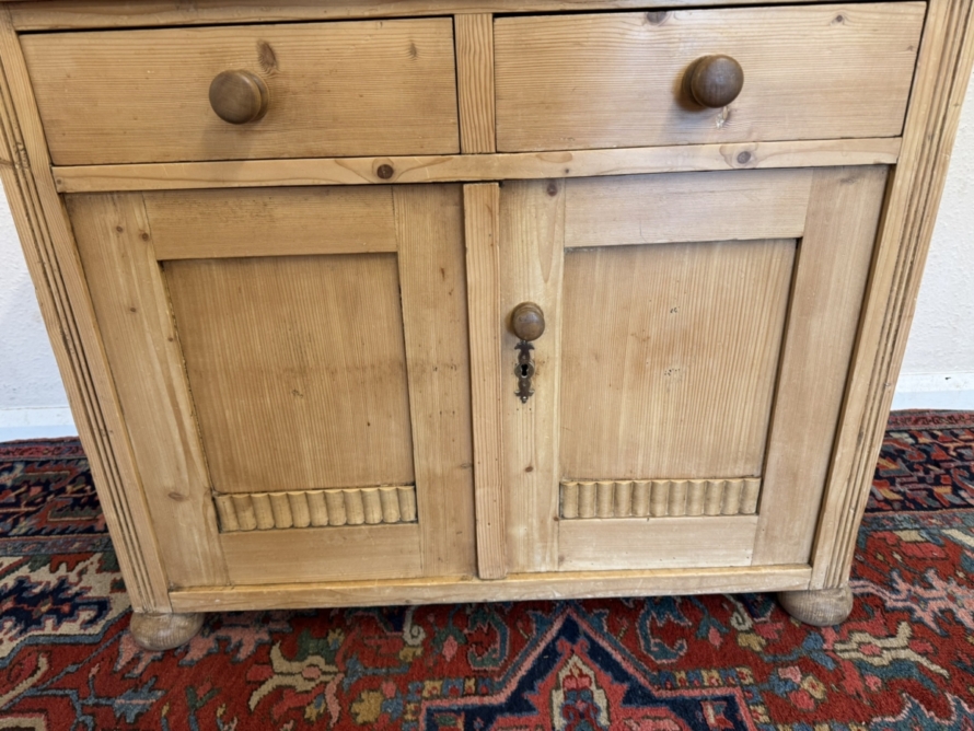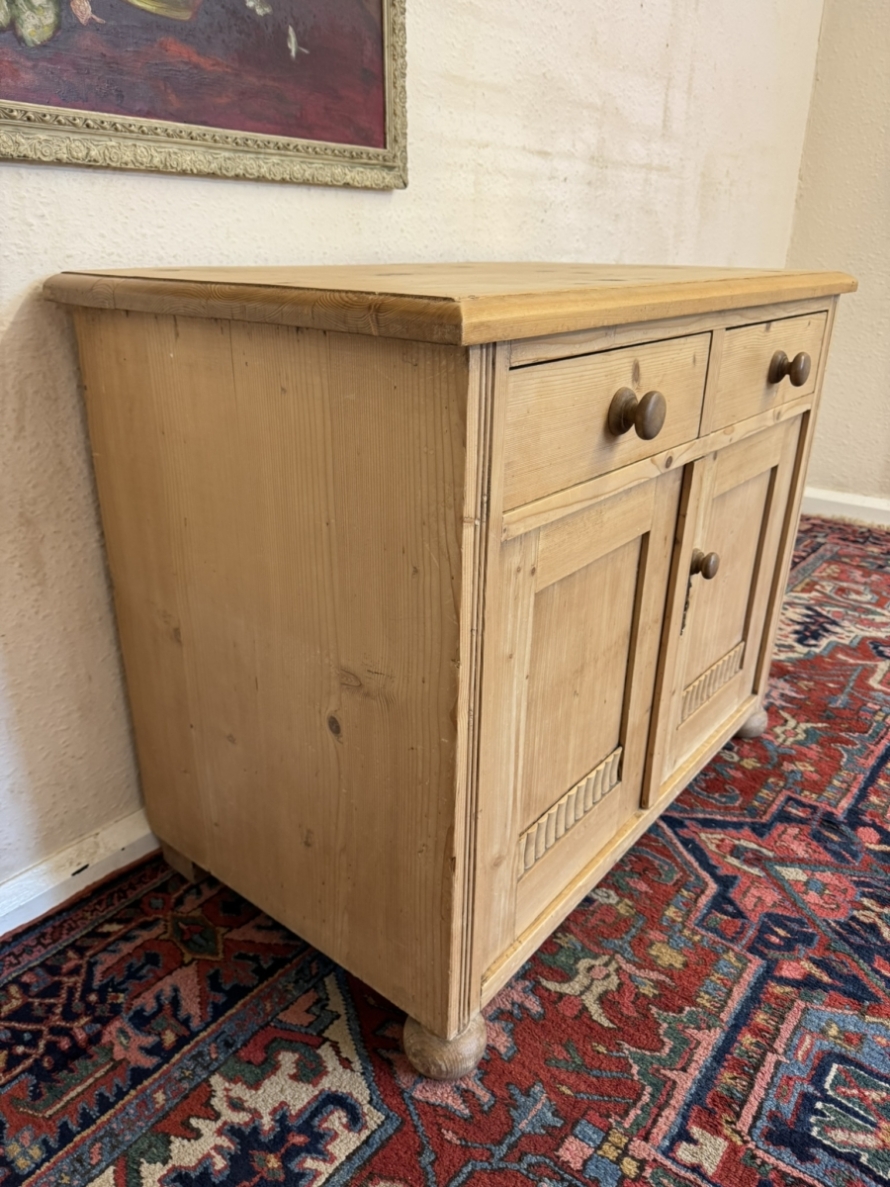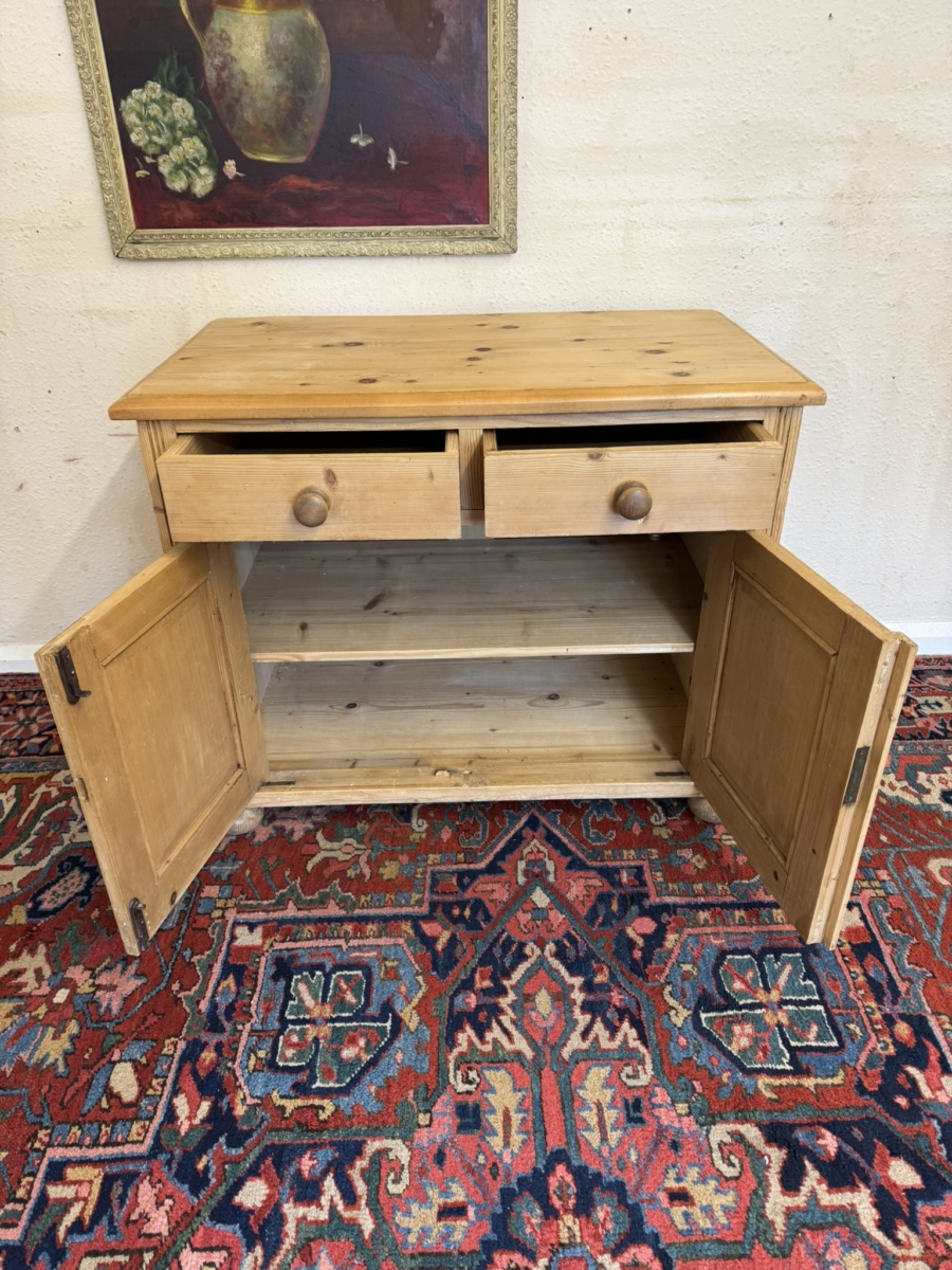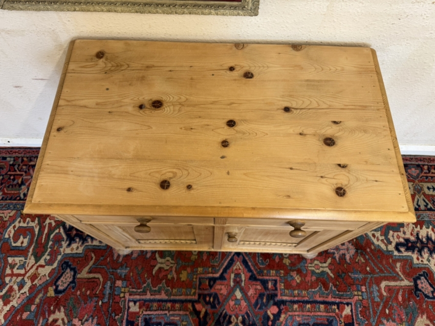 The grained oversailing top sits above two drawers each drawer having a turn knob handle, below are a pair of recessed panelled cupboard doors, the doors open to reveal a removable shelf. This fabulous cupboard stands on two bun feet to the front.
