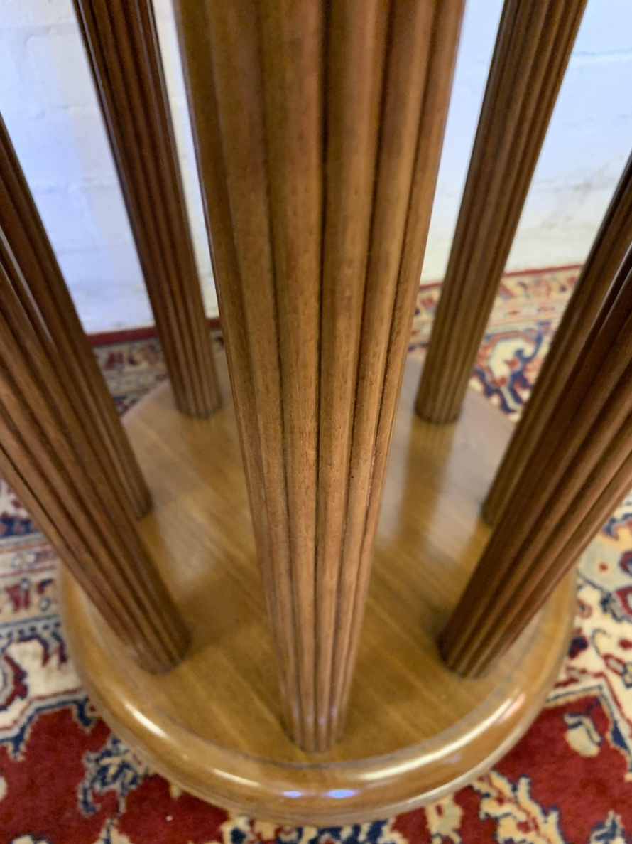 This stylish Art Deco stand dates circa 1920. The round marble top having a carved sunburst edge. Below are eight stylish fluted column supports which sit on a round base. The table stands on four fluted feet supports.
