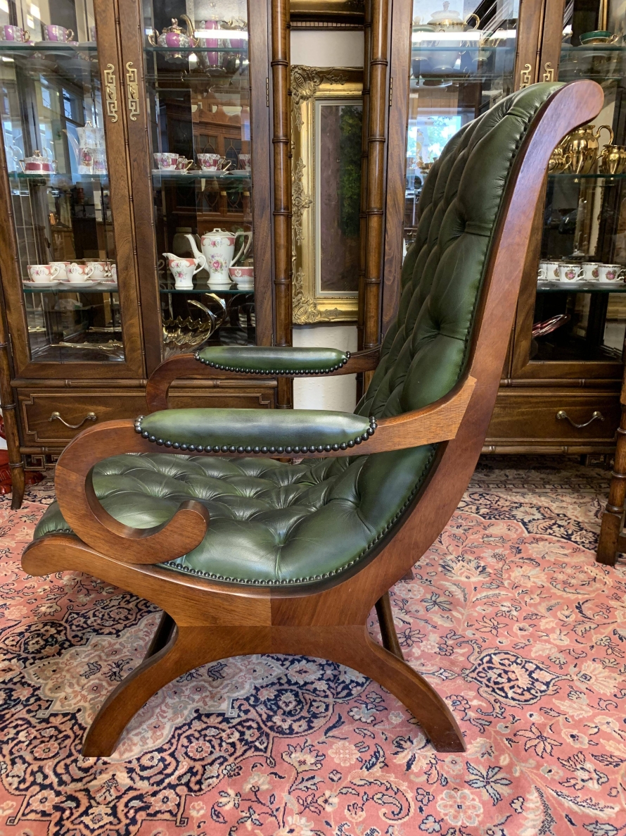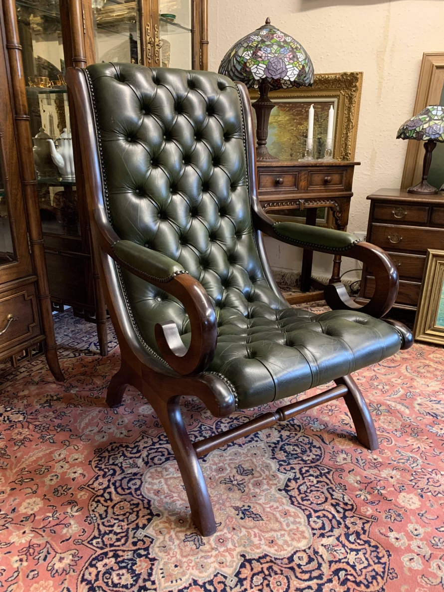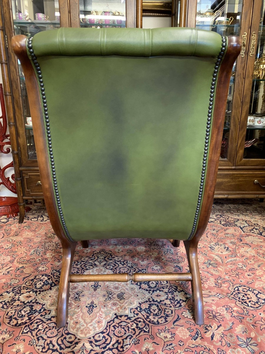 Fabulous Buttoned Antique Green Leather Mahogany Chesterfield Slipper Chair – Now Sold