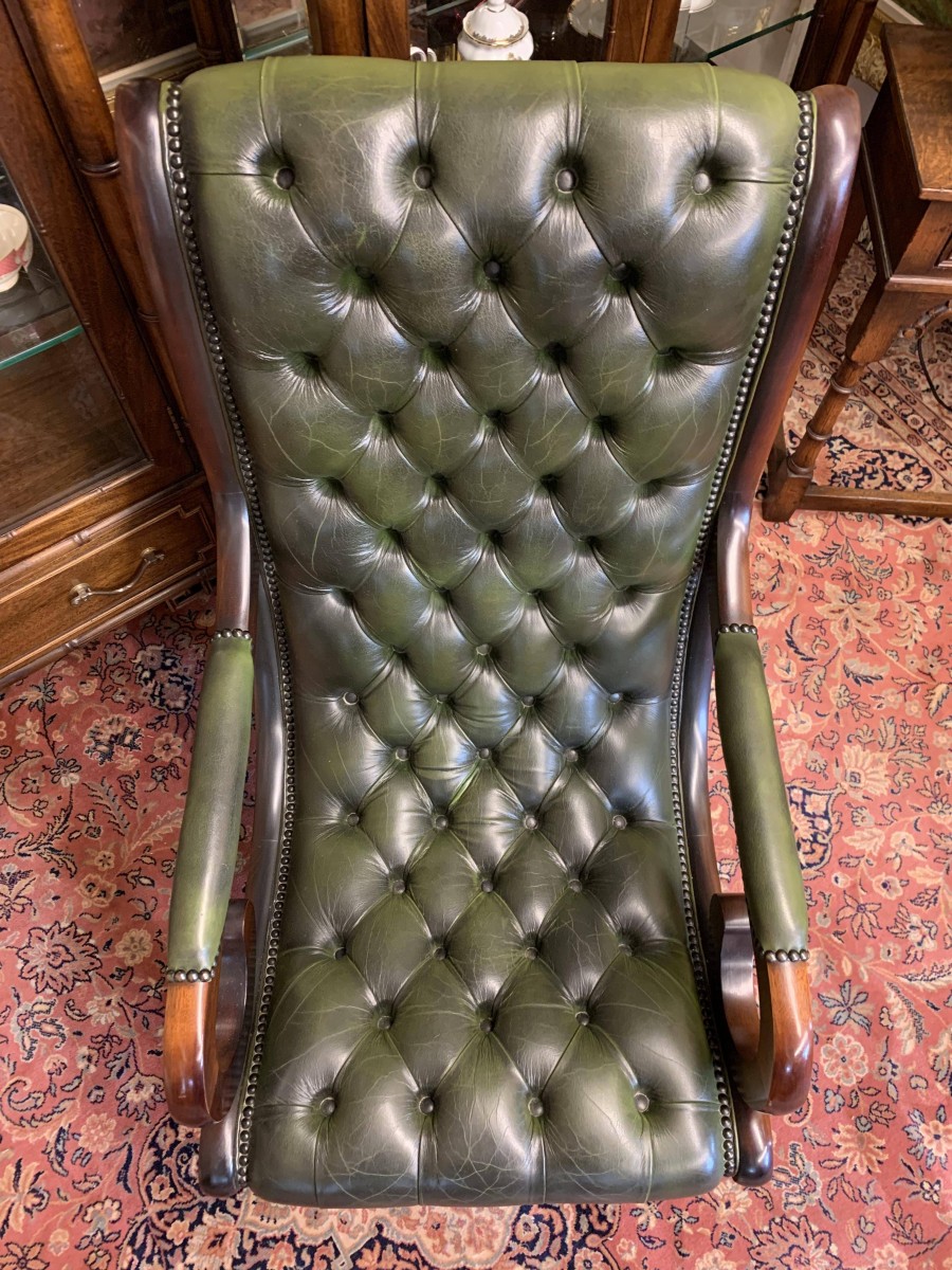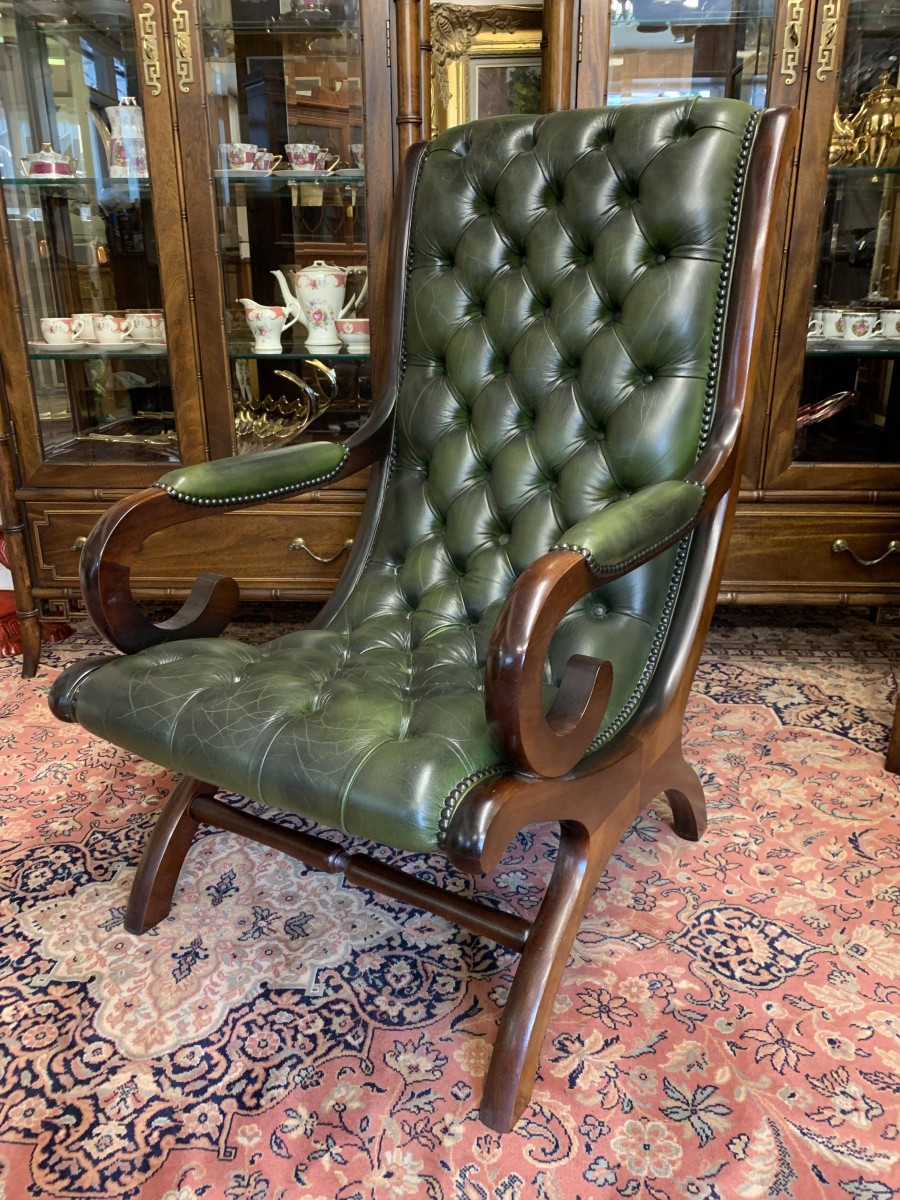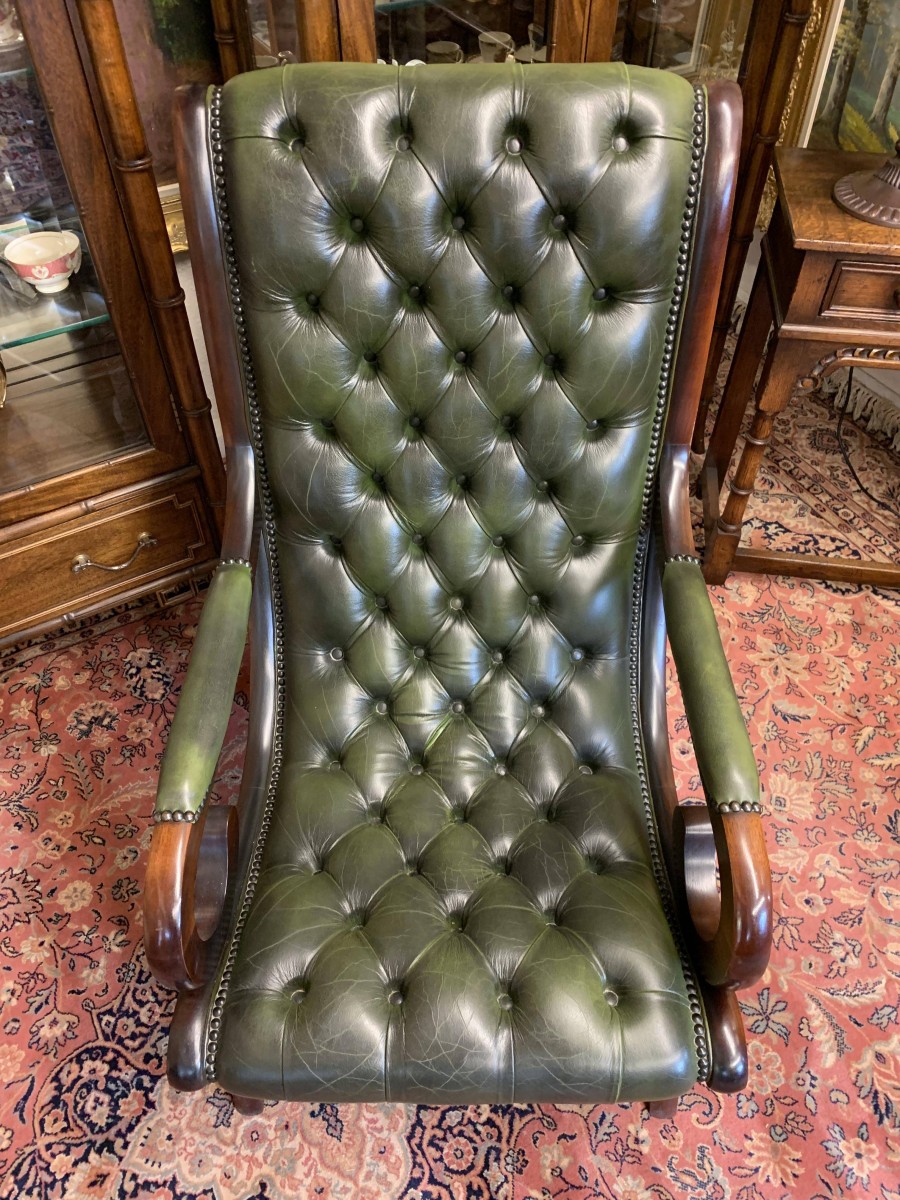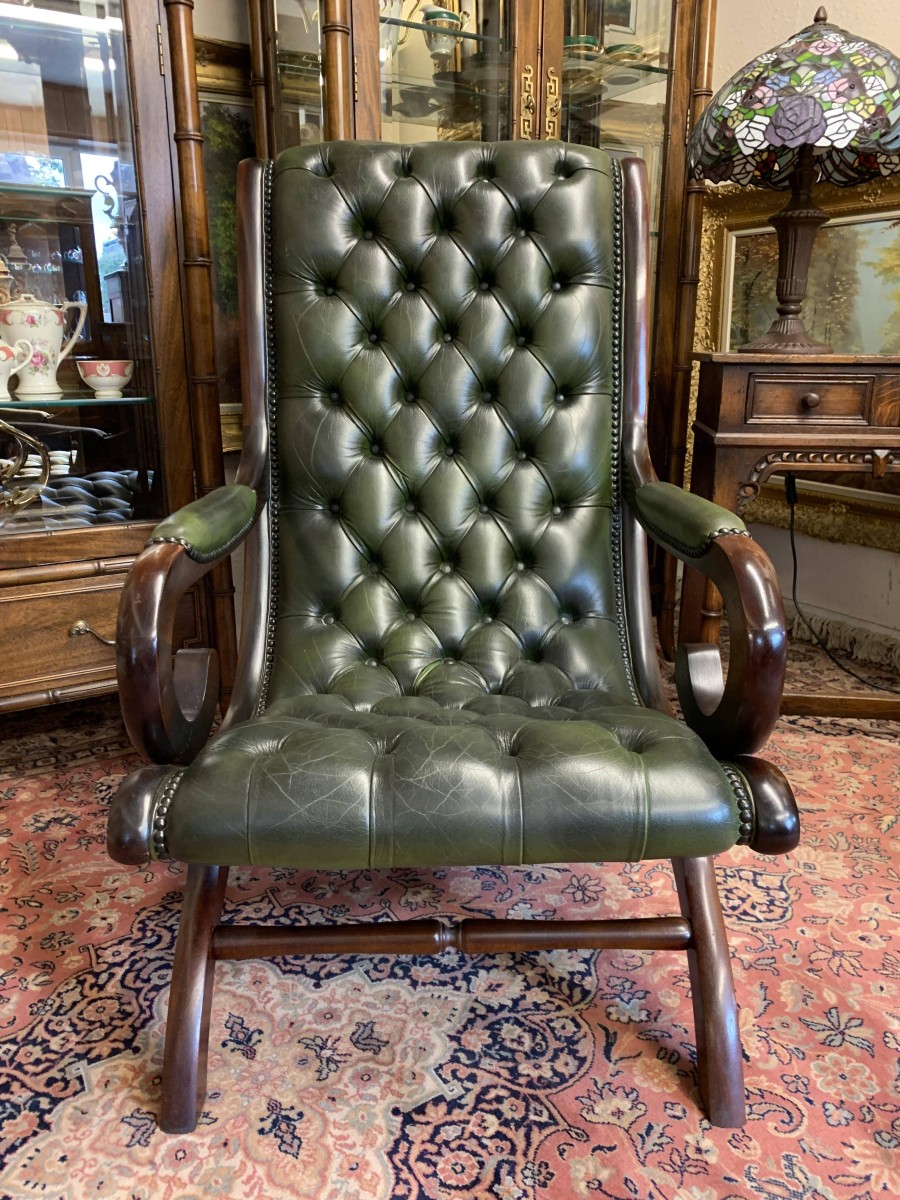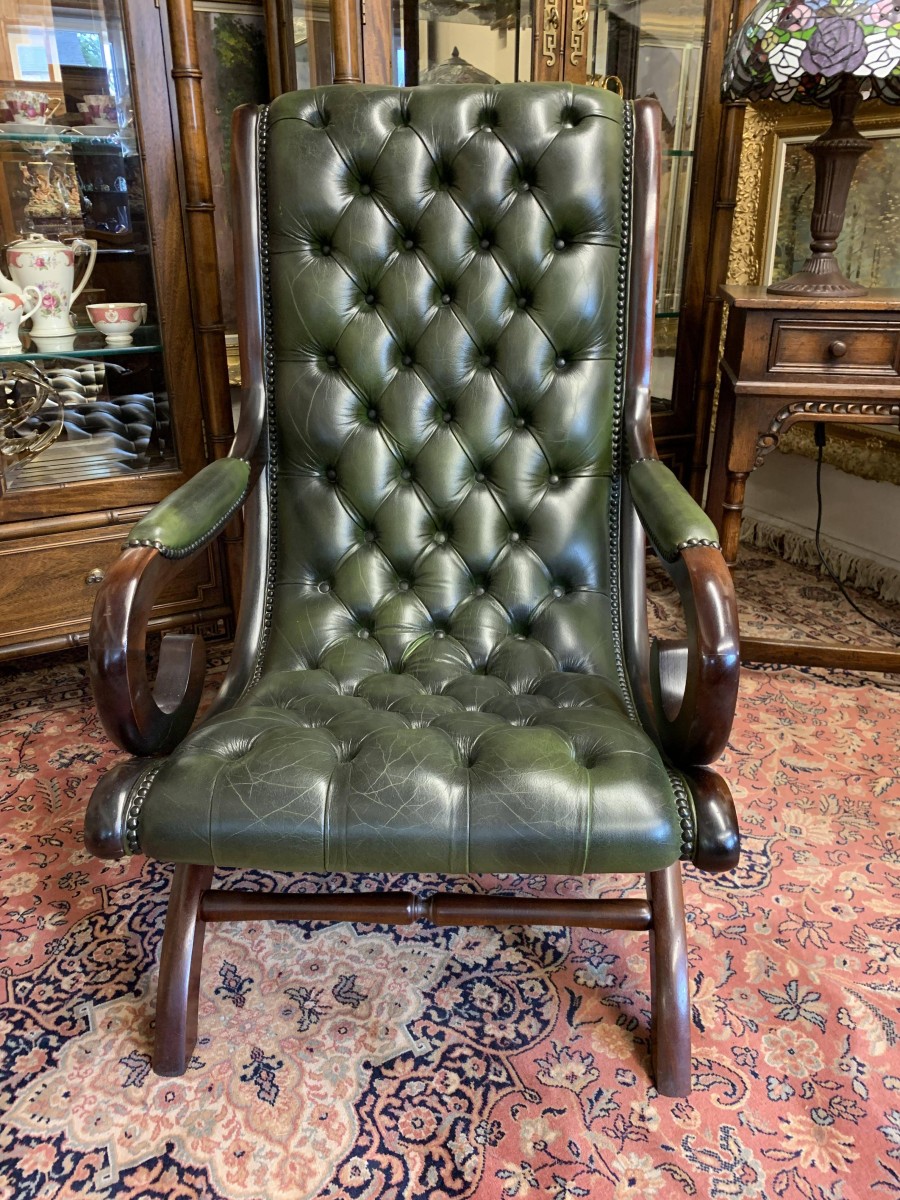 - Fabulous Buttoned Antique Green Leather Mahogany Chesterfield Slipper Chair – Now Sold