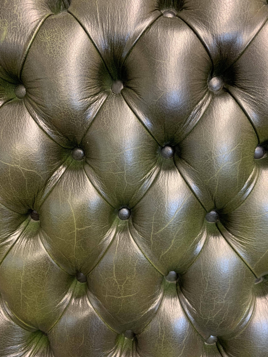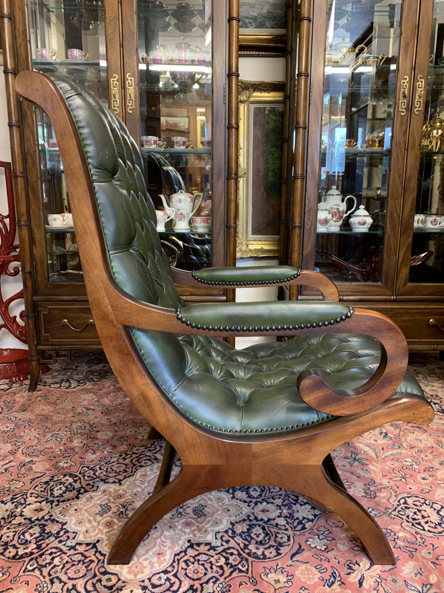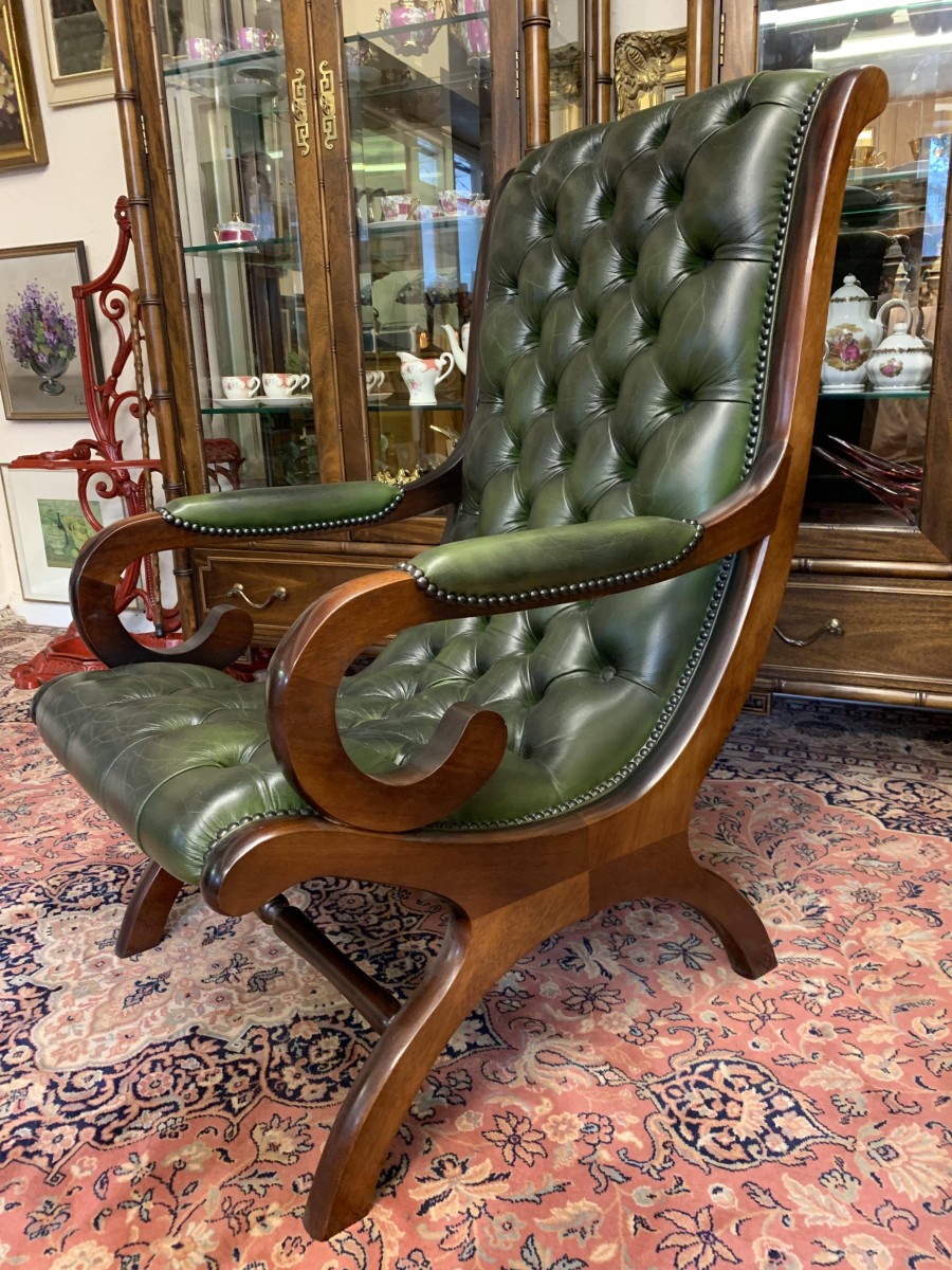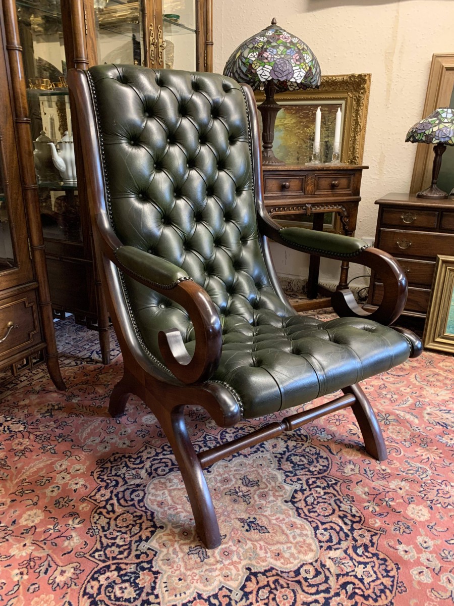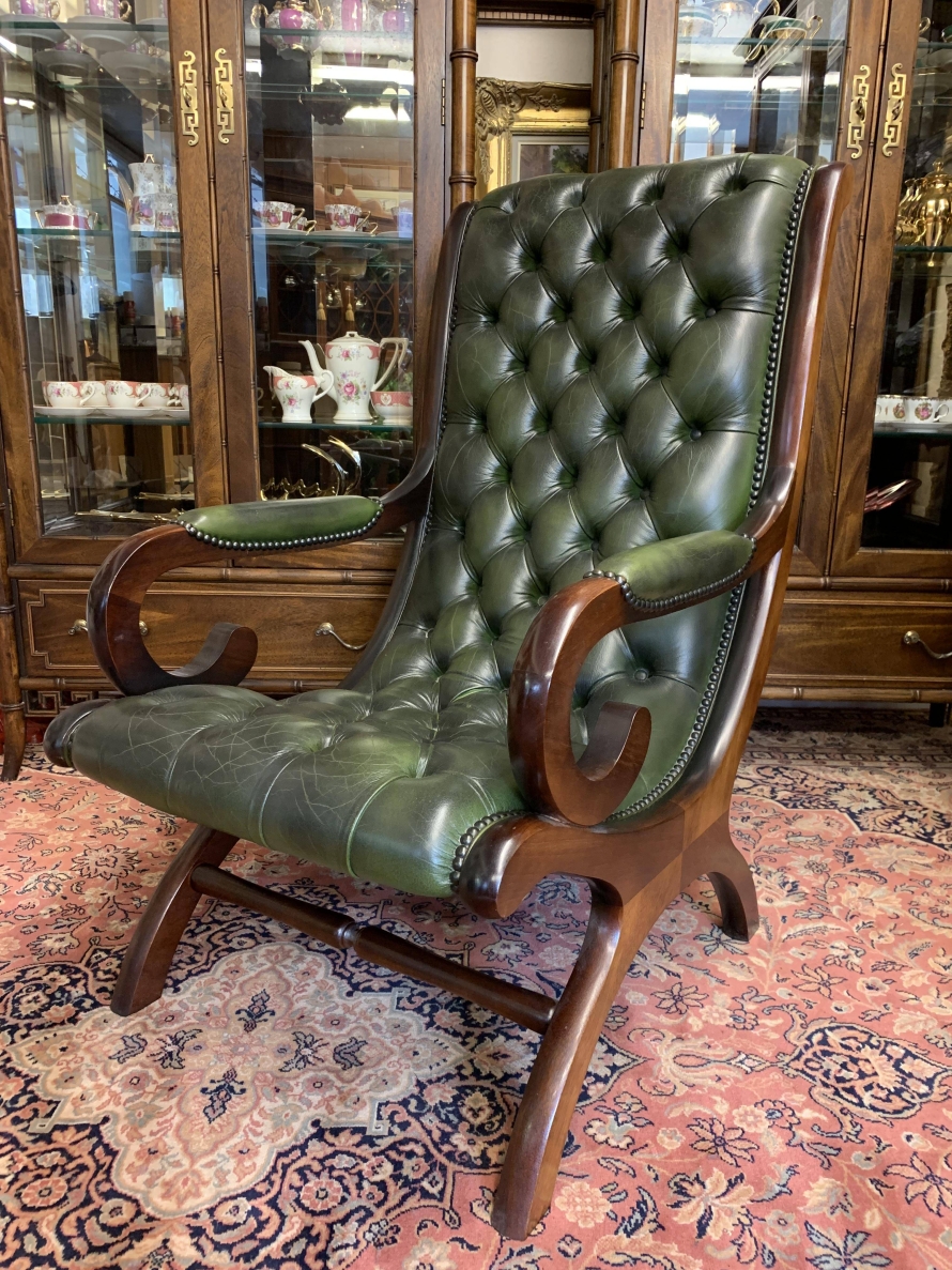 - Fabulous Buttoned Antique Green Leather Mahogany Chesterfield Slipper Chair – Now Sold
