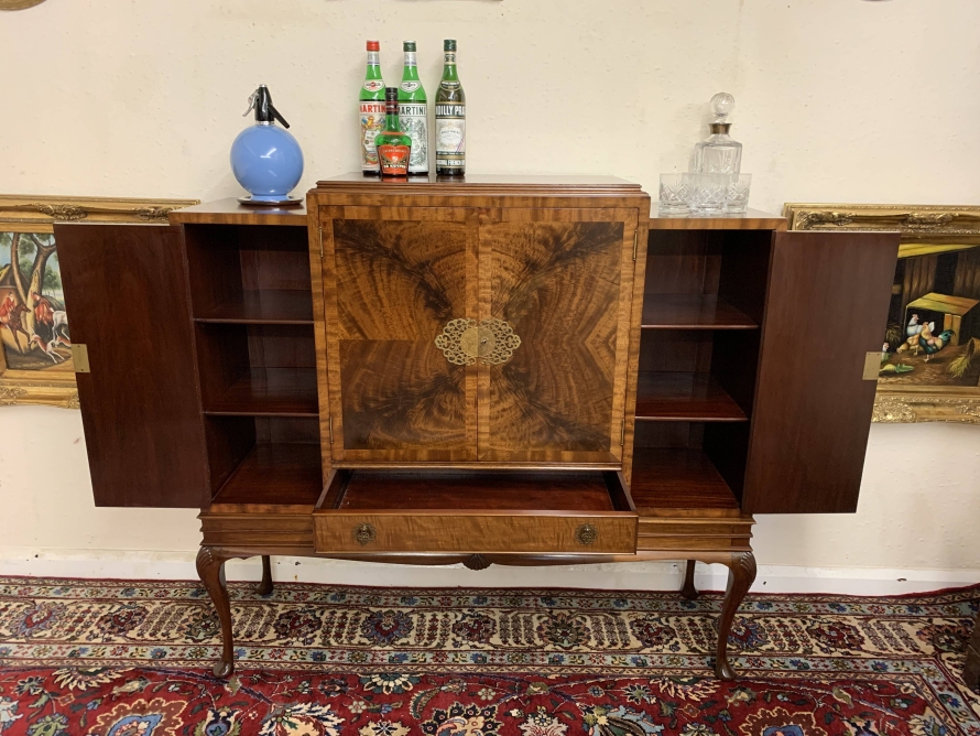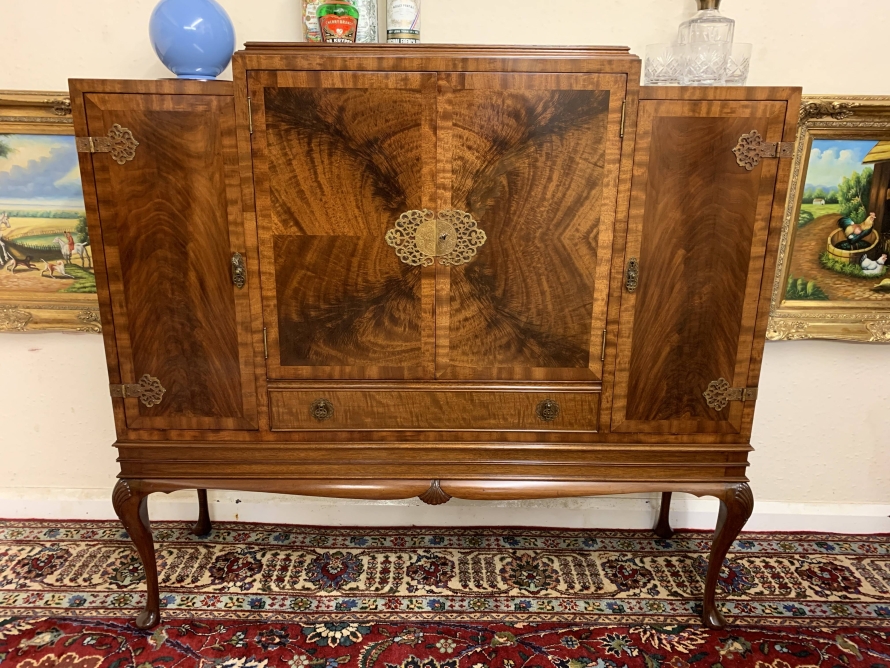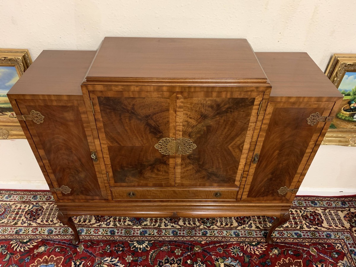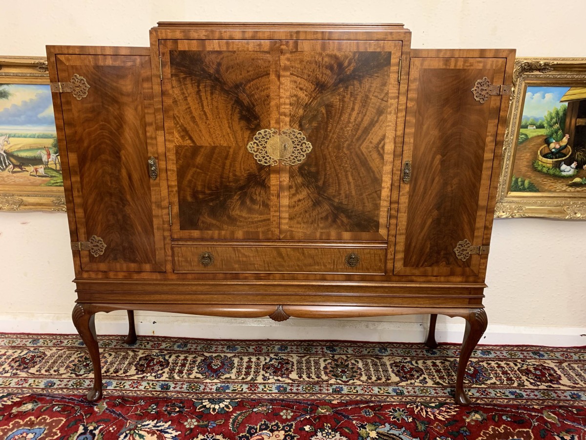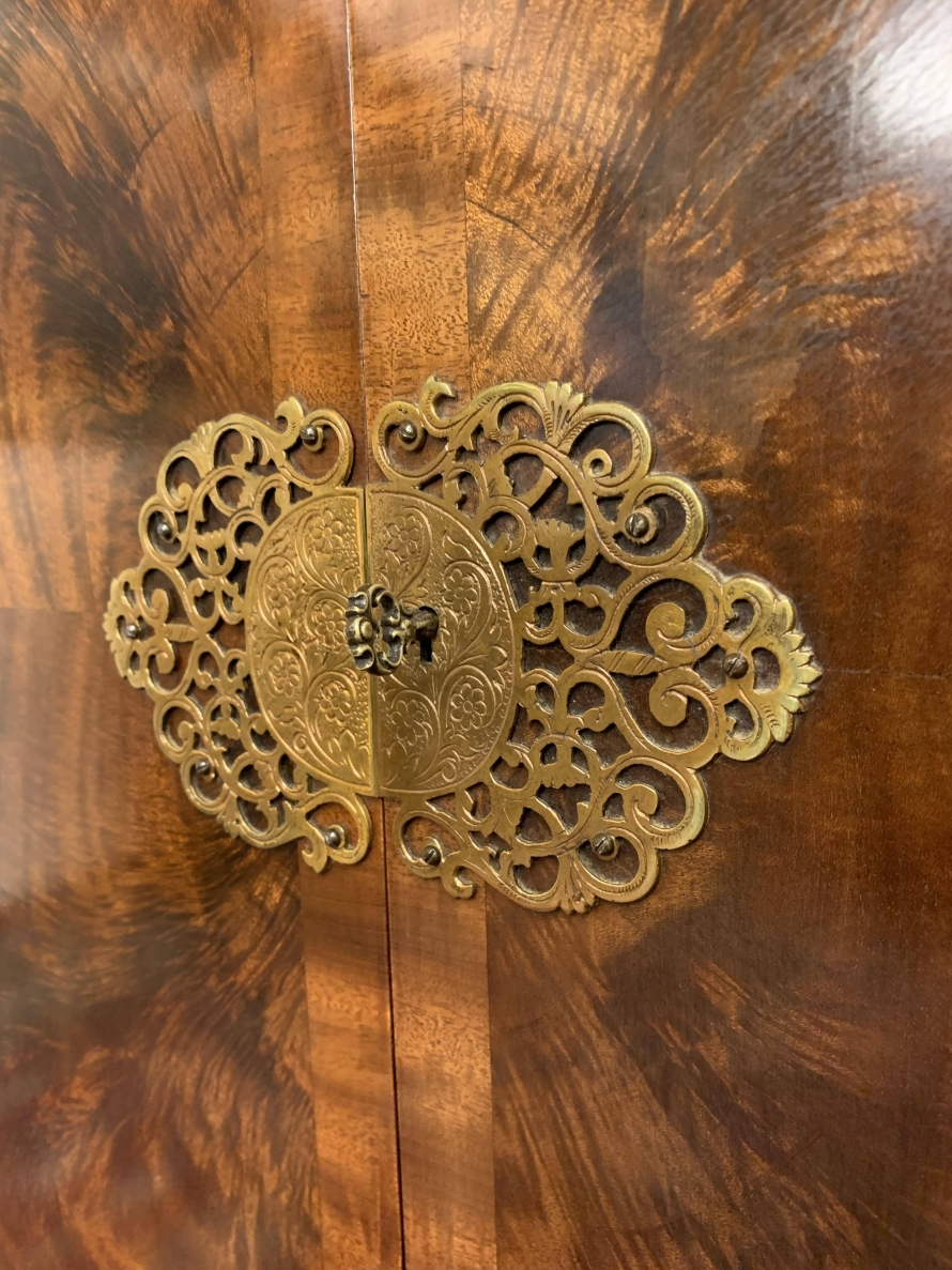 Made in glorious flame mahogany this cabinet is in excellent condition. The stepped top sits above a pair of lockable central door, the doors having brass decoration and key. The central doors open to reveal a removable shelf with two drawers below. Below the two central cupboard doors is a drawer, the drawer having two brass handles. The central doors are flanked by a pair of doors, each door having decorative brass hinges and decorative brass handle. Shaped skirt with central carving.This fine cabinet stands on four carved cabriole legs.