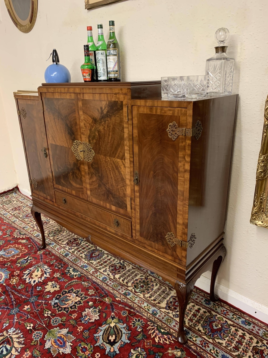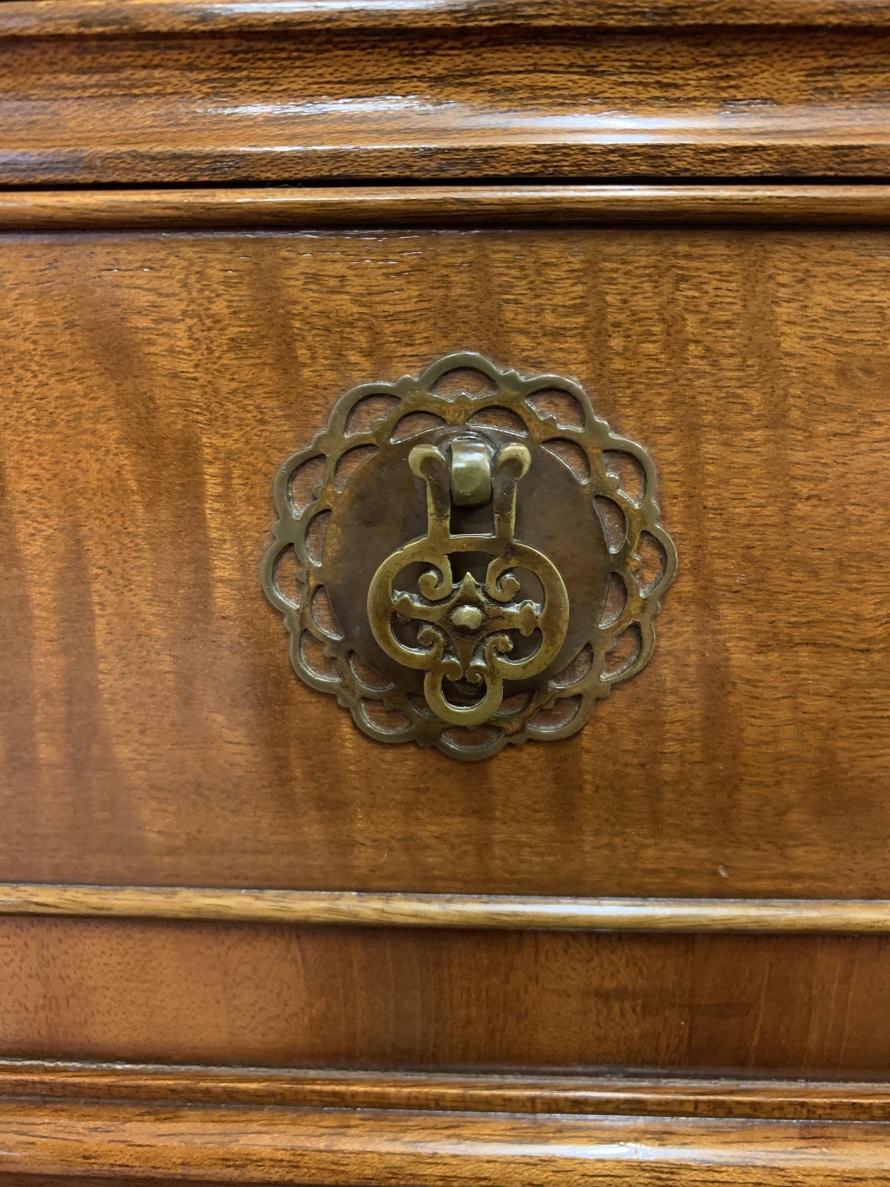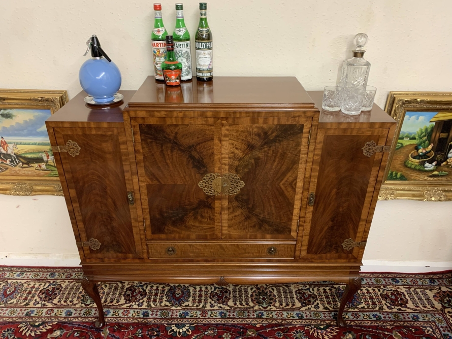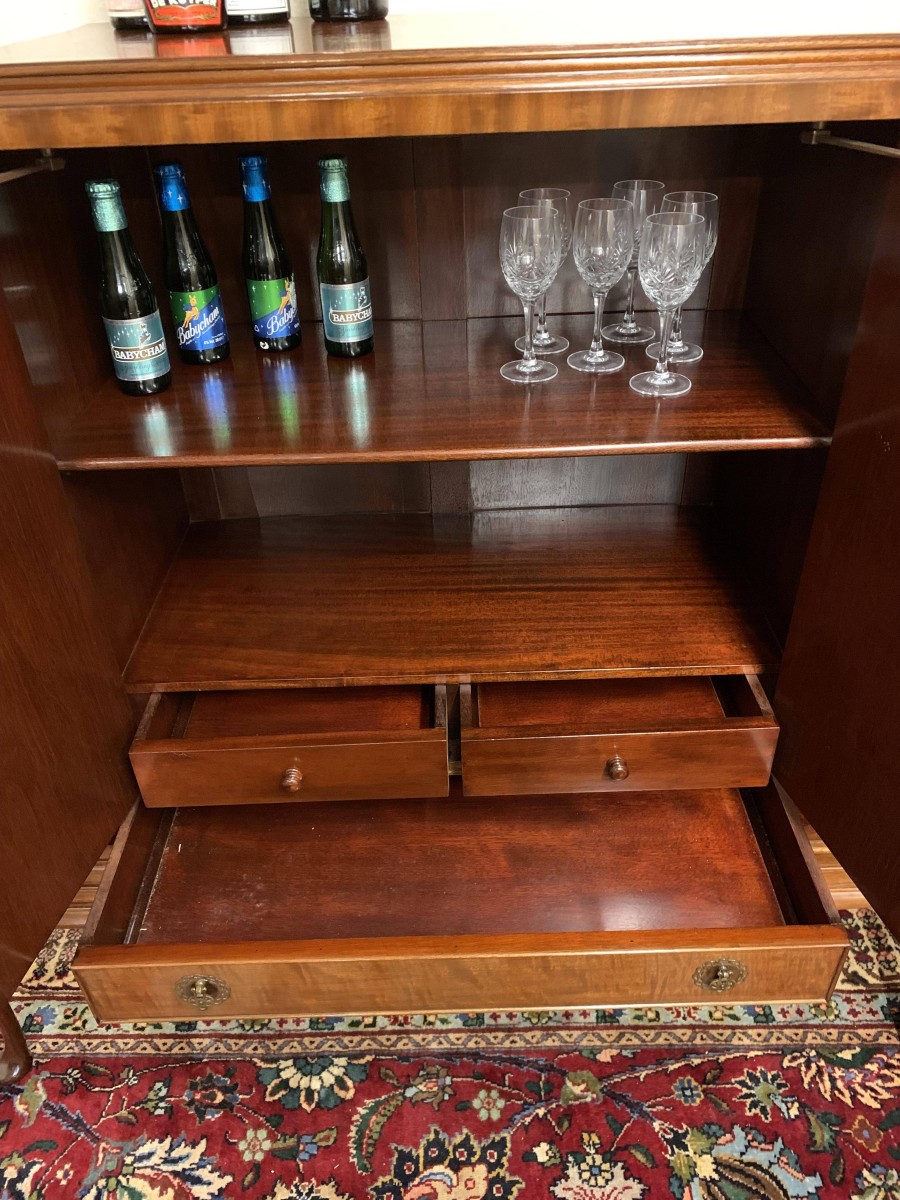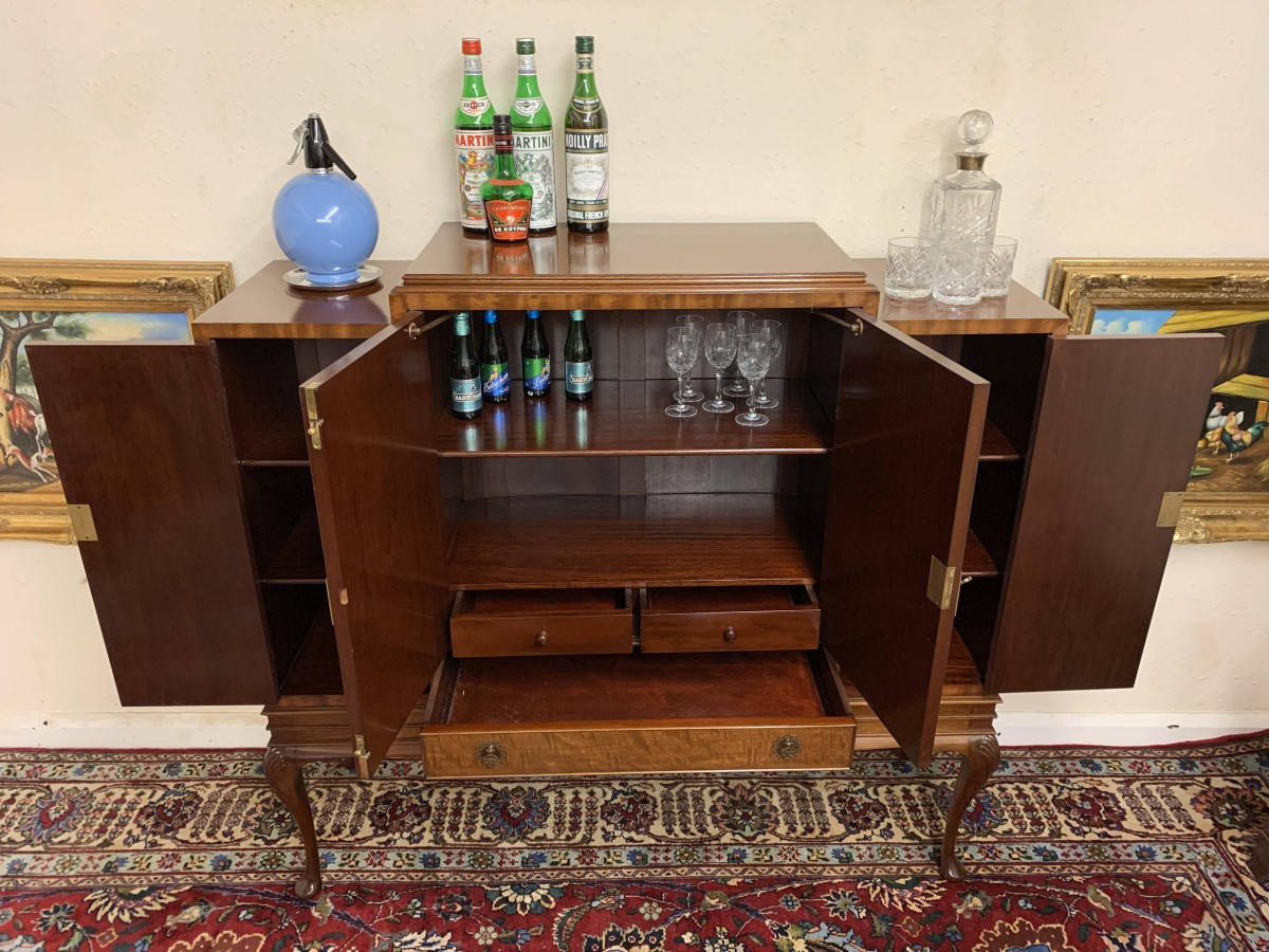 Made in glorious flame mahogany this cabinet is in excellent condition. The stepped top sits above a pair of lockable central door, the doors having brass decoration and key. The central doors open to reveal a removable shelf with two drawers below. Below the two central cupboard doors is a drawer, the drawer having two brass handles. The central doors are flanked by a pair of doors, each door having decorative brass hinges and decorative brass handle. Shaped skirt with central carving.This fine cabinet stands on four carved cabriole legs.