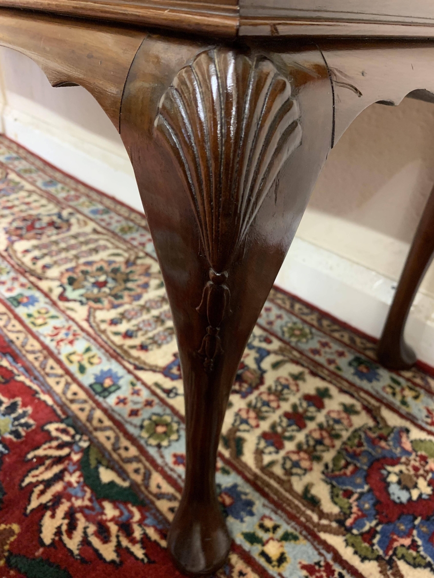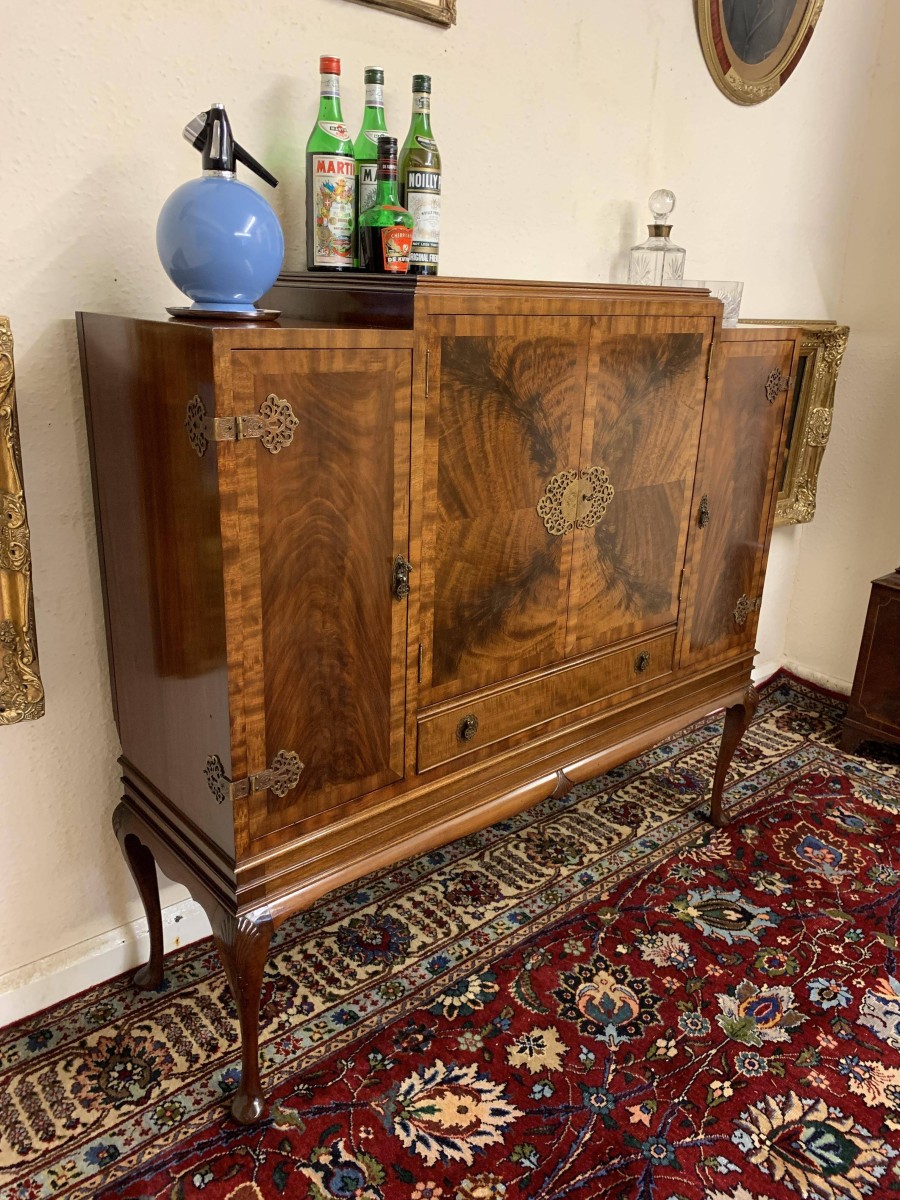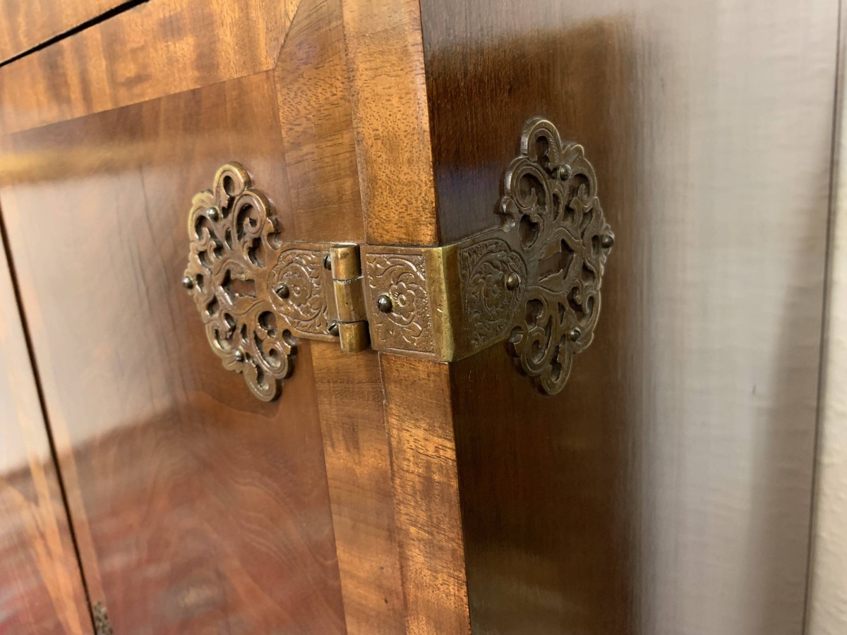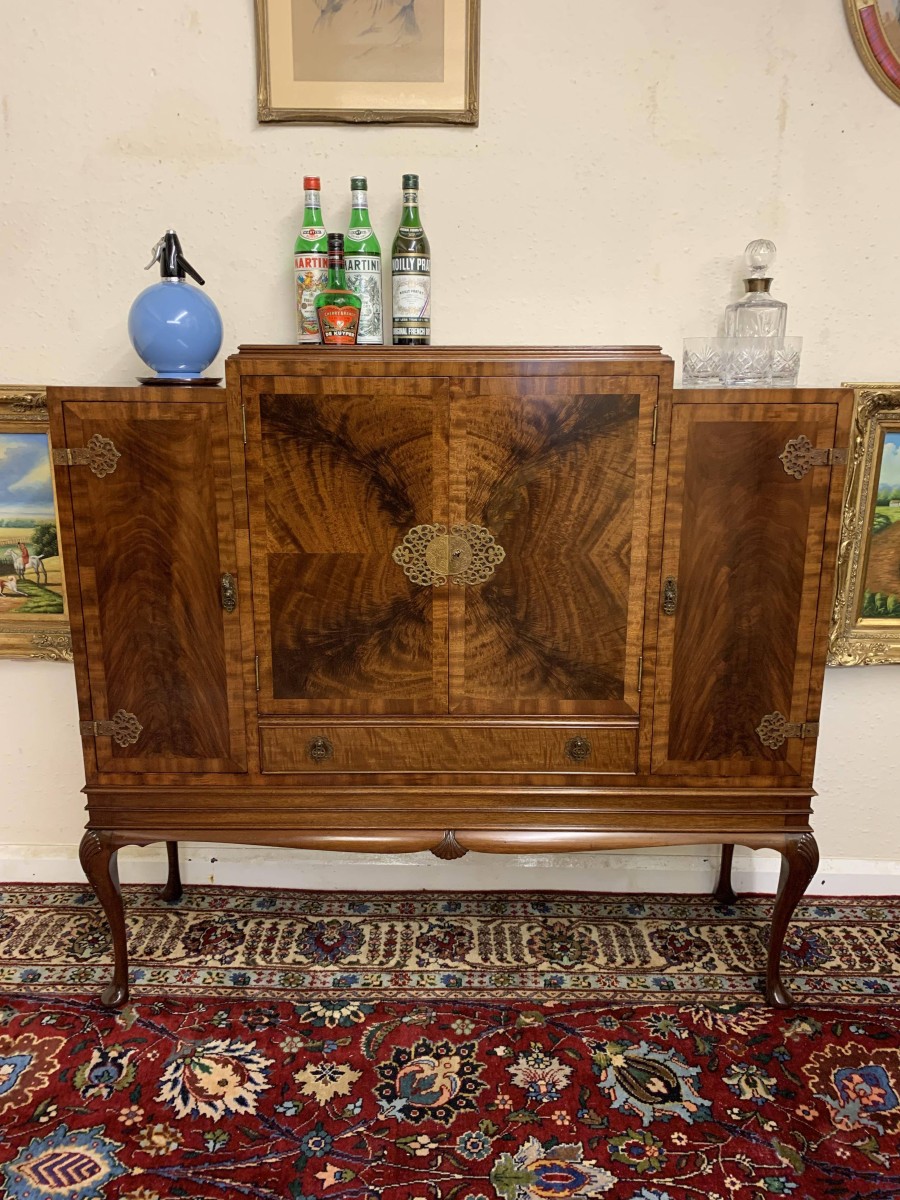 Made in glorious flame mahogany this cabinet is in excellent condition. The stepped top sits above a pair of lockable central door, the doors having brass decoration and key. The central doors open to reveal a removable shelf with two drawers below. Below the two central cupboard doors is a drawer, the drawer having two brass handles. The central doors are flanked by a pair of doors, each door having decorative brass hinges and decorative brass handle. Shaped skirt with central carving.This fine cabinet stands on four carved cabriole legs.