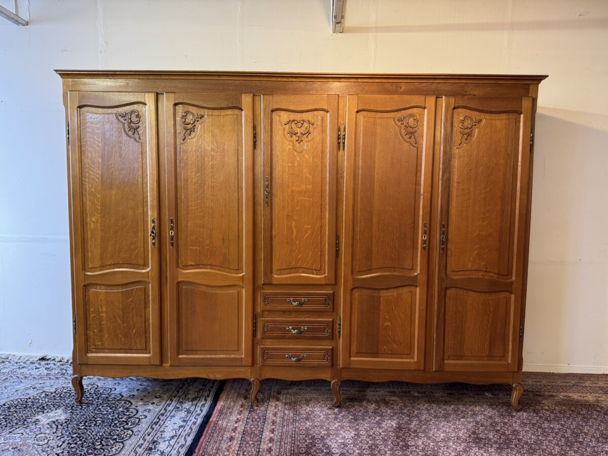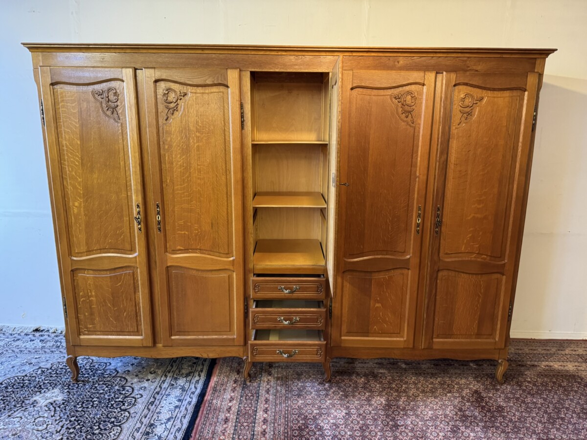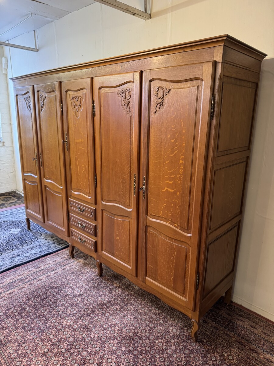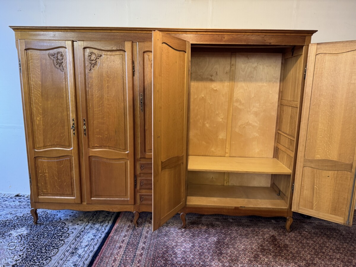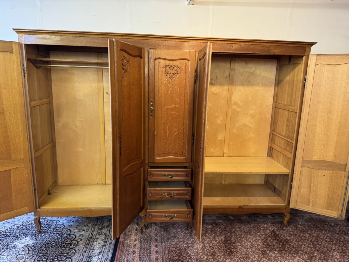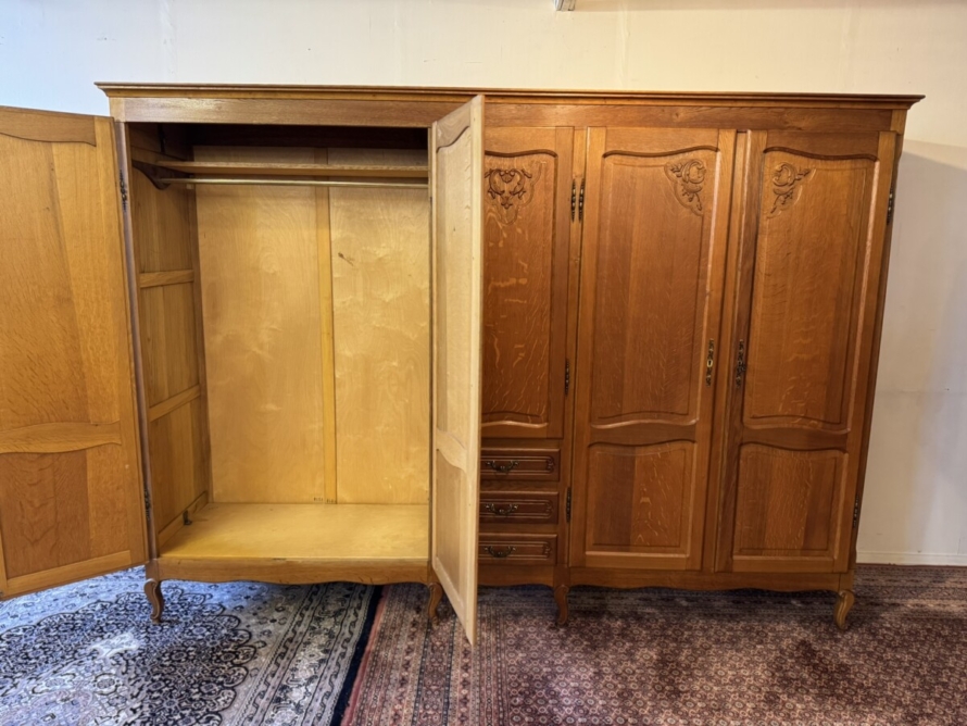 The oversailing top sits above a carved central lockable door, the door opens to reveal two removable shelves, below are three carved drawers below, each drawer having a brass ornate handle. The central section is flanked by a pair of lockable carved doors, the left two doors open to reveal a shelf above a brass hanging rail, the right two doors open to reveal a hanging rail above a removable shelf. Recessed panelled sides, shaped skirt and standing on four carved cabriole legs to the front.