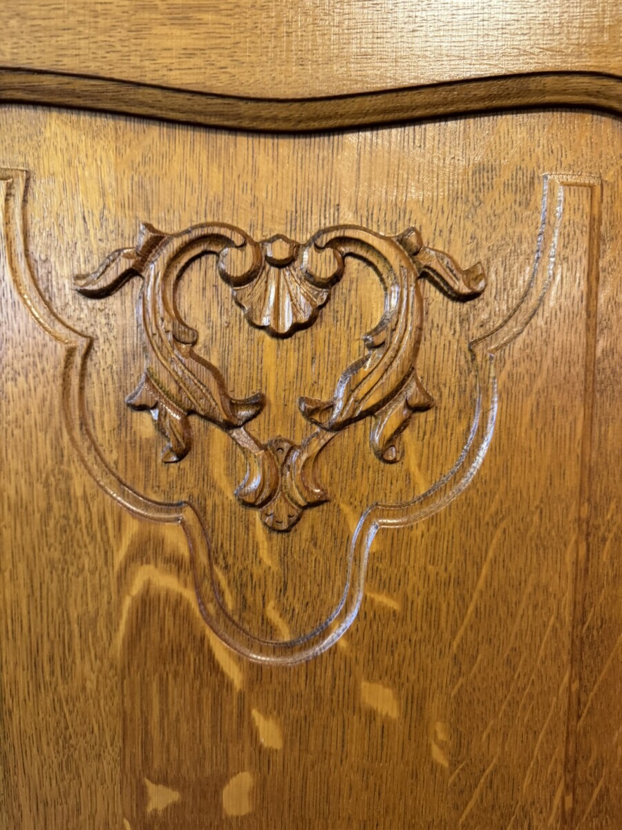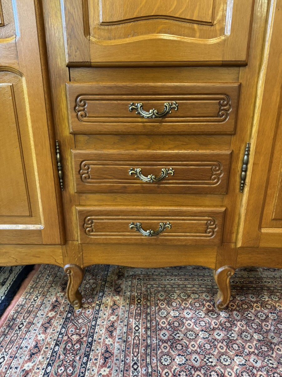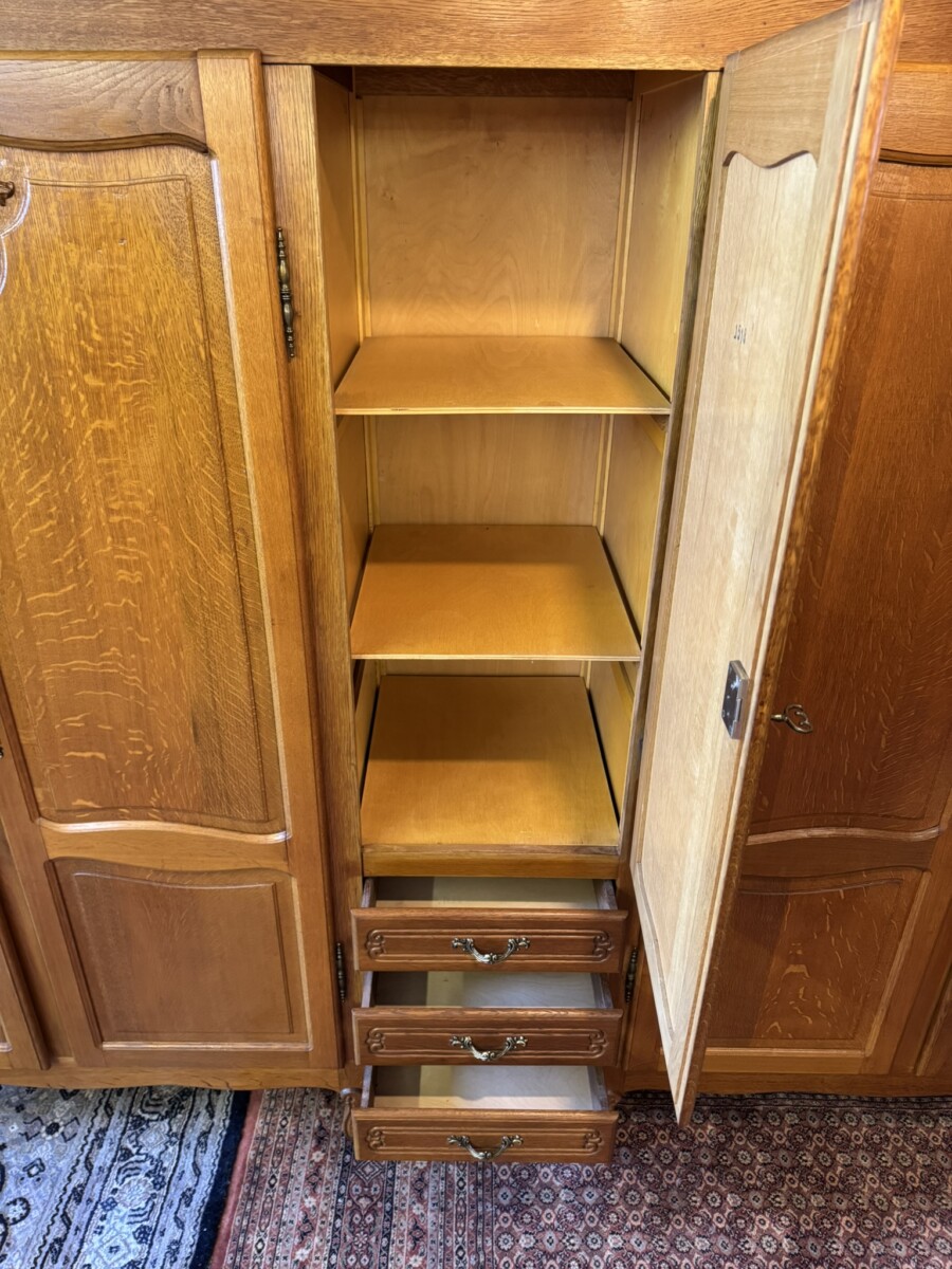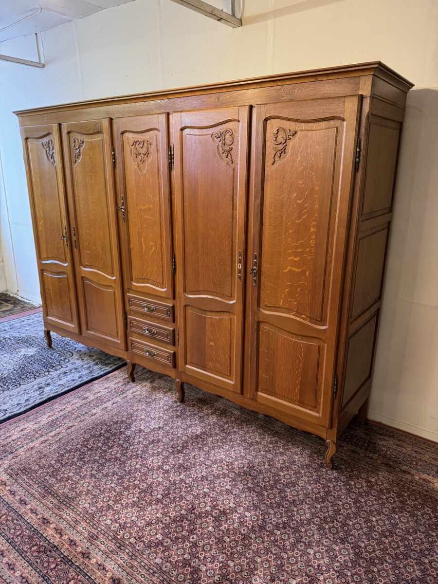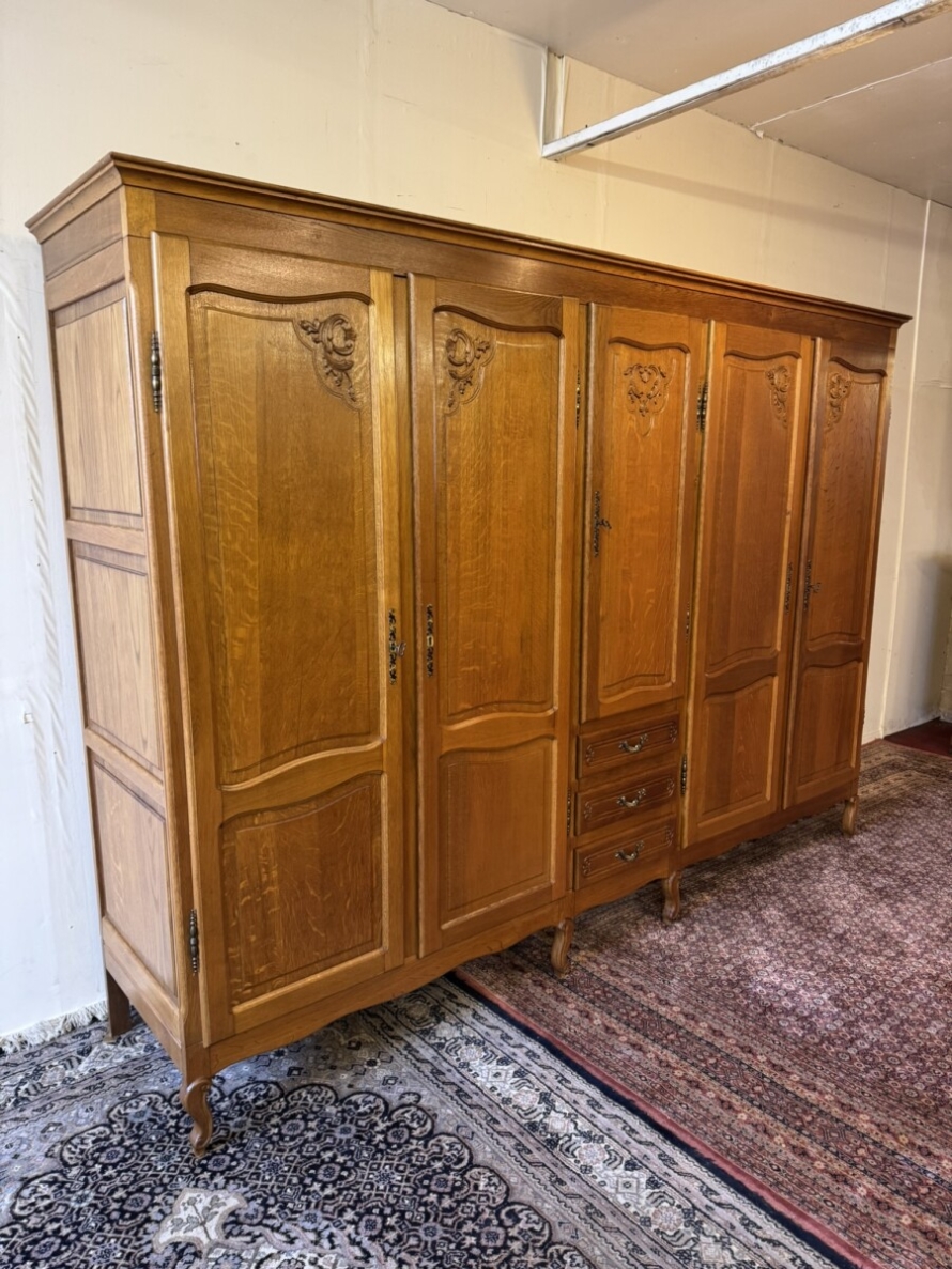 The oversailing top sits above a carved central lockable door, the door opens to reveal two removable shelves, below are three carved drawers below, each drawer having a brass ornate handle. The central section is flanked by a pair of lockable carved doors, the left two doors open to reveal a shelf above a brass hanging rail, the right two doors open to reveal a hanging rail above a removable shelf. Recessed panelled sides, shaped skirt and standing on four carved cabriole legs to the front.