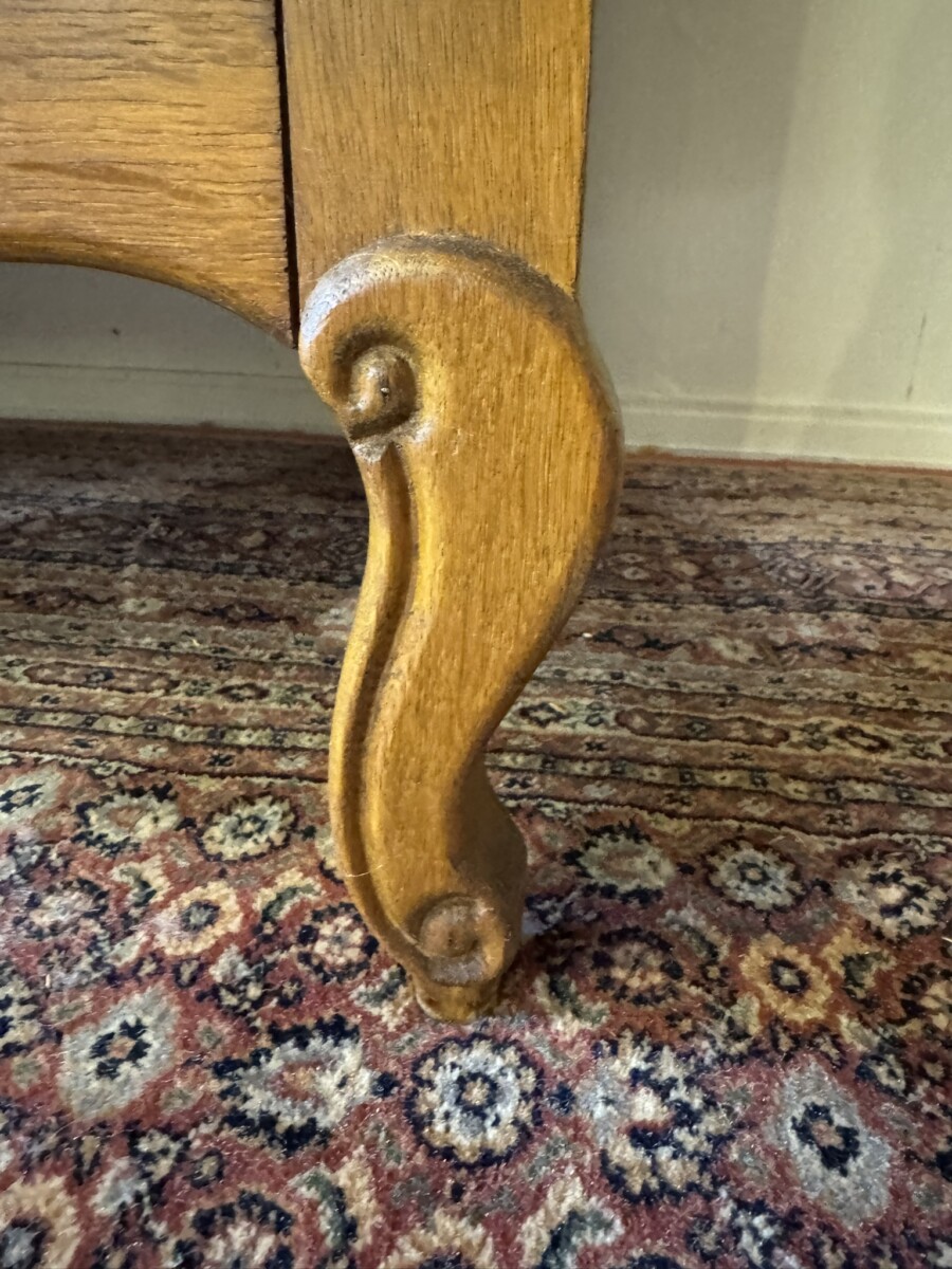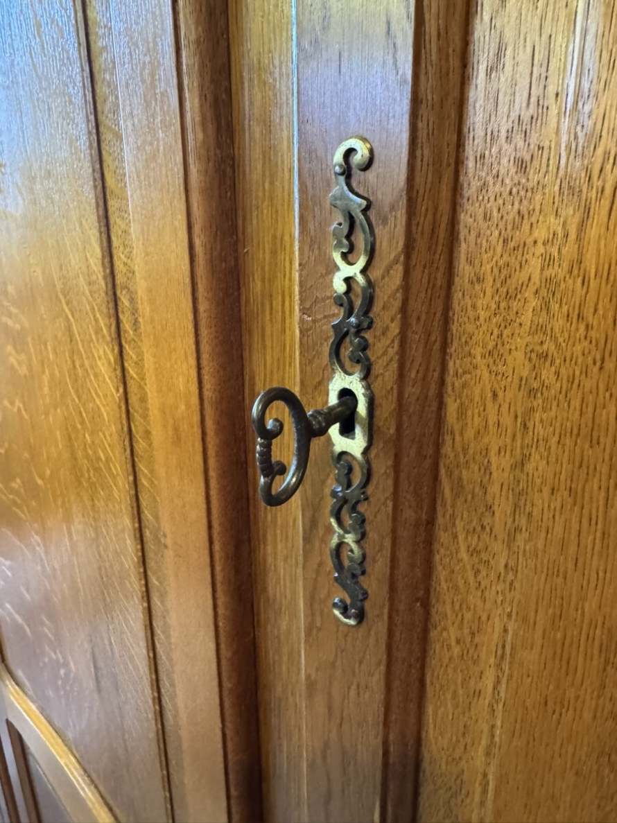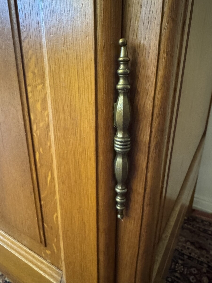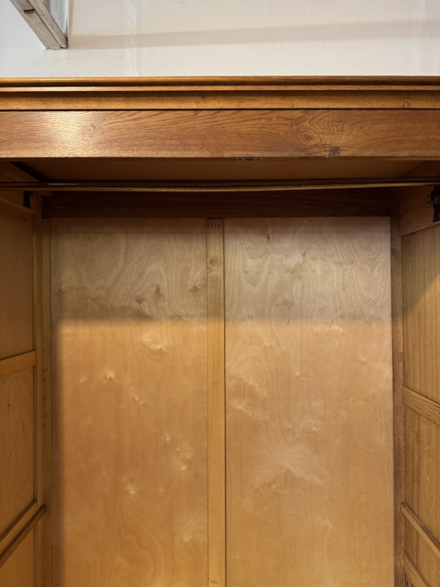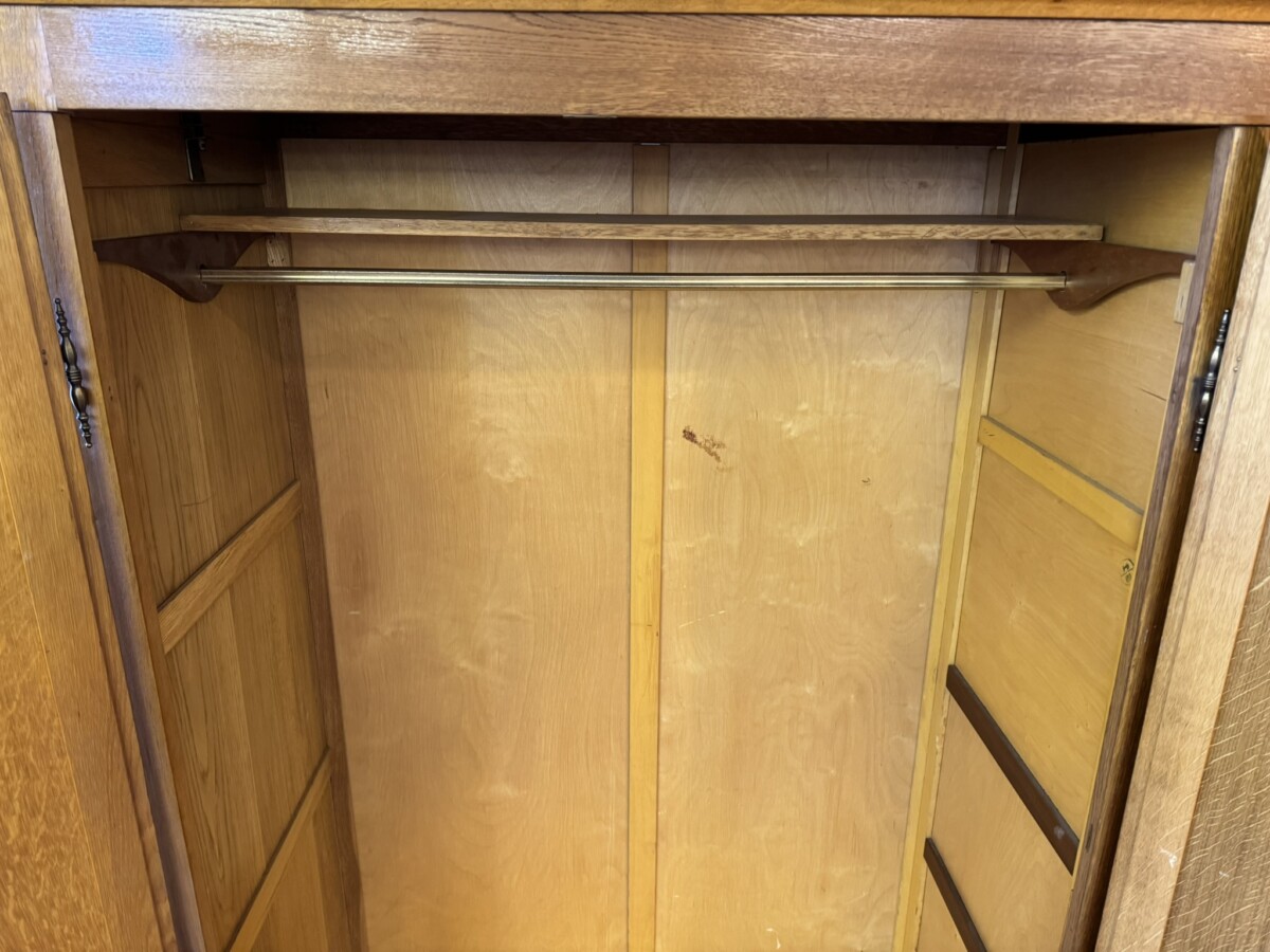 The oversailing top sits above a carved central lockable door, the door opens to reveal two removable shelves, below are three carved drawers below, each drawer having a brass ornate handle. The central section is flanked by a pair of lockable carved doors, the left two doors open to reveal a shelf above a brass hanging rail, the right two doors open to reveal a hanging rail above a removable shelf. Recessed panelled sides, shaped skirt and standing on four carved cabriole legs to the front.
