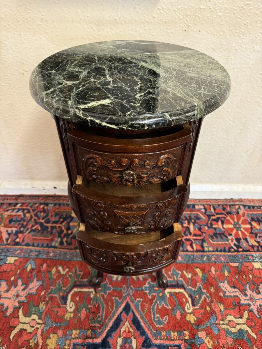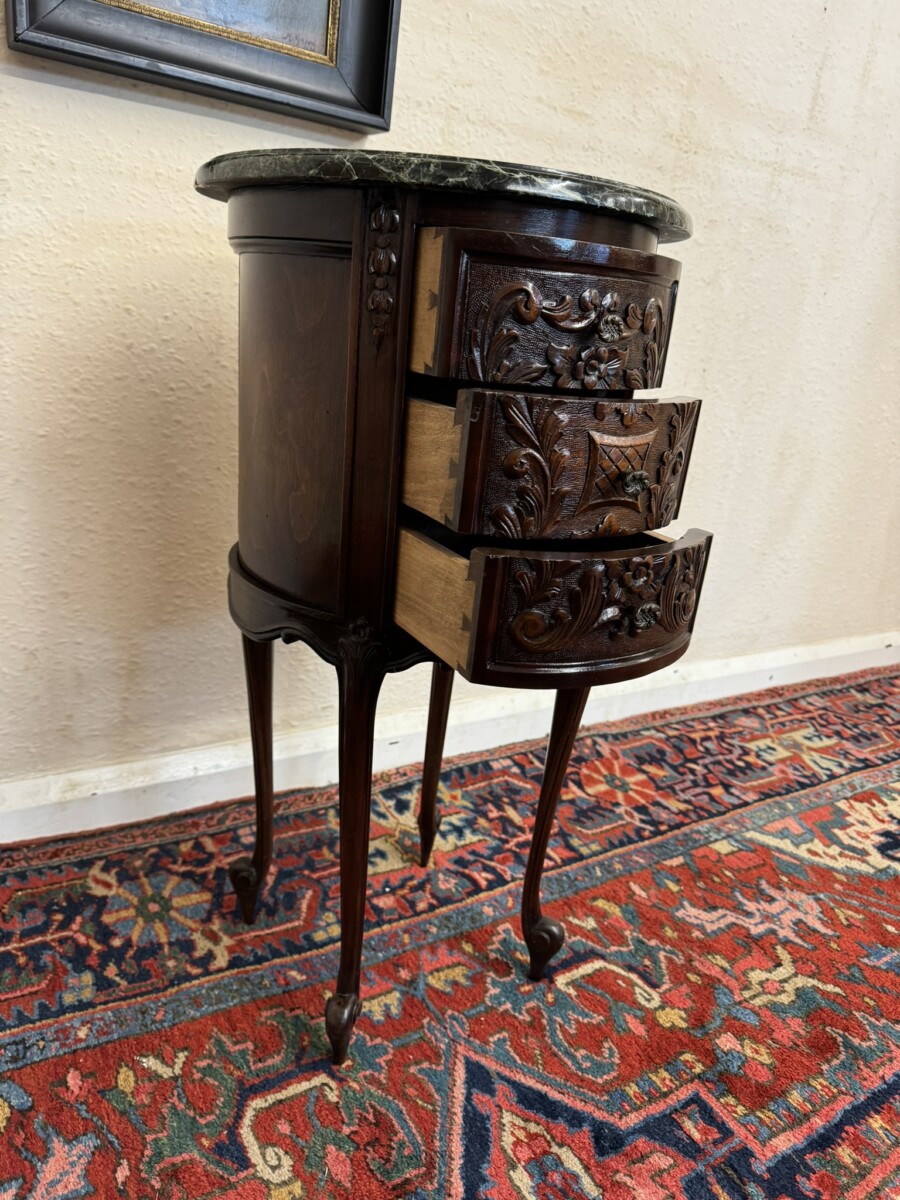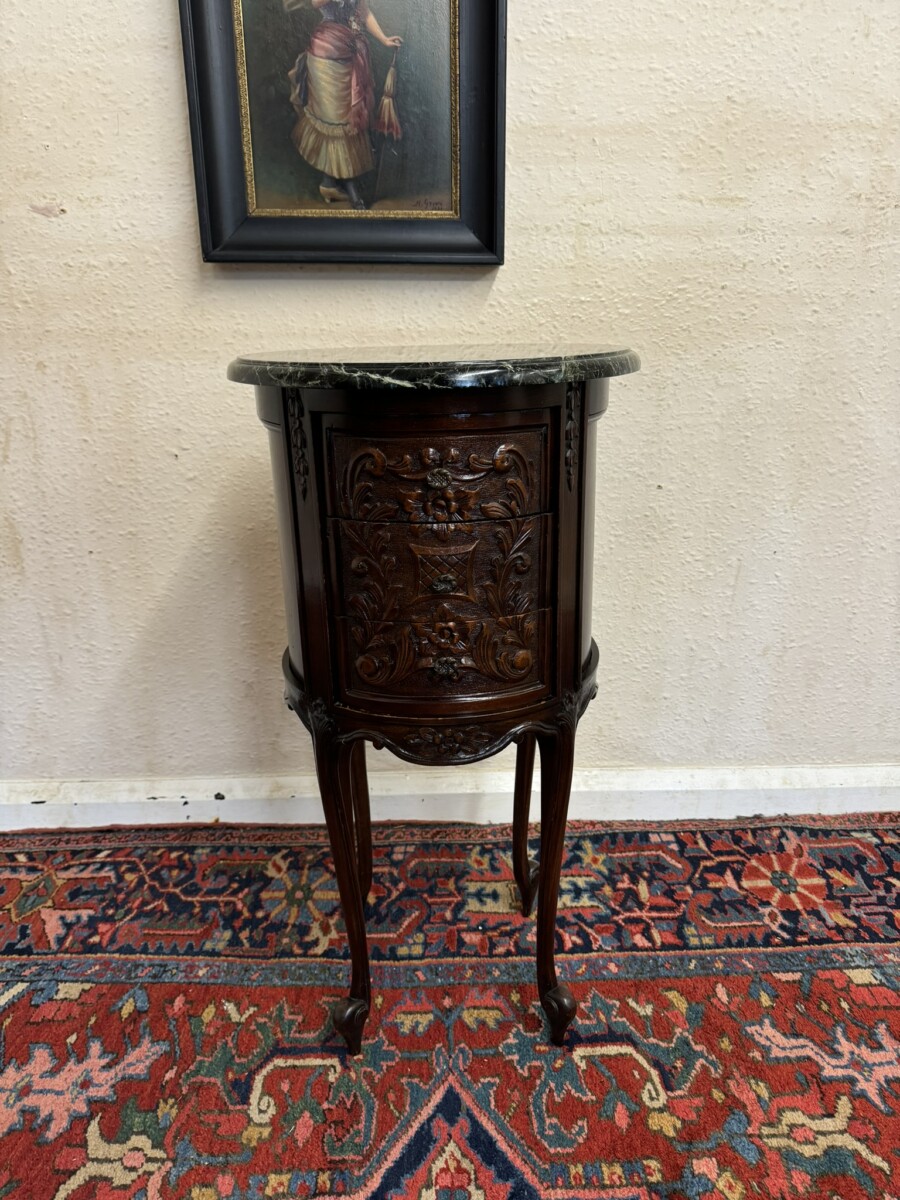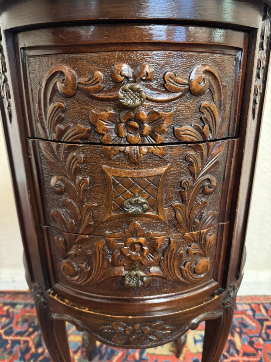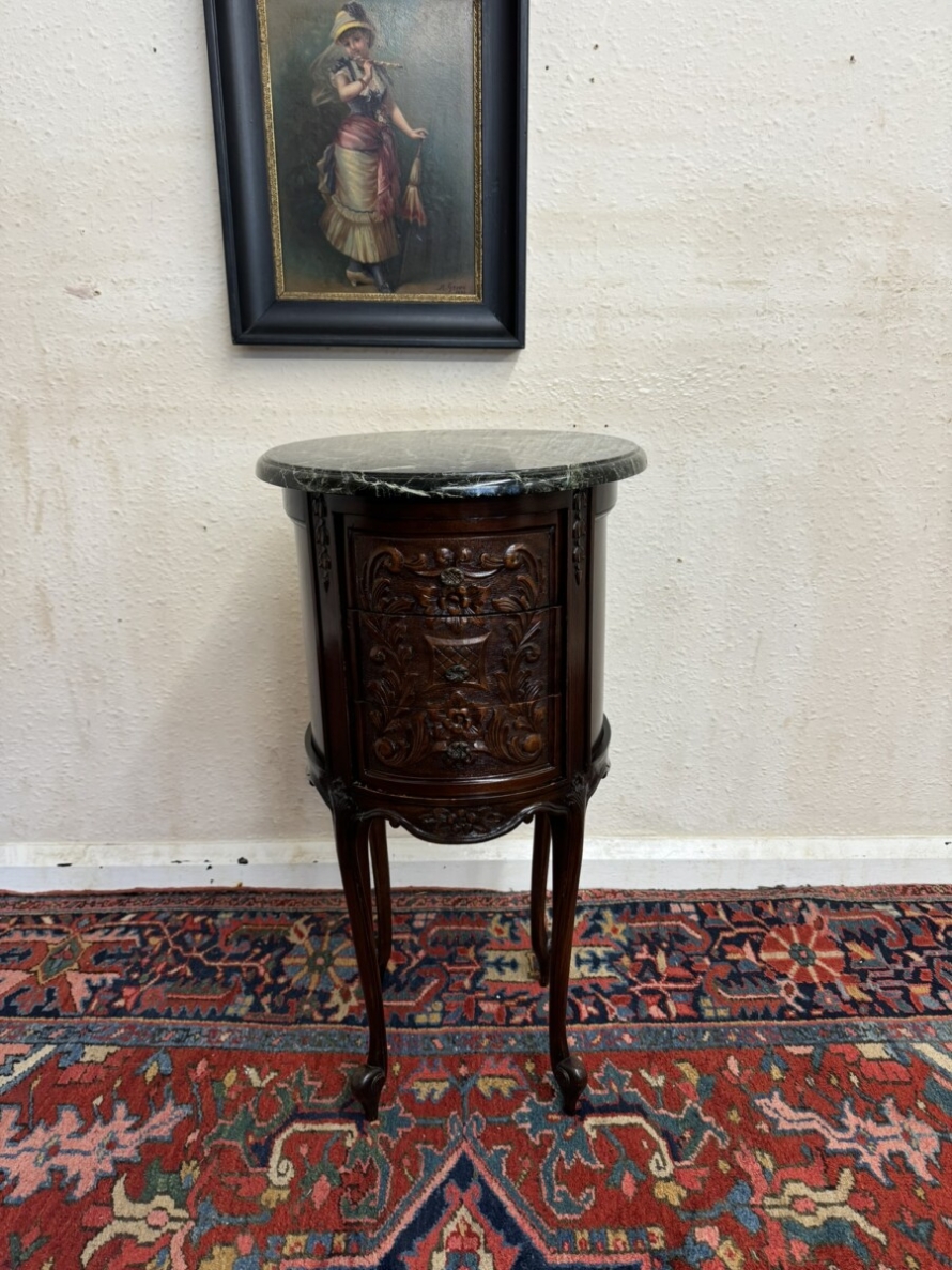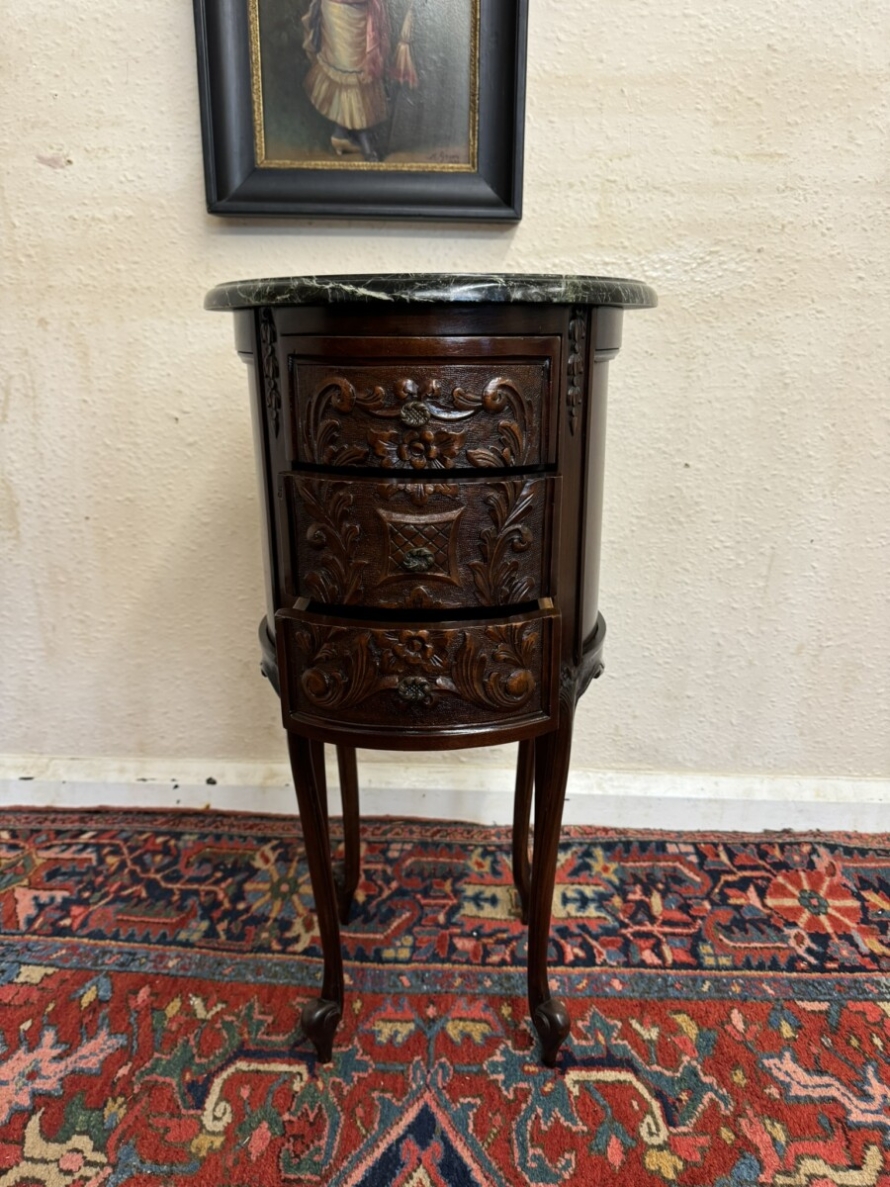 The marble top sits above three carved drawers. Cylindrical in shape with a shaped skirt with carving to the front and standing on four elegant cabriole shaped legs.