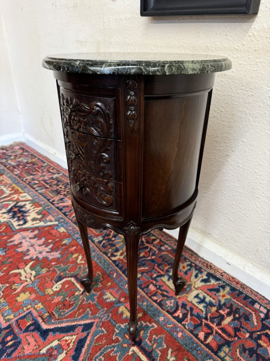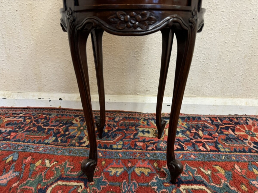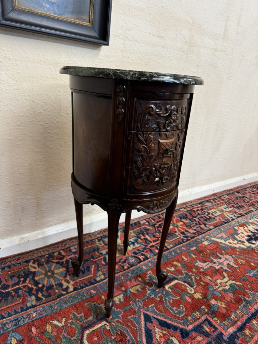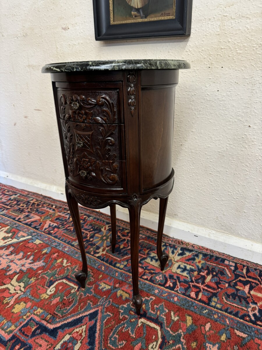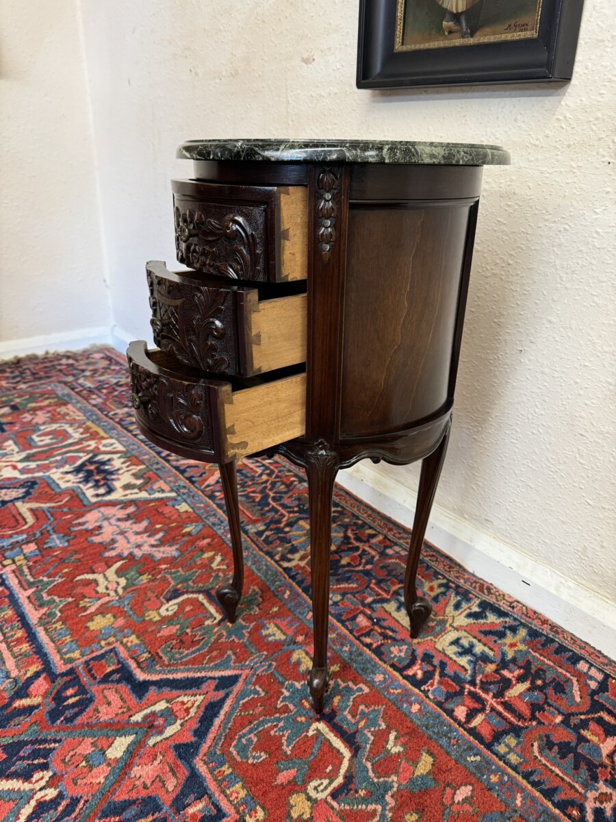 The marble top sits above three carved drawers. Cylindrical in shape with a shaped skirt with carving to the front and standing on four elegant cabriole shaped legs.