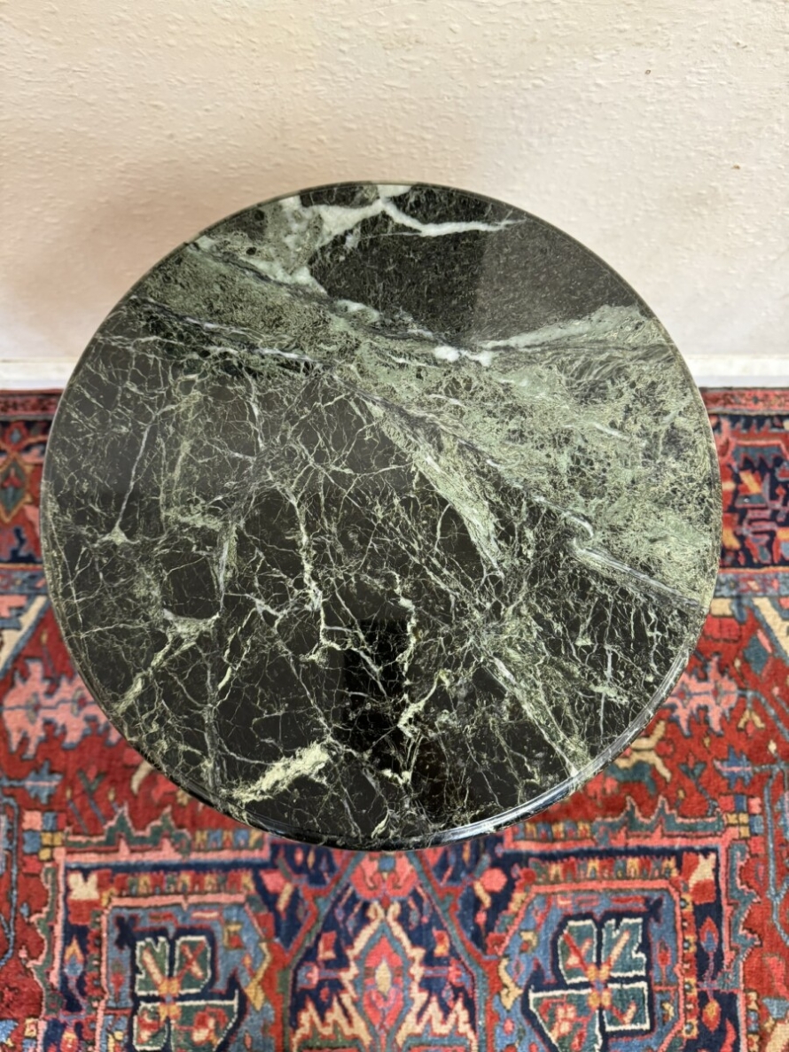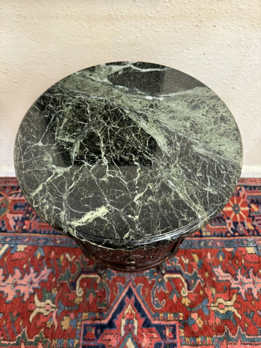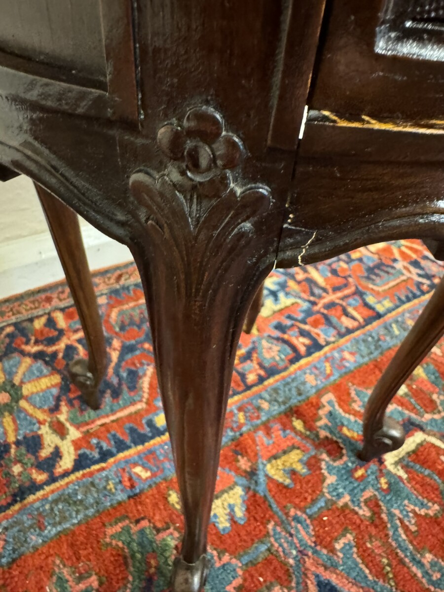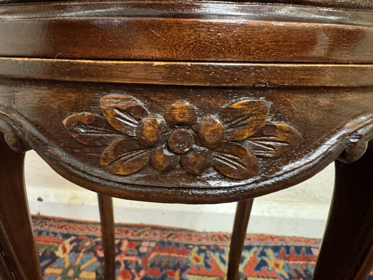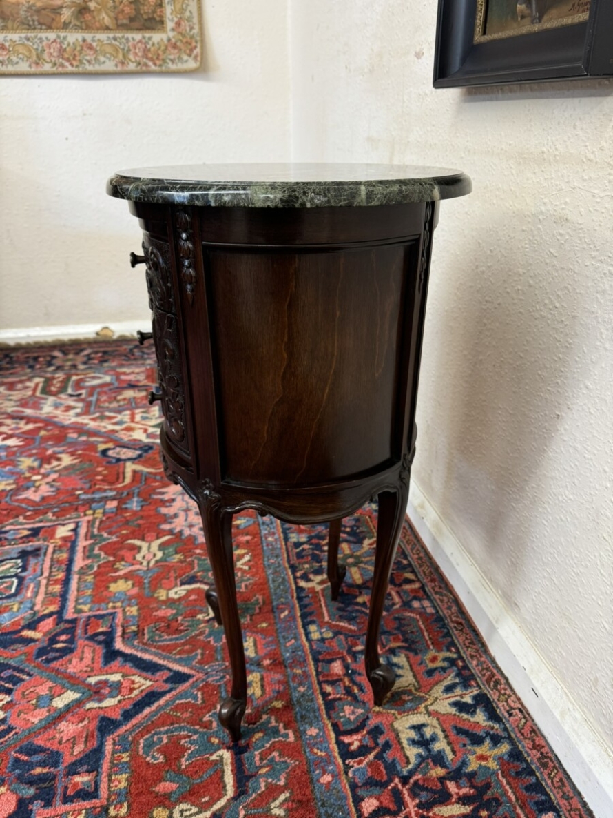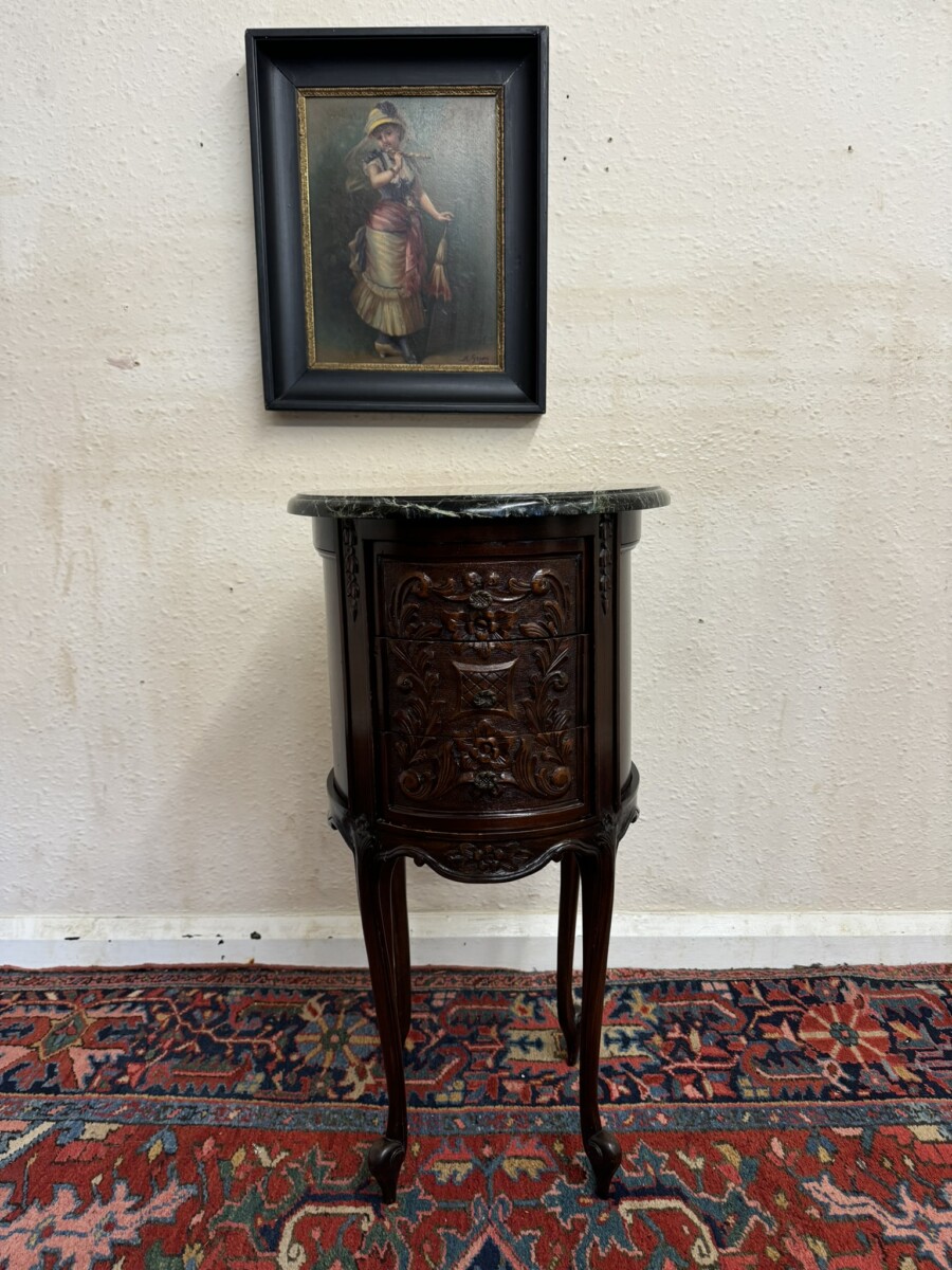 The marble top sits above three carved drawers. Cylindrical in shape with a shaped skirt with carving to the front and standing on four elegant cabriole shaped legs.