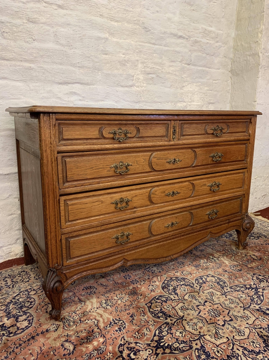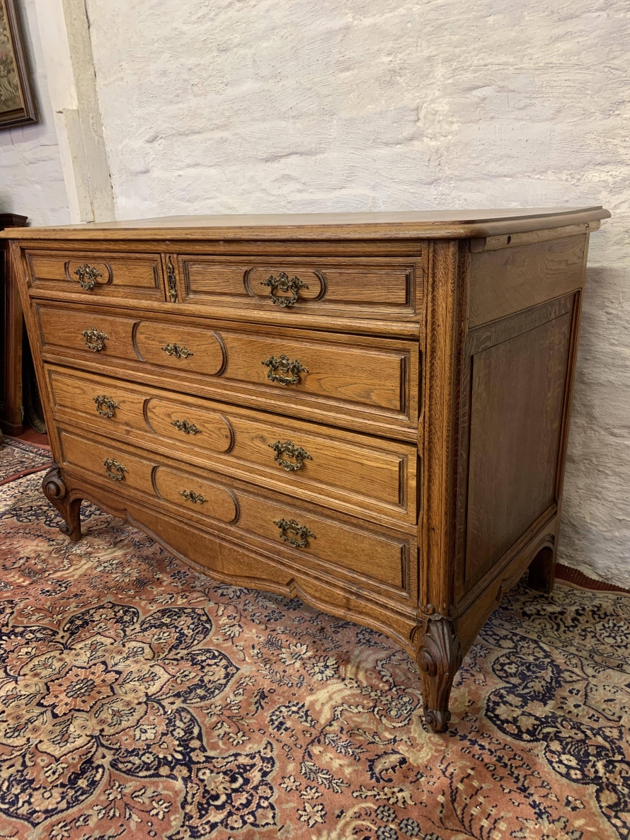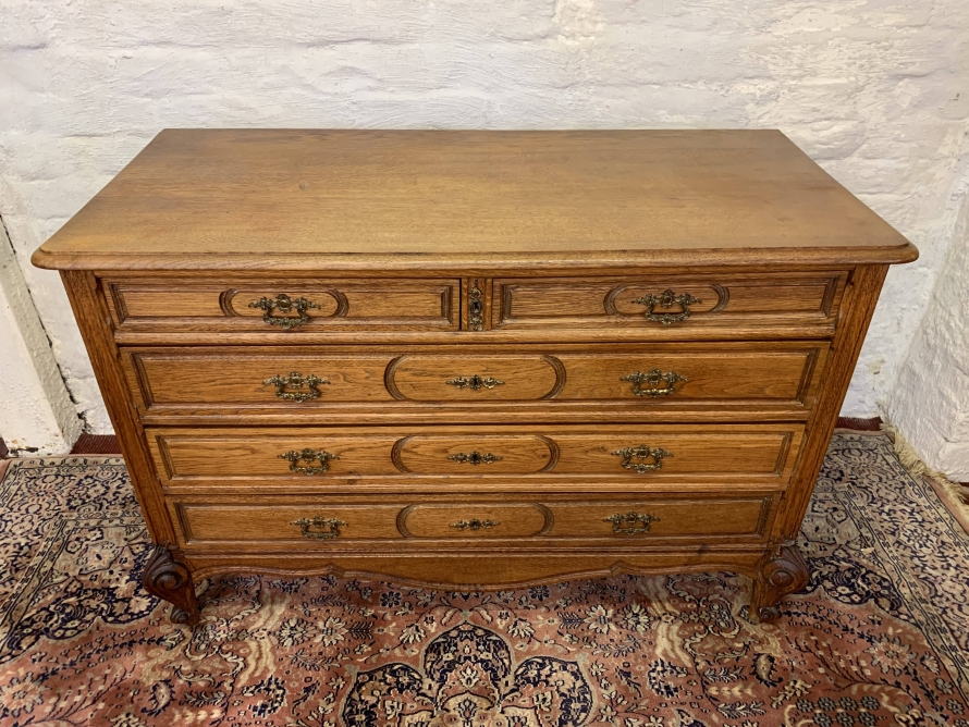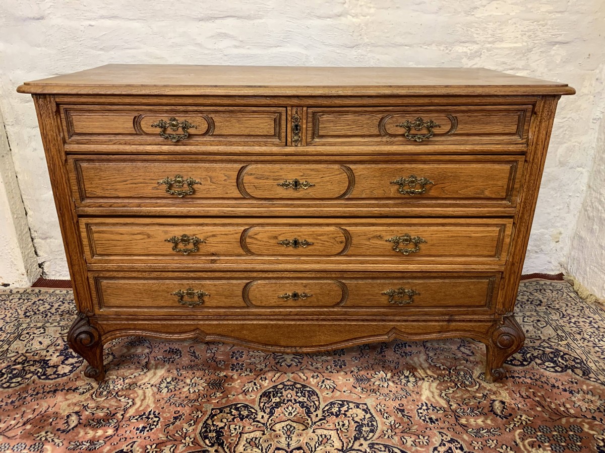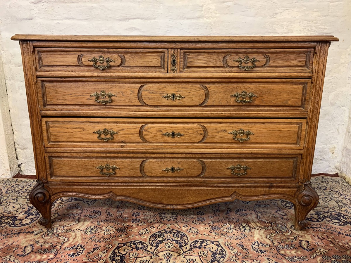 The oversailing top has rounded corners to the front. Below are a pair of recessed panelled short drawers, each drawer having an ornate brass handle, these drawers sit above three long drawers, each drawer having a pair of ornate brass handles. Recessed panelled sides, shaped skirt this super chest sits on two carved cabriole legs to the front.