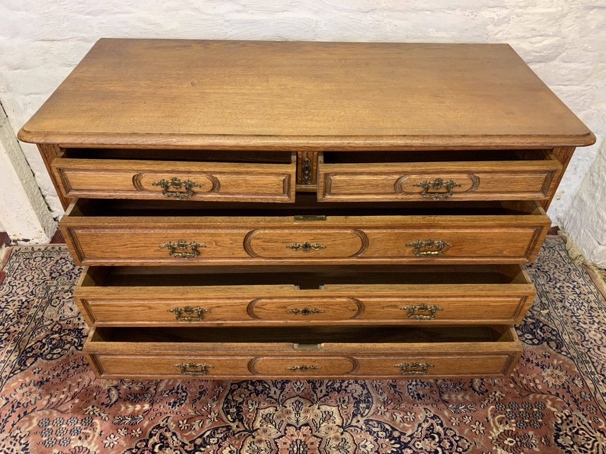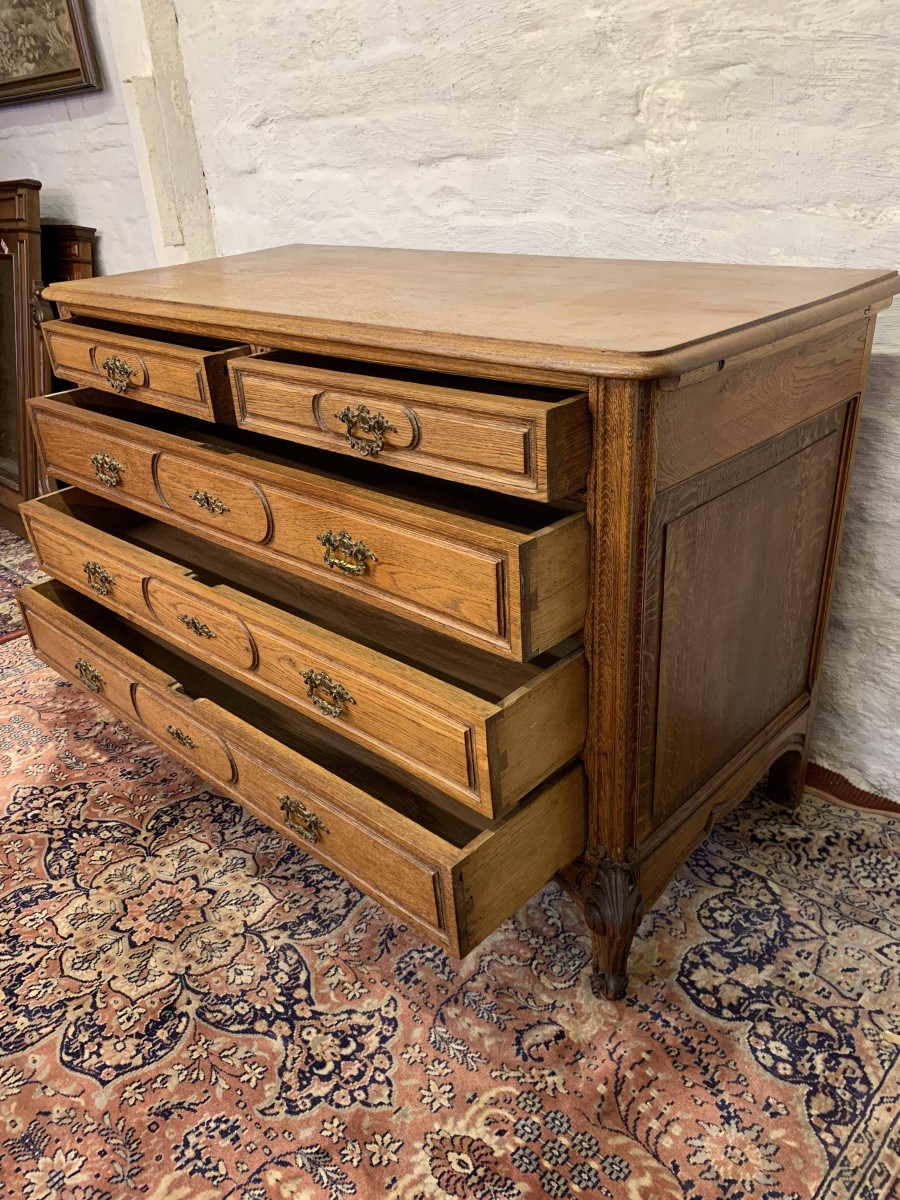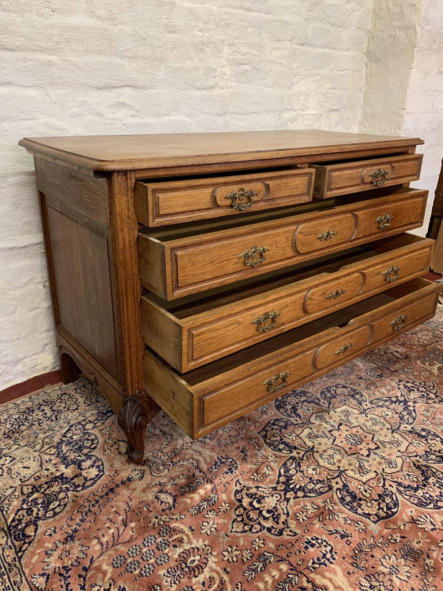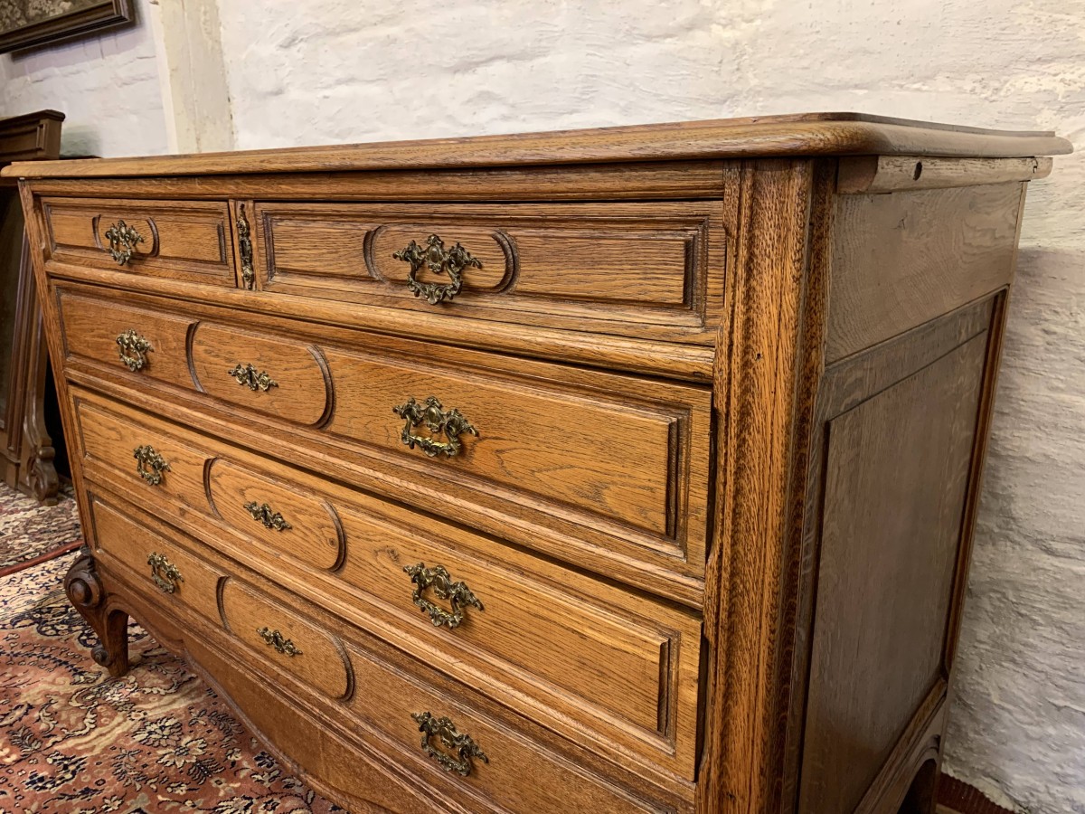 The oversailing top has rounded corners to the front. Below are a pair of recessed panelled short drawers, each drawer having an ornate brass handle, these drawers sit above three long drawers, each drawer having a pair of ornate brass handles. Recessed panelled sides, shaped skirt this super chest sits on two carved cabriole legs to the front.
