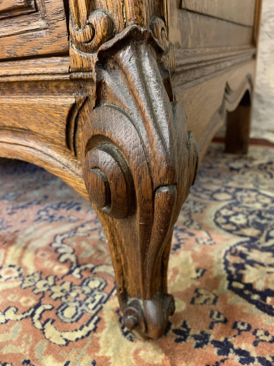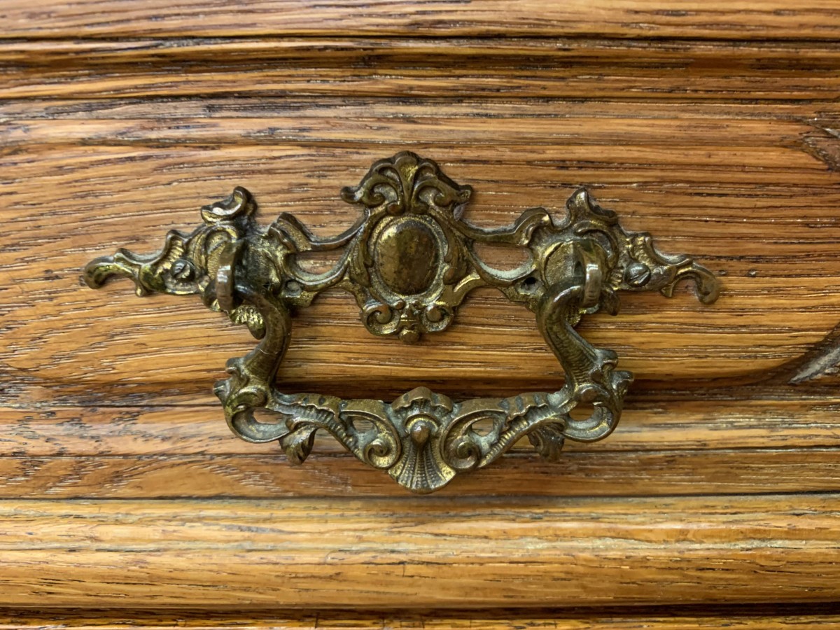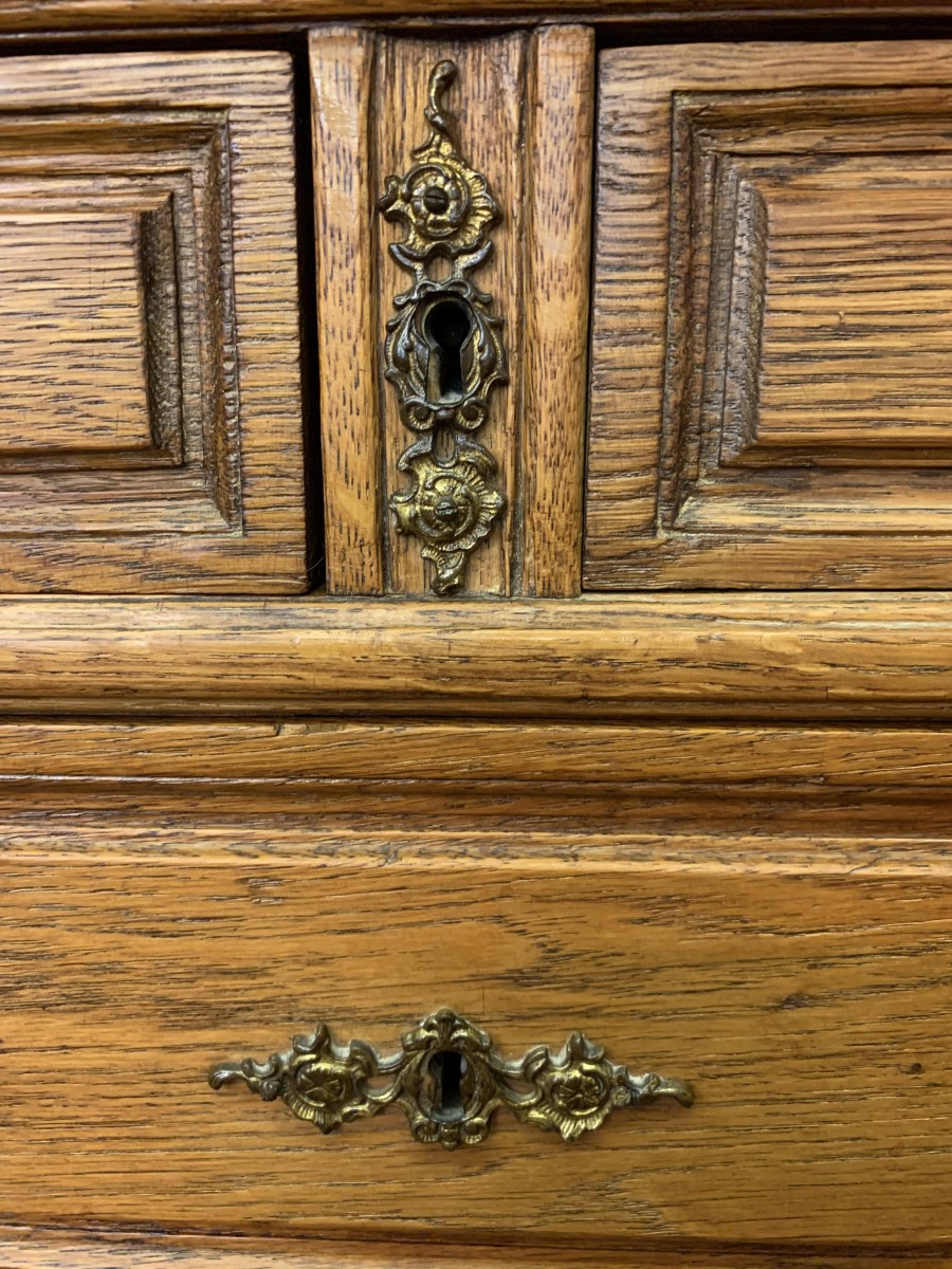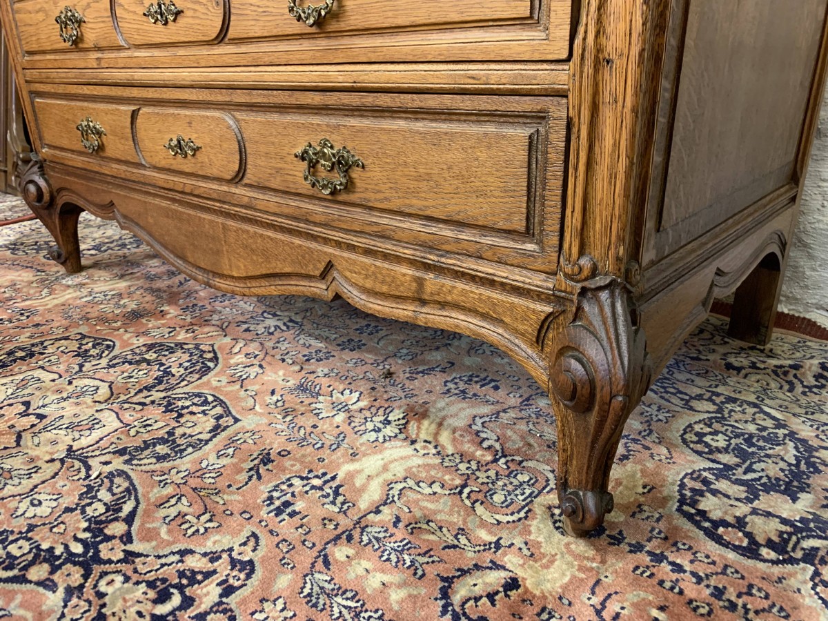 The oversailing top has rounded corners to the front. Below are a pair of recessed panelled short drawers, each drawer having an ornate brass handle, these drawers sit above three long drawers, each drawer having a pair of ornate brass handles. Recessed panelled sides, shaped skirt this super chest sits on two carved cabriole legs to the front.