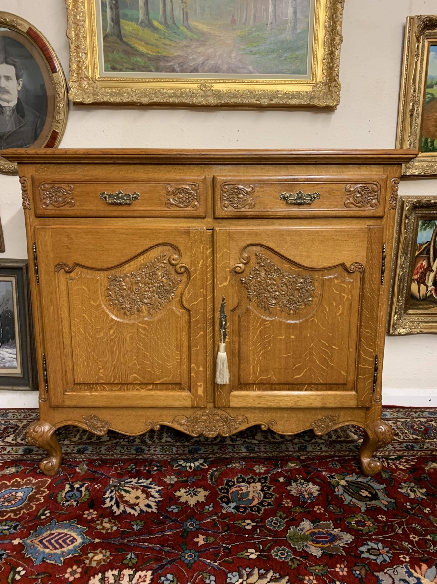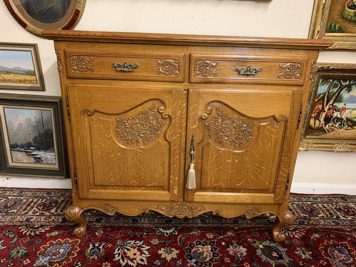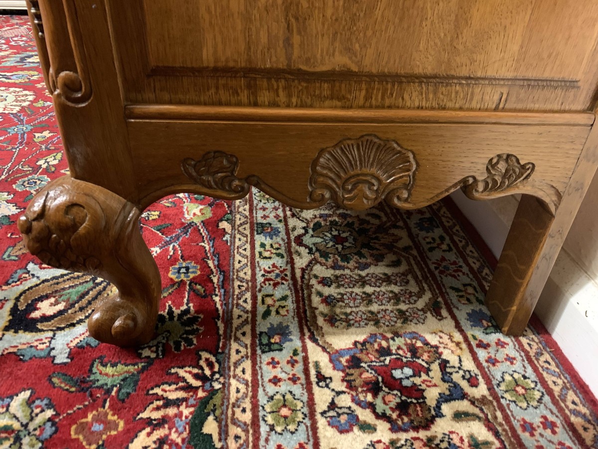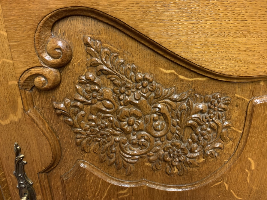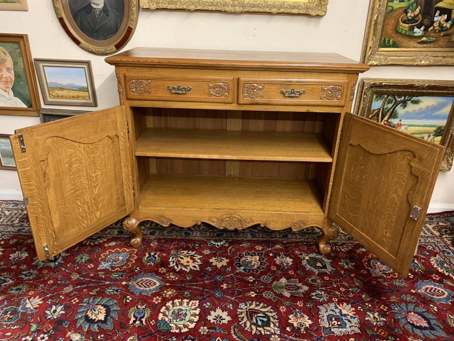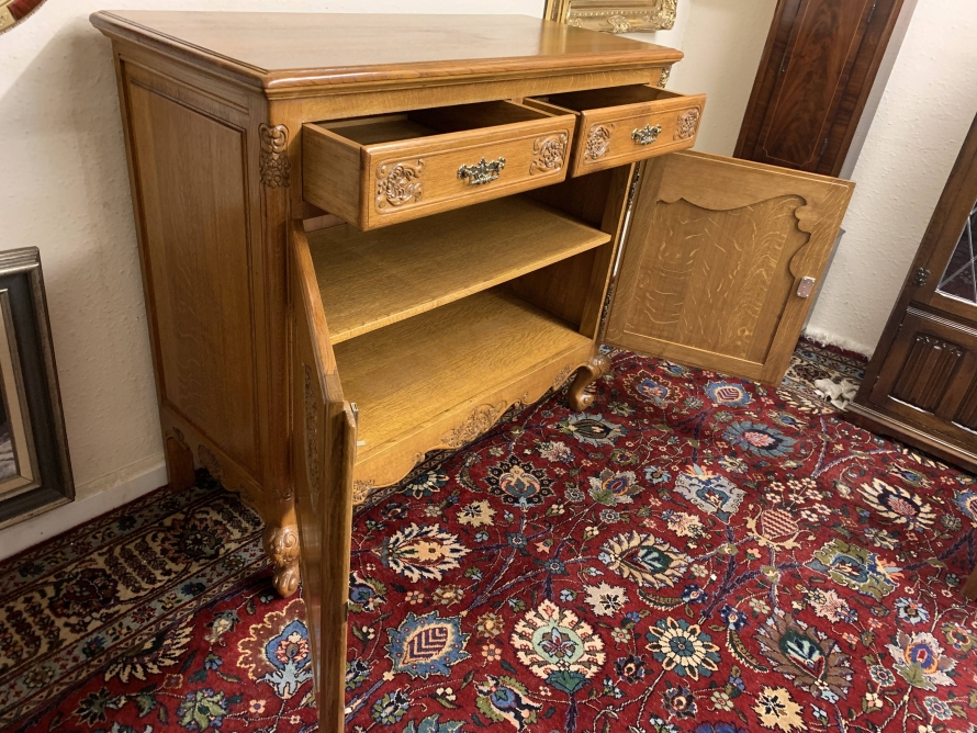 The oversailing top sits above a pair of carved recessed panelled drawers, each drawer having a decorative brass handle. Below are a pair of shaped carved recessed panelled lockable doors, each door having brass hinges. The doors open to reveal a removable shelf. Recessed panelled sides, shaped carved skirt this beautiful French cupboard stands on two elegant carved cabriole shaped legs.