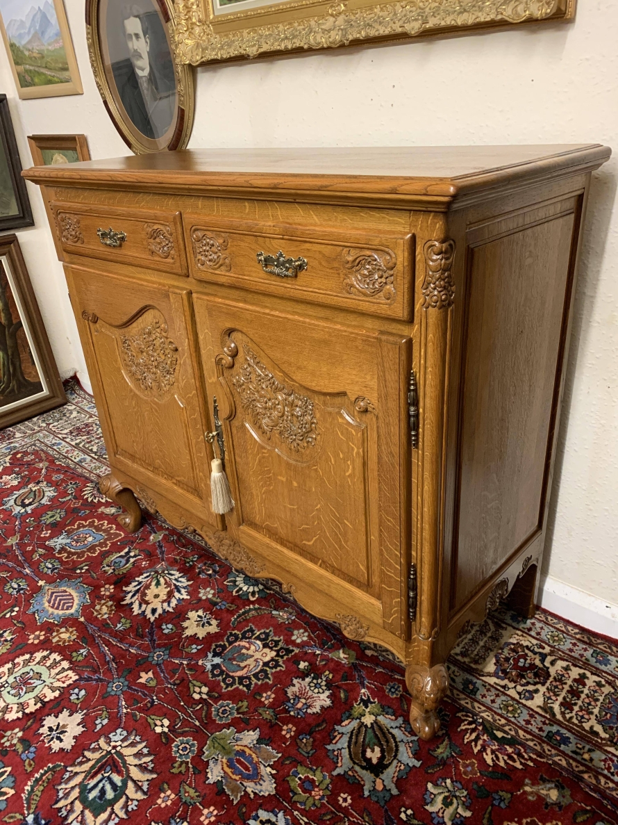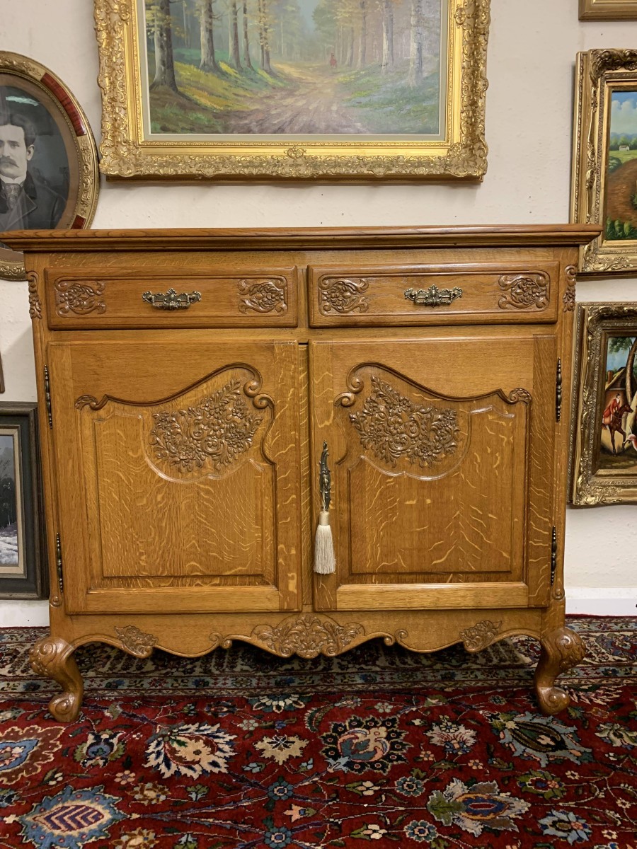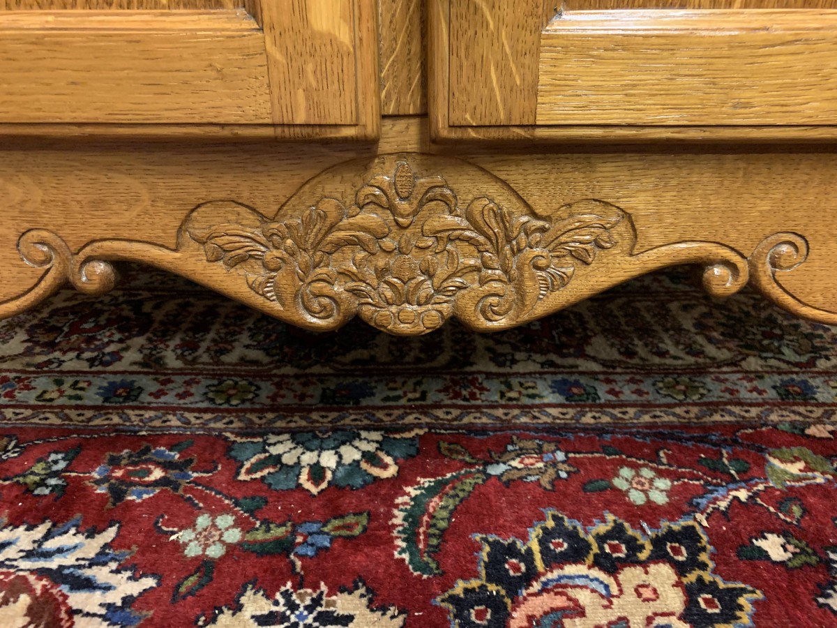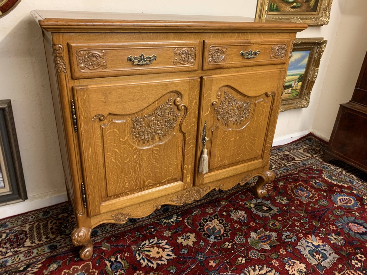 The oversailing top sits above a pair of carved recessed panelled drawers, each drawer having a decorative brass handle. Below are a pair of shaped carved recessed panelled lockable doors, each door having brass hinges. The doors open to reveal a removable shelf. Recessed panelled sides, shaped carved skirt this beautiful French cupboard stands on two elegant carved cabriole shaped legs.