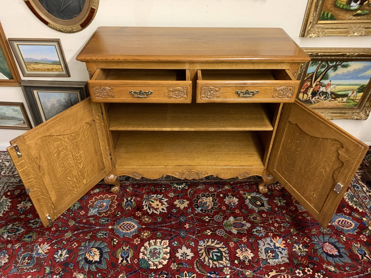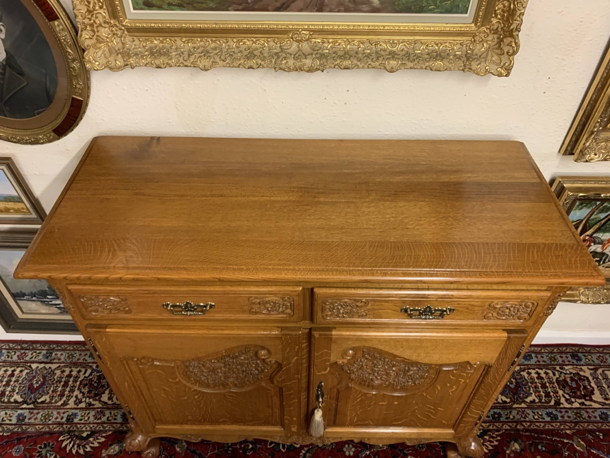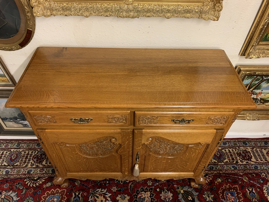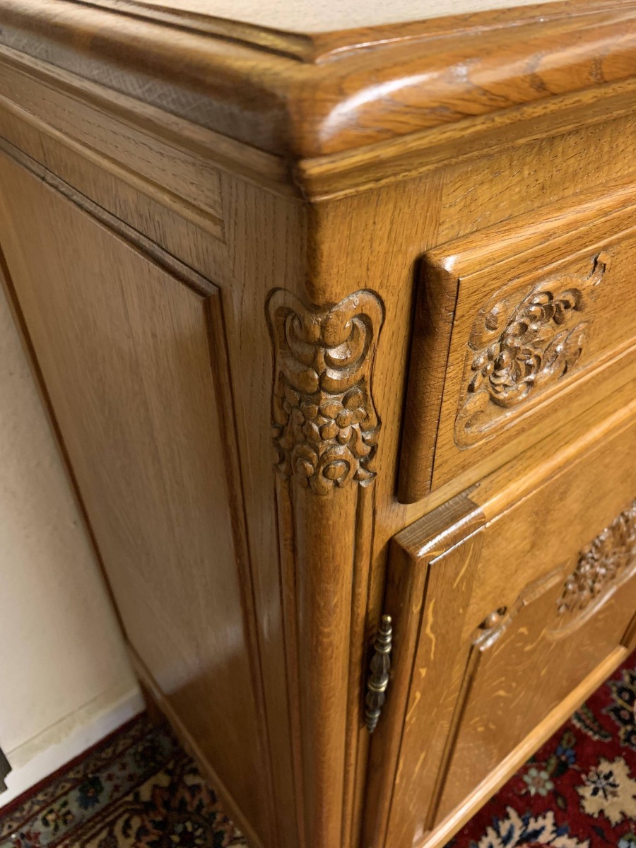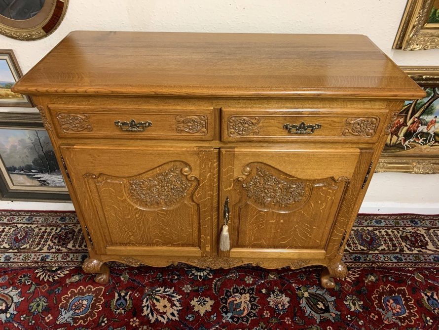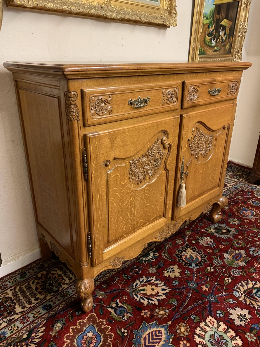 The oversailing top sits above a pair of carved recessed panelled drawers, each drawer having a decorative brass handle. Below are a pair of shaped carved recessed panelled lockable doors, each door having brass hinges. The doors open to reveal a removable shelf. Recessed panelled sides, shaped carved skirt this beautiful French cupboard stands on two elegant carved cabriole shaped legs.