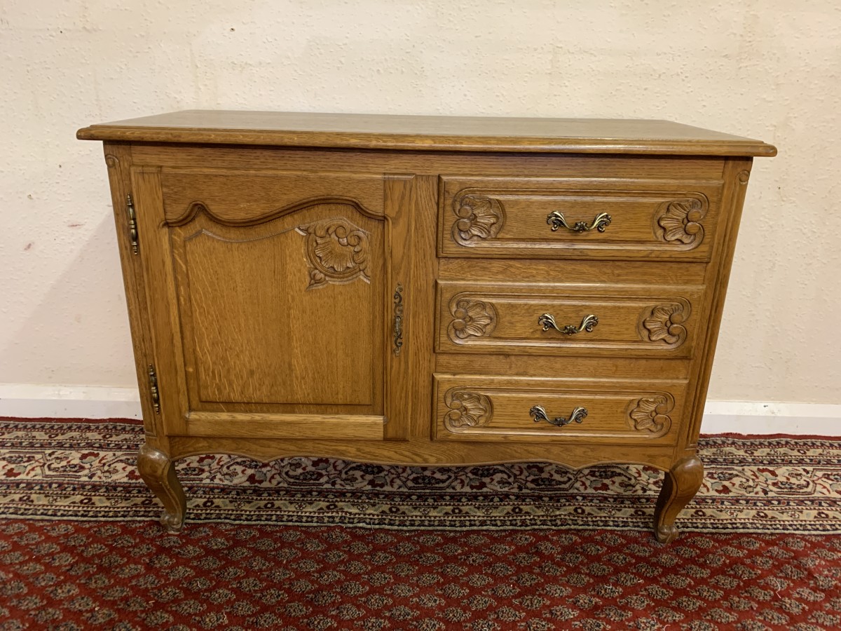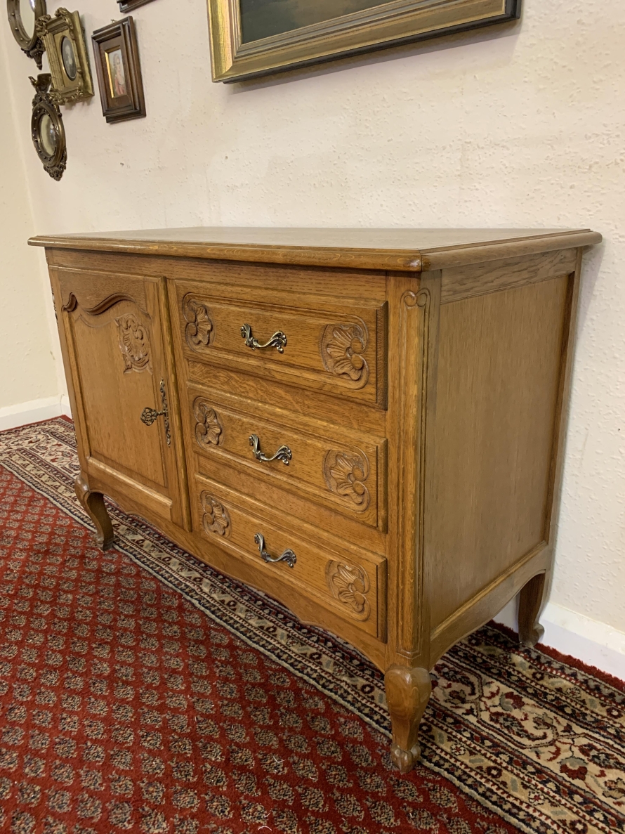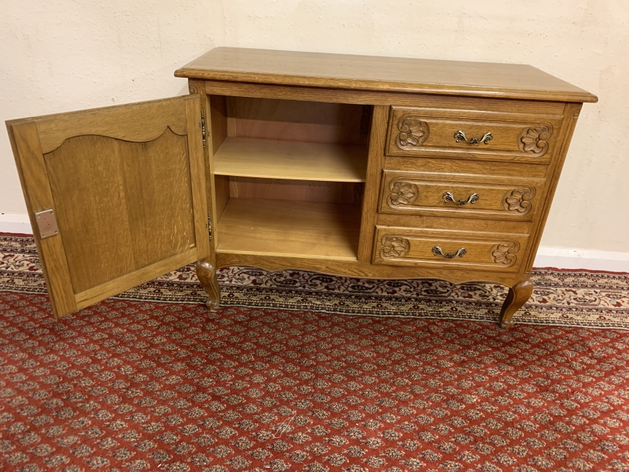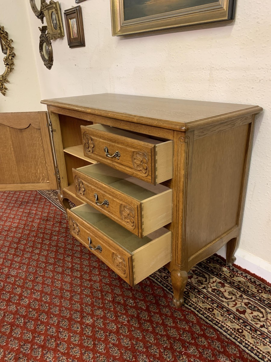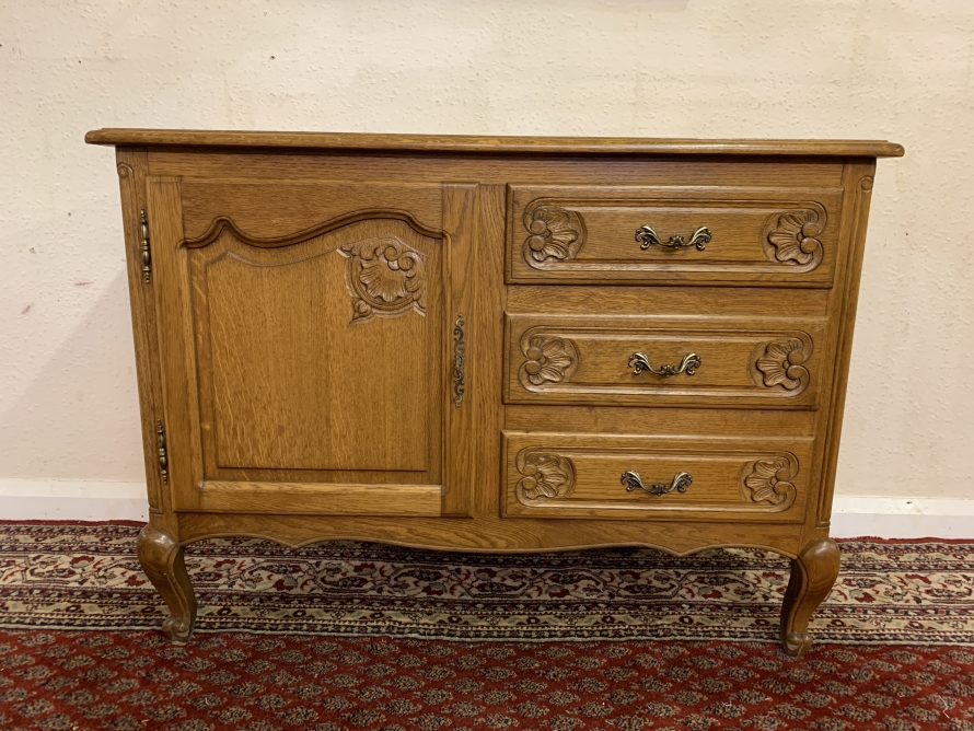 The oversailing top having rounded corners to the front. Lockable carved recessed panelled door opens to reveal a removable shelf. Three carved drawers, each drawer having an ornate brass handle. Recessed panelled sides and standing on carved cabriole legs.